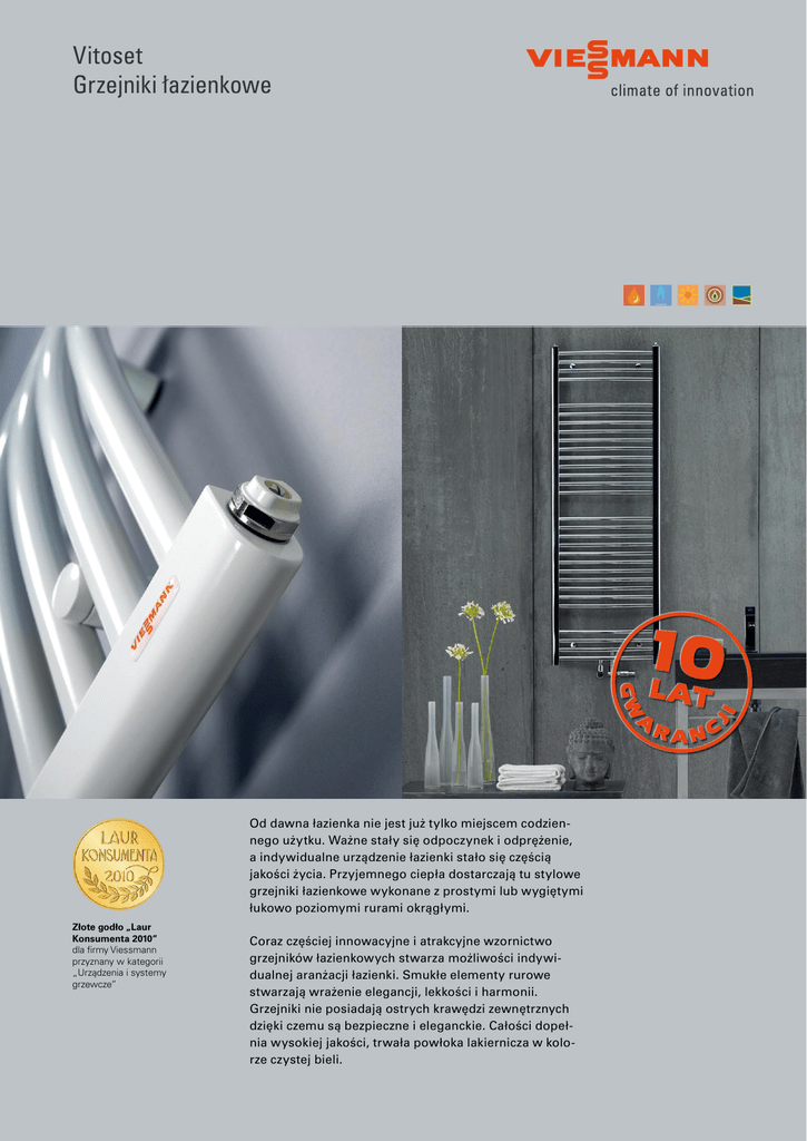 Vitoset Grzejniki łazienkowe Od dawna łazienka nie jest już tylko miejscem codzien nego użytku. Ważne stały się odpoczynek i odprężenie, a indywidualne urządzenie łazienki stało się częścią jakości życia. Przyjemnego ciepła dostarczają tu stylowe grzejniki łazienkowe wykonane z prostymi lub wygiętymi łukowo poziomymi rurami okrągłymi. Złote godło „Laur Konsumenta 2010” dla firmy Viessmann przyznany w kategorii „Urządzenia i systemy grzewcze” Coraz częściej innowacyjne i atrakcyjne wzornictwo grzejników łazienkowych stwarza możliwości indywi dualnej aranżacji łazienki. Smukłe elementy rurowe stwarzają wrażenie elegancji, lekkości i harmonii. Grzejniki nie posiadają ostrych krawędzi zewnętrznych dzięki czemu są bezpieczne i eleganckie. Całości dopeł nia wysokiej jakości, trwała powłoka lakiernicza w kolo rze czystej bieli. Vitoset Grzejniki łazienkowe Viessmann sp. z o.o. ul. Karkonoska 65 53-015 Wrocław tel. 71/ 36 07 100 Infolinia: 801 0801 24 www.viessmann.pl Grzejniki łazienkowe z programu Vitoset nie tylko zapewniają przyjemne ciepło, ale również stanowią miły dla oka element wyposażenia wnętrz. Ich prosta, filigranowa konstrukcja ze smukłymi elementami rurowymi nadaje im elegancki i lekki wygląd doskonale harmonizujący z wnętrzami łazienek. Grzejniki łazienkowe firmy Viessmann bardzo dobrze komponują się z wnętrzem Już od dawna łazienka nie jest traktowana tylko jako pomieszczenie użytkowe, indywidualny jej wystrój stał się częścią jakości życia. Grzejnik łazienkowy jest nieodzownym elementem tego wystroju służąc do ogrzewania i do suszenia ręczników. Grzejniki łazienkowe firmy Viessmann o wysokiej wydajności cieplnej i neutralnym wyglądzie nadają się równie dobrze do pomieszczeń mieszkalnych, jak i biurowych. Głowice termostatyczne firmy Viessmann łączą w sobie doskonałą funkcjonalność z atrakcyjnym wyglądem. Dlatego dają możliwość ciekawego połączenia termostatu z nowoczesnymi grzejnikami łazienkowymi stanowiąc jednocześnie elegancki dodatek nawet w najbardziej wyszukanym i oryginalnym wnętrzu łazienki. Głowice termostatyczne Viessmann SH Diamant to nowoczesne produkty, które na długi czas zadbają o idealną temperaturę przy optymalnym zużyciu energii. Przegląd zalet Grzejnik łazienkowy z prostymi (PD) lub łukowymi (PDT) rurami poziomymi (∅ 23 mm). Głowice termostatyczne firmy Viessmann zapewniają dokładną regulację komfortowego klimatu pomieszczenia Szeroka gama typów i rozmiarów grzejników łazienkowych pozwala dobrać odpowiedni grzejnik do wymagań inwestora 10 lat gwarancji producenta. Grzejniki łazienkowe Standard/Typ Kolor Prosty/PD Łukowy/PDT Łukowy/PDT (z przył. środkowym) biały lub chrom biały biały Temperatura robocza do maks. 120°C, nadciśnienie robocze do 11,5 bar Głębokość konstrukcyjna mm 60 60 60 Długości konstrukcyjne mm 500 lub 600 493 lub 595 493 Szeroka gama wymiarów systemowych – wysokość od 786 do 1868 mm oraz szerokość od 493 do 600 mm. Wysokości konstrukcyjne mm Moc cieplna dla temp.system. 90/70°C kW Półokrągły profil boczny – elegancki i bezpieczny bez ostrych krawędzi. Wygoda montażu dzięki stabilnym wspornikom ściennym o zakresie regulacji 8 mm. Zapraszamy do odwiedzenia naszej strony internetowej www.viessmann.pl, gdzie możecie Państwo zapoznać się z pełną ofertą systemów grzewczych oraz złożyć zapytanie ofertowe. W odpowiedzi otrzymacie Państwo poradę techniczną wraz z ofertą cenową. Średnica przyłącza 786, 1226, 1466, 1868 od 442 do 1201 od 472 do 1230 od 363 do 1 035 G ½" G ½" G ½" Twój Fachowy Doradca: Zmiany techniczne zastrzeżone PL 02/2010 Grzejnik z powłoką lakierniczą wg DIN 55900 w kolorze białym RAL 9016 lub w wykonaniu chromowanym.