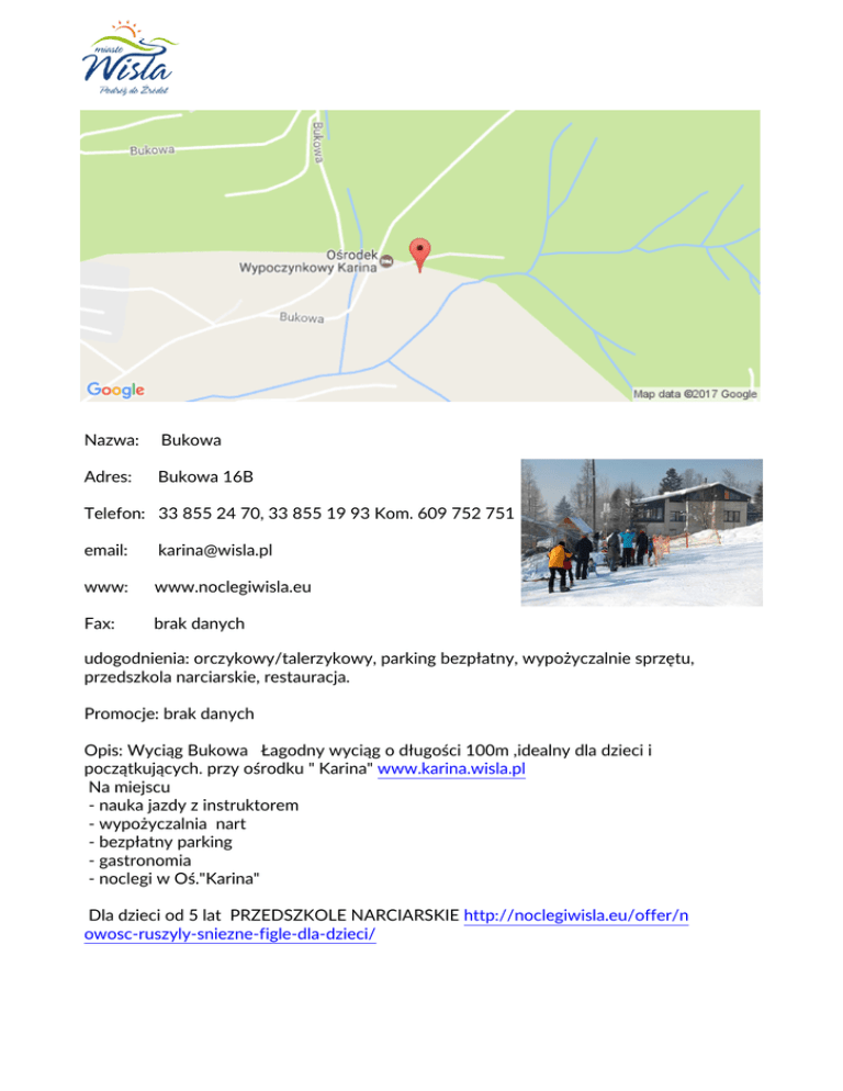 Nazwa: Bukowa Adres: Bukowa 16B Telefon: 33 855 24 70, 33 855 19 93 Kom. 609 752 751 email: [email protected] www: www.noclegiwisla.eu Fax: brak danych udogodnienia: orczykowy/talerzykowy, parking bezpłatny, wypożyczalnie sprzętu, przedszkola narciarskie, restauracja. Promocje: brak danych Opis: Wyciąg Bukowa Łagodny wyciąg o długości 100m ,idealny dla dzieci i początkujących. przy ośrodku " Karina" www.karina.wisla.pl Na miejscu - nauka jazdy z instruktorem - wypożyczalnia nart - bezpłatny parking - gastronomia - noclegi w Oś."Karina" Dla dzieci od 5 lat PRZEDSZKOLE NARCIARSKIE http://noclegiwisla.eu/offer/n owosc-ruszyly-sniezne-figle-dla-dzieci/