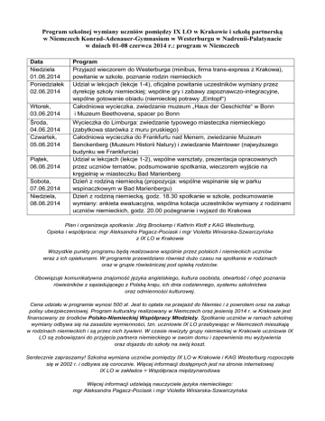 Program szkolnej wymiany uczniów pomiędzy IX LO w Krakowie i szkołą partnerską w Niemczech Konrad-Adenauer-Gymnasium w Westerburgu w Nadrenii-Palatynacie w dniach 01-08 czerwca 2014 r.: program w Niemczech Data Niedziela 01.06.2014 Poniedziałek 02.06.2014 Wtorek, 03.06.2014 Środa, 04.06.2014 Czwartek, 05.06.2014 Piątek, 06.06.2014 Sobota, 07.06.2014 Niedziela, 08.06.2014 Program Przyjazd wieczorem do Westerburga (minibus, firma trans-express z Krakowa), powitanie w szkole, poznanie rodzin niemieckich Udział w lekcjach (lekcje 1-4), oficjalne powitanie uczestników wymiany przez dyrekcję szkoły niemieckiej; wspólne gry i zabawy zapoznawczo-integracyjne, wspólne gotowanie obiadu (niemieckiej potrawy „Eintopf“) Całodniowa wycieczka, zwiedzanie muzeum „Haus der Geschichte“ w Bonn i Muzeum Beethovena, spacer po Bonn Wycieczka do Limburga: zwiedzanie typowego miasteczka niemieckiego (zabytkowa starówka z muru pruskiego) Całodniowa wycieczka do Frankfurtu nad Menem, zwiedzanie Muzeum Senckenberg (Muzeum Historii Natury) i zwiedzanie Maintower (najwyższego budynku we Frankfurcie) Udział w lekcjach (lekcje 1-2), wspólne warsztaty, prezentacja opracowanych przez uczniów tematów, podsumowanie spotkania, wieczorem wyjście na kręgielnię w miasteczku Bad Marienberg Dzień z rodziną niemiecką (propozycja: wspólne wspinanie się w parku wspinaczkowym w Bad Marienbergu) Dzień z rodziną niemiecką, godz. 18.30 spotkanie w szkole, podsumowanie wymiany: ankieta ewaluacyjna, wspólna kolacja uczestników wymiany z rodzinami uczniów niemieckich, godz. 20.00 pożegnanie i wyjazd do Krakowa Plan i organizacja spotkania: Jörg Brockamp i Kathrin Kloft z KAG Westerburg, Opieka i współpraca: mgr Aleksandra Pagacz-Pociask i mgr Violetta Winiarska-Szwarczyńska z IX LO w Krakowie Wszystkie punkty programu będą realizowane wspólnie przez polskich i niemieckich uczniów wraz z ich opiekunami. W programie przewidziano również dużo czasu na spotkania w rodzinach oraz w grupie rówieśniczej pod opieką rodziców. Obowiązuje komunikatywna znajomość języka angielskiego, kultura osobista, otwartość i chęć poznania rówieśników z sąsiadującego z Polską kraju, ich dnia codziennego, systemu szkolnictwa oraz odmienności kulturowej. Cena udziału w programie wynosi 500 zł. Jest to opłata na przejazd do Niemiec i z powrotem oraz na zakup polisy ubezpieczeniowej. Program kulturalny realizowany w Niemczech oraz jesienią 2014 r. w Krakowie jest finansowany ze środków Polsko-Niemieckiej Współpracy Młodzieży. Spotkanie uczniów w ramach szkolnej wymiany odbywa się na zasadzie wymienności, tzn. uczniowie IX LO przebywając w Niemczech mieszkają w rodzinach niemieckich i są przez nich żywieni. W czasie rewizyty grupy niemieckiej w Krakowie uczniowie IX LO są zobowiązani do przyjęcia partnera niemieckiego w swoim domu i zapewnienia mu wyżywienia oraz dojazdu do szkoły na swój koszt. Serdecznie zapraszamy! Szkolna wymiana uczniów pomiędzy IX LO w Krakowie i KAG Westerburg rozpoczęła się w 2002 r. i odbywa się corocznie. Więcej informacji dostępnych jest na stronie internetowej IX LO w zakładce > Współpraca międzynarodowa Więcej informacji udzielają nauczyciele języka niemieckiego: mgr Aleksandra Pagacz-Pociask i mgr Violetta Winiarska-Szwarczyńska