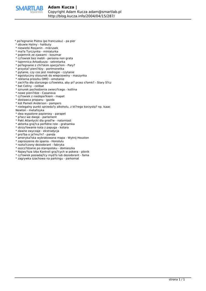 Adam Kucza | Copyright Adam Kucza [email protected] http://blog.kucza.info/2004/04/15/287/ * po?egnanie Piotra (po francusku) - pa pier * obuwie Haliny - halibuty * niewielki Rosjanin - mikrusek * ma?a Turczynka - miniaturka * pojemnik ze zjawami - koszmar * cz?owiek bez mebli - persona non grata * tajemnica Arkadiusza - sekretarka * po?egnanie z chi?skim specja?em - Pary? * przysta? pieni?dzy - portmonetka * pytanie, czy cos jest niedrogie - czytanie * egoistyczny stosunek do wieprzowiny - maszynka * reklama proszku OMO - omotanie * zach?ta dla starszego cz?owieka, aby pi? przez s?omk? - Stary S?cz * bat Celiny - celibat * sznurek pochodzenia zwierz?cego - kotlina * nowe pieni?dze - Casanova * cz?owiek z niedopa?kiem - mapet * dostawca propanu - gazda * kot Pameli Anderson - pampers * nielegalny punkt sprzeda?y alkoholu, z kt?rego korzysta? np. Isaac Newton - metafizyka * dwa wypalone papierosy - parapet * p?acz we dwoje - parlament * Pakt Atlantycki dla grod?w - natomiast * aktorka graj?ca perfidne role - grahamka * skrzy?owanie kota z papuga - kotara * dawne zwyczaje - ekstradycja * pro?ba o ja?mu?n? - panda * ameryka?ska wybrakowana mapa - Wytnij Houston * zaproszenie do spania - Honolulu * rozta?czony dezodorant - fabryka * oszcz?dzanie po staropolsku - domieszka * Najwy?sza Izba Kontroli graj?cych w pokera - piknik * cz?owiek posiadaj?cy myd?o lub dezodorant - fama * zagrywka szachowa na parkingu - parkomat strona 1 / 1