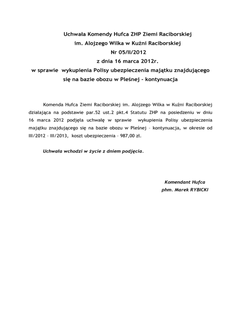 Uchwała Komendy Hufca ZHP Ziemi Raciborskiej im. Alojzego Wilka w Kuźni Raciborskiej Nr 05/II/2012 z dnia 16 marca 2012r. w sprawie wykupienia Polisy ubezpieczenia majątku znajdującego się na bazie obozu w Pleśnej - kontynuacja Komenda Hufca Ziemi Raciborskiej im. Alojzego Wilka w Kuźni Raciborskiej działająca na podstawie par.52 ust.2 pkt.4 Statutu ZHP na posiedzeniu w dniu 16 marca 2012 podjęła uchwałę w sprawie wykupienia Polisy ubezpieczenia majątku znajdującego się na bazie obozu w Pleśnej – kontynuacja, w okresie od III/2012 – III/2013, koszt ubezpieczenia – 987,00 zł. Uchwała wchodzi w życie z dniem podjęcia. Komendant Hufca phm. Marek RYBICKI