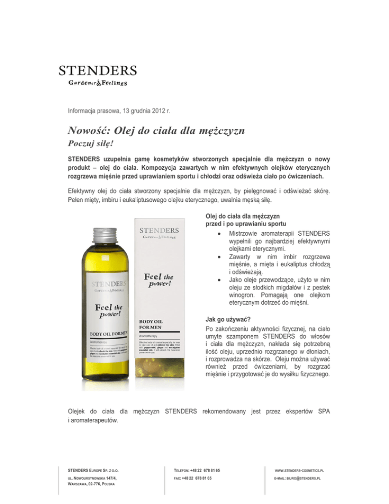 Informacja prasowa, 13 grudnia 2012 r. Nowość: Olej do ciała dla mężczyzn Poczuj siłę! STENDERS uzupełnia gamę kosmetyków stworzonych specjalnie dla mężczyzn o nowy produkt – olej do ciała. Kompozycja zawartych w nim efektywnych olejków eterycznych rozgrzewa mięśnie przed uprawianiem sportu i chłodzi oraz odświeża ciało po ćwiczeniach. Efektywny olej do ciała stworzony specjalnie dla mężczyzn, by pielęgnować i odświeżać skórę. Pełen mięty, imbiru i eukaliptusowego olejku eterycznego, uwalnia męską siłę. Olej do ciała dla mężczyzn przed i po uprawianiu sportu Mistrzowie aromaterapii STENDERS wypełnili go najbardziej efektywnymi olejkami eterycznymi. Zawarty w nim imbir rozgrzewa mięśnie, a mięta i eukaliptus chłodzą i odświeżają. Jako oleje przewodzące, użyto w nim oleju ze słodkich migdałów i z pestek winogron. Pomagają one olejkom eterycznym dotrzeć do mięśni. Jak go używać? Po zakończeniu aktywności fizycznej, na ciało umyte szamponem STENDERS do włosów i ciała dla mężczyzn, nakłada się potrzebną ilość oleju, uprzednio rozgrzanego w dłoniach, i rozprowadza na skórze. Oleju można używać również przed ćwiczeniami, by rozgrzać mięśnie i przygotować je do wysiłku fizycznego. Olejek do ciała dla mężczyzn STENDERS rekomendowany jest przez ekspertów SPA i aromaterapeutów. STENDERS EUROPE SP. Z O.O. TELEFON: +48 22 678 81 65 WWW.STENDERS-COSMETICS.PL UL. NOWOURSYNOWSKA 147/4, FAX: +48 22 E-MAIL: [email protected] WARSZAWA, 02-776, POLSKA 678 81 65 Efekty składników i uczucia, których dostarczają Wiele olejków eterycznych używanych jest od lat, by pomóc przygotować mięśnie do sportowych aktywności i zaopiekować się nimi po wysiłku fizycznym. Olejki stymulują obieg krwi w warstwie podskórnej, wspierając w ten sposób przepływ krwi bogatej w tlen do komórek i eliminują toksyny. Trzy główne olejki eteryczne (lecz nie jedyne) zawarte w nowym oleju do ciała dla mężczyzn: Olejek eteryczny Efekt Ten olejek przyjemnie odświeża I chłodzi skórę. Ożywczy I doskonale znany aromat daje energię i przynosi odświeżenie. Mięta Imbir Rozgrzewa mięśnie przed aktywnością sportową. Łagodzi bole mięśni I stawów. Silny, ostry zapach z nutą pieprzu i cytrusów ożywia i pobudza cię. Uspakaja i odświeża skórę.. Łagodzi ból napiętych mięśni. Czysty I świeży aromat przynosi uczucie ulgi. Eukaliptus Olej dla mężczyzna dostępny jest od grudnia w sklepach Stenders (adresy sklepów na stronie internetowej) oraz w sklepie on-line na www.stenders-cosmetics.pl Cena: 52,90 zł / 250 g *** STENDERS to ogrodnik uczuć. Pochodzi z północnej Europy, gdzie czerpiąc z roślin i kwiatów, tworzy nowatorskie, unikalne kosmetyki inspirowane naturą. Każdy powstały w ten sposób produkt wprowadza naturę w miejski tryb życia. STENDERS sprawia, że dzień rozkwita, a oczy błyszczą. Nasyca uczuciami wszystko wokół – Ciebie, Twoją łazienkę, Twoją ulicę oraz ludzi, którzy Cię otaczają. STENDERS to zespół kreatywnych, radosnych i twórczych osób, zafascynowanych wyjątkowymi kosmetykami – zdrowszymi, bogatszymi i pełnymi doznań. Uczucia uchwyciliśmy w blisko 300 unikalnych produktach kosmetycznych, które mieszkają w 190 butikach na całym świecie. W Polsce STENDERS obecny jest od 2003 roku. Posiada 7 sklepów firmowych w takich miastach jak: Warszawa, Kraków, Poznań, Katowice oraz Łódź. Więcej informacji: Joanna Kukla Marketing & PR Manager STENDERS Europe Sp. z o.o. tel. +48 600 213 001 e-mail: [email protected]