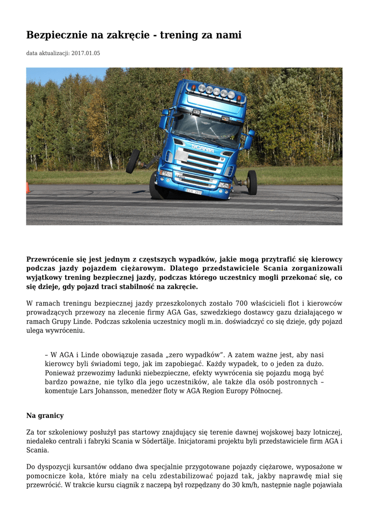 Bezpiecznie na zakręcie - trening za nami data aktualizacji: 2017.01.05 Przewrócenie się jest jednym z częstszych wypadków, jakie mogą przytrafić się kierowcy podczas jazdy pojazdem ciężarowym. Dlatego przedstawiciele Scania zorganizowali wyjątkowy trening bezpiecznej jazdy, podczas którego uczestnicy mogli przekonać się, co się dzieje, gdy pojazd traci stabilność na zakręcie. W ramach treningu bezpiecznej jazdy przeszkolonych zostało 700 właścicieli flot i kierowców prowadzących przewozy na zlecenie firmy AGA Gas, szwedzkiego dostawcy gazu działającego w ramach Grupy Linde. Podczas szkolenia uczestnicy mogli m.in. doświadczyć co się dzieje, gdy pojazd ulega wywróceniu. – W AGA i Linde obowiązuje zasada „zero wypadków”. A zatem ważne jest, aby nasi kierowcy byli świadomi tego, jak im zapobiegać. Każdy wypadek, to o jeden za dużo. Ponieważ przewozimy ładunki niebezpieczne, efekty wywrócenia się pojazdu mogą być bardzo poważne, nie tylko dla jego uczestników, ale także dla osób postronnych – komentuje Lars Johansson, menedżer floty w AGA Region Europy Północnej. Na granicy Za tor szkoleniowy posłużył pas startowy znajdujący się terenie dawnej wojskowej bazy lotniczej, niedaleko centrali i fabryki Scania w Södertälje. Inicjatorami projektu byli przedstawiciele firm AGA i Scania. Do dyspozycji kursantów oddano dwa specjalnie przygotowane pojazdy ciężarowe, wyposażone w pomocnicze koła, które miały na celu zdestabilizować pojazd tak, jakby naprawdę miał się przewrócić. W trakcie kursu ciągnik z naczepą był rozpędzany do 30 km/h, następnie nagle pojawiała się przed nim przeszkoda, którą kierowca musiał ominąć wykonując gwałtowny skręt. – Odczuć na własnej skórze, gdy pojazd się przewraca, to naprawdę otrzeźwiające przeżycie. Musiałem się zmusić, aby przekroczyć granicę bezpieczeństwa, którą zawsze sobie wyznaczam, gdy normalnie prowadzę – mówi kierowca cysterny Tobias Attorps. Środki zapobiegawcze Prawie każde przewrócenie się pojazdu wynika z błędu człowieka: niedostatecznej wiedzy, zmęczenia lub chwilowego braku skupienia. Może ją wywołać również nadmierna prędkość na ostrym zakręcie. Jednak choć wszystko dzieje się wtedy bardzo szybko, wystarczy podjąć kilka prostych kroków, aby zapobiec wypadkowi. – Nasze ćwiczenia odbywają się w kontrolowanych warunkach, w rzeczywistości jednak margines bezpieczeństwa jest znacznie węższy. Naszym celem jest uświadomienie, co tak naprawdę odczuwa się, gdy pojazd się wywraca. Kursanci powinni to wiedzieć, by dzięki temu lepiej rozumieć ryzyko związane z takim wypadkiem – mówi Jörgen Kalénius, trener bezpiecznej jazdy u dilera Scania w Sztokholmie. Źródło: