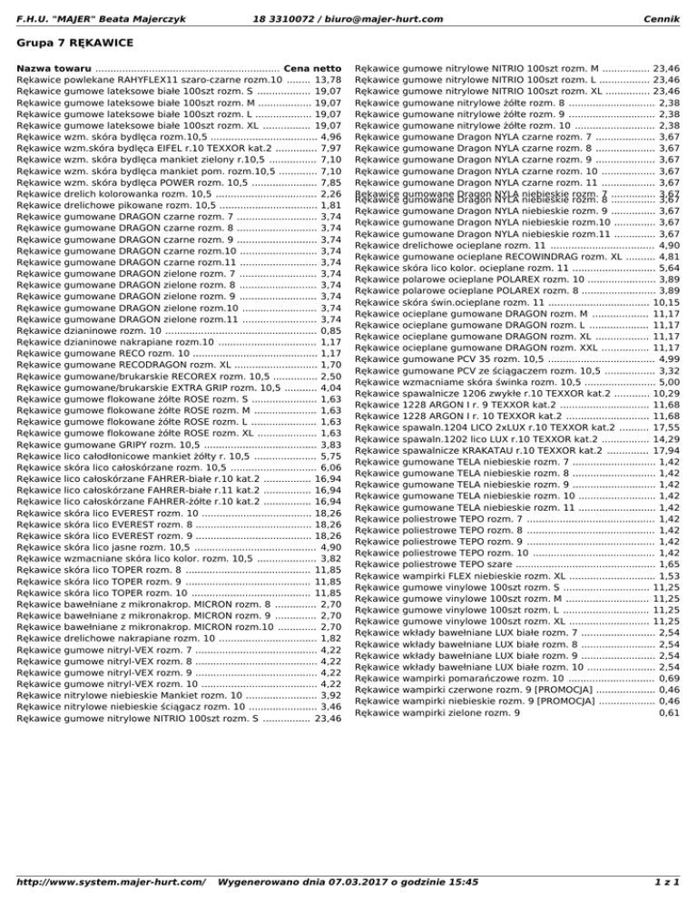 F.H.U. "MAJER" Beata Majerczyk 18 3310072 / [email protected] Cennik Grupa 7 RĘKAWICE Nazwa towaru .............................................................. Cena netto Rękawice powlekane RAHYFLEX11 szaro-czarne rozm.10 ........ 13,78 Rękawice gumowe lateksowe białe 100szt rozm. S .................. 19,07 Rękawice gumowe lateksowe białe 100szt rozm. M .................. 19,07 Rękawice gumowe lateksowe białe 100szt rozm. L ................... 19,07 Rękawice gumowe lateksowe białe 100szt rozm. XL ................ 19,07 Rękawice wzm. skóra bydlęca rozm.10,5 .................................... 4,96 Rękawice wzm.skóra bydlęca EIFEL r.10 TEXXOR kat.2 .............. 7,97 Rękawice wzm. skóra bydlęca mankiet zielony r.10,5 ................ 7,10 Rękawice wzm. skóra bydlęca mankiet pom. rozm.10,5 ............. 7,10 Rękawice wzm. skóra bydlęca POWER rozm. 10,5 ...................... 7,85 Rękawice drelich kolorowanka rozm. 10,5 .................................. 2,26 Rękawice drelichowe pikowane rozm. 10,5 ................................. 1,81 Rękawice gumowane DRAGON czarne rozm. 7 ........................... 3,74 Rękawice gumowane DRAGON czarne rozm. 8 ........................... 3,74 Rękawice gumowane DRAGON czarne rozm. 9 ........................... 3,74 Rękawice gumowane DRAGON czarne rozm.10 .......................... 3,74 Rękawice gumowane DRAGON czarne rozm.11 .......................... 3,74 Rękawice gumowane DRAGON zielone rozm. 7 .......................... 3,74 Rękawice gumowane DRAGON zielone rozm. 8 .......................... 3,74 Rękawice gumowane DRAGON zielone rozm. 9 .......................... 3,74 Rękawice gumowane DRAGON zielone rozm.10 ......................... 3,74 Rękawice gumowane DRAGON zielone rozm.11 ......................... 3,74 Rękawice dzianinowe rozm. 10 ................................................... 0,85 Rękawice dzianinowe nakrapiane rozm.10 ................................. 1,17 Rękawice gumowane RECO rozm. 10 .......................................... 1,17 Rękawice gumowane RECODRAGON rozm. XL ............................ 1,70 Rękawice gumowane/brukarskie RECOREX rozm. 10,5 ............... 2,50 Rękawice gumowane/brukarskie EXTRA GRIP rozm. 10,5 ........... 4,04 Rękawice gumowe flokowane żółte ROSE rozm. S ...................... 1,63 Rękawice gumowe flokowane żółte ROSE rozm. M ..................... 1,63 Rękawice gumowe flokowane żółte ROSE rozm. L ...................... 1,63 Rękawice gumowe flokowane żółte ROSE rozm. XL .................... 1,63 Rękawice gumowane GRIPY rozm. 10,5 ...................................... 3,83 Rękawice lico całodłonicowe mankiet żółty r. 10,5 ..................... 5,75 Rękawice skóra lico całoskórzane rozm. 10,5 ............................. 6,06 Rękawice lico całoskórzane FAHRER-białe r.10 kat.2 ................ 16,94 Rękawice lico całoskórzane FAHRER-białe r.11 kat.2 ................ 16,94 Rękawice lico całoskórzane FAHRER-żółte r.10 kat.2 ................ 16,94 Rękawice skóra lico EVEREST rozm. 10 ..................................... 18,26 Rękawice skóra lico EVEREST rozm. 8 ....................................... 18,26 Rękawice skóra lico EVEREST rozm. 9 ....................................... 18,26 Rękawice skóra lico jasne rozm. 10,5 ......................................... 4,90 Rękawice wzmacniane skóra lico kolor. rozm. 10,5 .................... 3,82 Rękawice skóra lico TOPER rozm. 8 .......................................... 11,85 Rękawice skóra lico TOPER rozm. 9 .......................................... 11,85 Rękawice skóra lico TOPER rozm. 10 ........................................ 11,85 Rękawice bawełniane z mikronakrop. MICRON rozm. 8 .............. 2,70 Rękawice bawełniane z mikronakrop. MICRON rozm. 9 .............. 2,70 Rękawice bawełniane z mikronakrop. MICRON rozm.10 ............. 2,70 Rękawice drelichowe nakrapiane rozm. 10 ................................. 1,82 Rękawice gumowe nitryl-VEX rozm. 7 ......................................... 4,22 Rękawice gumowe nitryl-VEX rozm. 8 ......................................... 4,22 Rękawice gumowe nitryl-VEX rozm. 9 ......................................... 4,22 Rękawice gumowe nitryl-VEX rozm. 10 ....................................... 4,22 Rękawice nitrylowe niebieskie Mankiet rozm. 10 ........................ 3,92 Rękawice nitrylowe niebieskie ściągacz rozm. 10 ....................... 3,46 Rękawice gumowe nitrylowe NITRIO 100szt rozm. S ................ 23,46 http://www.system.majer-hurt.com/ Rękawice Rękawice Rękawice Rękawice Rękawice Rękawice Rękawice Rękawice Rękawice Rękawice Rękawice Rękawice Rękawice Rękawice Rękawice Rękawice Rękawice Rękawice Rękawice Rękawice Rękawice Rękawice Rękawice Rękawice Rękawice Rękawice Rękawice Rękawice Rękawice Rękawice Rękawice Rękawice Rękawice Rękawice Rękawice Rękawice Rękawice Rękawice Rękawice Rękawice Rękawice Rękawice Rękawice Rękawice Rękawice Rękawice Rękawice Rękawice Rękawice Rękawice Rękawice Rękawice Rękawice Rękawice Rękawice Rękawice Rękawice Rękawice gumowe nitrylowe NITRIO 100szt rozm. M ................ 23,46 gumowe nitrylowe NITRIO 100szt rozm. L ................. 23,46 gumowe nitrylowe NITRIO 100szt rozm. XL ............... 23,46 gumowane nitrylowe żółte rozm. 8 ............................. 2,38 gumowane nitrylowe żółte rozm. 9 ............................. 2,38 gumowane nitrylowe żółte rozm. 10 ........................... 2,38 gumowane Dragon NYLA czarne rozm. 7 .................... 3,67 gumowane Dragon NYLA czarne rozm. 8 .................... 3,67 gumowane Dragon NYLA czarne rozm. 9 .................... 3,67 gumowane Dragon NYLA czarne rozm. 10 .................. 3,67 gumowane Dragon NYLA czarne rozm. 11 .................. 3,67 gumowane Dragon NYLA niebieskie rozm. 7 ............... 3,67 gumowane Dragon NYLA niebieskie