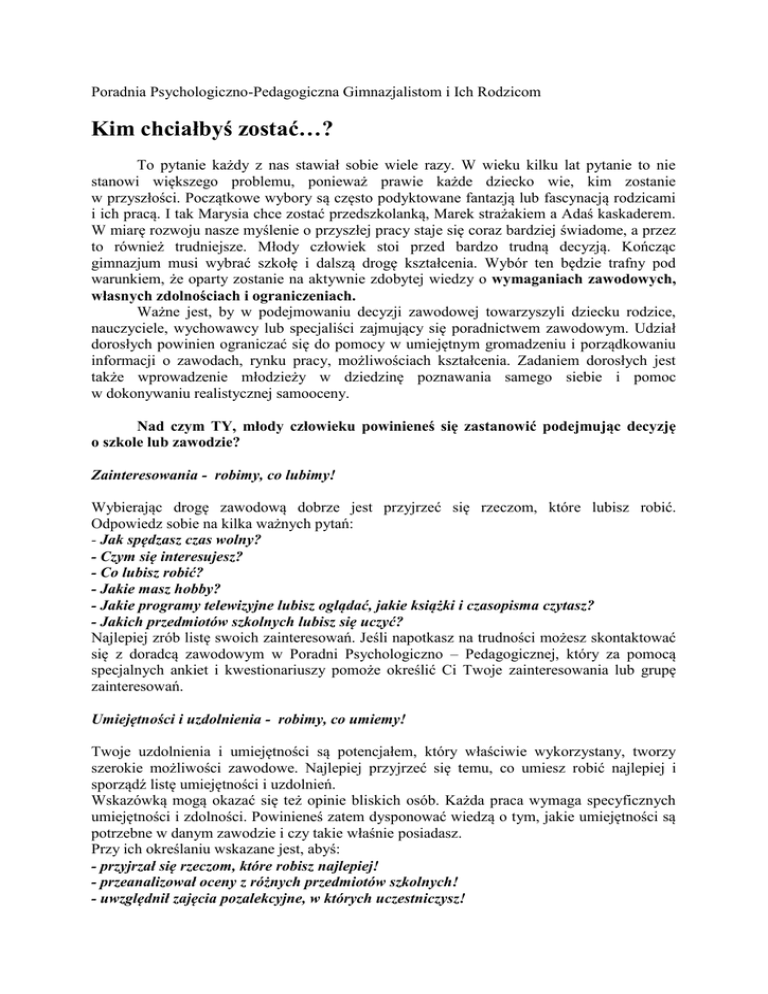 Poradnia Psychologiczno-Pedagogiczna Gimnazjalistom i Ich Rodzicom Kim chciałbyś zostać…? To pytanie każdy z nas stawiał sobie wiele razy. W wieku kilku lat pytanie to nie stanowi większego problemu, ponieważ prawie każde dziecko wie, kim zostanie w przyszłości. Początkowe wybory są często podyktowane fantazją lub fascynacją rodzicami i ich pracą. I tak Marysia chce zostać przedszkolanką, Marek strażakiem a Adaś kaskaderem. W miarę rozwoju nasze myślenie o przyszłej pracy staje się coraz bardziej świadome, a przez to również trudniejsze. Młody człowiek stoi przed bardzo trudną decyzją. Kończąc gimnazjum musi wybrać szkołę i dalszą drogę kształcenia. Wybór ten będzie trafny pod warunkiem, że oparty zostanie na aktywnie zdobytej wiedzy o wymaganiach zawodowych, własnych zdolnościach i ograniczeniach. Ważne jest, by w podejmowaniu decyzji zawodowej towarzyszyli dziecku rodzice, nauczyciele, wychowawcy lub specjaliści zajmujący się poradnictwem zawodowym. Udział dorosłych powinien ograniczać się do pomocy w umiejętnym gromadzeniu i porządkowaniu informacji o zawodach, rynku pracy, możliwościach kształcenia. Zadaniem dorosłych jest także wprowadzenie młodzieży w dziedzinę poznawania samego siebie i pomoc w dokonywaniu realistycznej samooceny. Nad czym TY, młody człowieku powinieneś się zastanowić podejmując decyzję o szkole lub zawodzie? Zainteresowania - robimy, co lubimy! Wybierając drogę zawodową dobrze jest przyjrzeć się rzeczom, które lubisz robić. Odpowiedz sobie na kilka ważnych pytań: - Jak spędzasz czas wolny? - Czym się interesujesz? - Co lubisz robić? - Jakie masz hobby? - Jakie programy telewizyjne lubisz oglądać, jakie książki i czasopisma czytasz? - Jakich przedmiotów szkolnych lubisz się uczyć? Najlepiej zrób listę swoich zainteresowań. Jeśli napotkasz na trudności możesz skontaktować się z doradcą zawodowym w Poradni Psychologiczno – Pedagogicznej, który za pomocą specjalnych ankiet i kwestionariuszy pomoże określić Ci Twoje zainteresowania lub grupę zainteresowań. Umiejętności i uzdolnienia - robimy, co umiemy! Twoje uzdolnienia i umiejętności są potencjałem, który właściwie wykorzystany, tworzy szerokie możliwości zawodowe. Najlepiej przyjrzeć się temu, co umiesz robić najlepiej i sporządź listę umiejętności i uzdolnień. Wskazówką mogą okazać się też opinie bliskich osób. Każda praca wymaga specyficznych umiejętności i zdolności. Powinieneś zatem dysponować wiedzą o tym, jakie umiejętności są potrzebne w danym zawodzie i czy takie właśnie posiadasz. Przy ich określaniu wskazane jest, abyś: - przyjrzał się rzeczom, które robisz najlepiej! - przeanalizował oceny z różnych przedmiotów szkolnych! - uwzględnił zajęcia pozalekcyjne, w których uczestniczysz! Jeśli masz trudności ze sporządzeniem listy umiejętności, możesz odwiedzić Poradnię i wypełnić testy dotyczące osiągnięć szkolnych i zdolności. Sporządzając listy umiejętności i zdolności trzeba pamiętać o kilku rzeczach: Każdy jest inny!– nawet osoby o podobnych umiejętnościach wykorzystują je w różny sposób. Jeśli jesteś w czymś dobry, nie spoczywaj na laurach! – staraj się być coraz lepszy. Przy staraniach o pracę będziesz musiał współzawodniczyć z wieloma kandydatami. Im będziesz lepszy, tym większe masz szanse na zdobycie ciekawej i dobrze płatnej pracy. Pracuj nad zdobywaniem umiejętności w dziedzinach, w których nie jesteś najlepszy! – nigdy nie wiadomo kiedy mogą się przydać najróżniejsze umiejętności. Jeśli matematyka nie jest Twoją mocną stroną nie oznacza to, że nie powinieneś się starać, bo będziesz jej również potrzebował w życiu codziennym (planowanie wydatków, płacenie rachunków itd.). Większość ludzi osiąga lepsze wyniki w dziedzinach, które ich interesują! – jeżeli jesteś dobry w wielu rzeczach, ale w żadnej nie masz szczególnych osiągnięć, możesz posłużyć się przy wyborze zawodu swoimi upodobaniami. Przy podjęciu decyzji dotyczącej dalszego kształcenia należy wziąć również pod uwagę osobowość, temperament, stan zdrowia, ale o tym za dwa tygodnie… Sylwia Minta