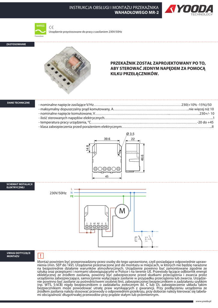 INSTRUKCJA OBSŁUGI I MONTAŻU PRZEKAŹNIKA WAHADŁOWEGO MR-2 Urządzenie przystosowane do pracy z zasilaniem 230V/50Hz ZASTOSOWANIE PRZEKAŹNIK ZOSTAŁ ZAPROJEKTOWANY PO TO, ABY STEROWAĆ JEDNYM NAPĘDEM ZA POMOCĄ KILKU PRZEŁĄCZNIKÓW. DANE TECHNICZNE - nominalne napięcie zasilające V/Hz………………………………………………………………230(+10% -15%)/50 - maksymalny dopuszczalny prąd komutowany, A……………………………………………………...nie więcej niż 10 - nominalne napięcie komutowane, V……………………………………………………..…………………….230+/- 10 - ilość sterowanych napędów elektrycznych……………………………………………………………………………...1 - temperatura pracy urządzenia, °C……………………………………………………………………………-20 do +45 - klasa zabezpieczenia przed porażeniem elektrycznym………………………………………………………………...II SCHEMAT INSTALACJI ELEKTRYCZNEJ 230V/50Hz L N PE M UWAGI DOTYCZĄCE MONTAŻU Montaż powinien być przeprowadzony przez osoby do tego uprawnione, czyli posiadające odpowiednie uprawnienia (min. SEP do 1kV). Urządzenie przeznaczone jest do montażu w miejscach, w których nie będzię narażone na bezpośrednie działanie warunków atmosferycznych. Urządzenie powinno być zamontowane zgodnie ze sztuką oraz przepisami i normami obowiązującymi w Polsce i na terenie UE. Przewody łączące odbiornik energii eklektycznej ze źródłem zasilania, powinny być zabezpieczone przed skutkami przeciążenia i zwarcia przez urządzenia zabezpieczające, samoczynnie wyłączające zasilanie w przypadku przeciążenia lub zwarcia. Urządzenie powinno być zasilane za pośrednictwem osobnej linii, zabezpieczonej bezpiecznikiem o zadziałaniu szybkim (np. WTS, S-kl.B) nigdy bezpiecznikiem o zadziałaniu zwłocznym (kl. C lub D), zabezpieczenie układu takim bezpiecznikiem może powodować utratę praw wynikających z gwarancji. Przy podłączeniu urządzenia ze źródłem zasilania należy stosować przewody o odpowiednim przekroju, przy doborze należy kierować się tabelami obciążalność długotrwałej przewodów przy prądzie stałym lub przemiennym. www.yooda.pl