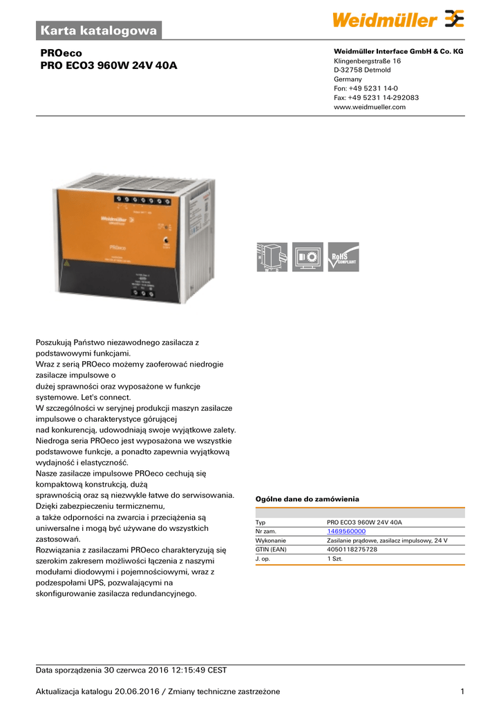 Karta katalogowa PROeco PRO ECO3 960W 24V 40A Weidmüller Interface GmbH & Co. KG Klingenbergstraße 16 D-32758 Detmold Germany Fon: +49 5231 14-0 Fax: +49 5231 14-292083 www.weidmueller.com Poszukują Państwo niezawodnego zasilacza z podstawowymi funkcjami. Wraz z serią PROeco możemy zaoferować niedrogie zasilacze impulsowe o dużej sprawności oraz wyposażone w funkcje systemowe. Let's connect. W szczególności w seryjnej produkcji maszyn zasilacze impulsowe o charakterystyce górującej nad konkurencją, udowodniają swoje wyjątkowe zalety. Niedroga seria PROeco jest wyposażona we wszystkie podstawowe funkcje, a ponadto zapewnia wyjątkową wydajność i elastyczność. Nasze zasilacze impulsowe PROeco cechują się kompaktową konstrukcją, dużą sprawnością oraz są niezwykle łatwe do serwisowania. Dzięki zabezpieczeniu termicznemu, a także odporności na zwarcia i przeciążenia są uniwersalne i mogą być używane do wszystkich zastosowań. Rozwiązania z zasilaczami PROeco charakteryzują się szerokim zakresem możliwości łączenia z naszymi modułami diodowymi i pojemnościowymi, wraz z podzespołami UPS, pozwalającymi na skonfigurowanie zasilacza redundancyjnego. Ogólne dane do zamówienia Typ Nr zam. Wykonanie GTIN (EAN) J. op. PRO ECO3 960W 24V 40A 1469560000 Zasilanie prądowe, zasilacz impulsowy, 24 V 4050118275728 1 Szt. Data sporządzenia 30 czerwca 2016 12:15:49 CEST Aktualizacja katalogu 20.06.2016 / Zmiany techniczne zastrzeżone 1 Karta katalogowa PROeco PRO ECO3 960W 24V 40A Weidmüller Interface GmbH & Co. KG Klingenbergstraße 16 D-32758 Detmold Germany Fon: +49 5231 14-0 Fax: +49 5231 14-292083 www.weidmueller.com Dane techniczne Wymiary i ciężary Szerokość Wysokość Głębokość Waga netto 160 mm 125 mm 120 mm 2 899 g Szerokość (cale) Wysokość (cale) Głębokość (cale) 6,299 inch 4,921 inch 4,724 inch -25 °C...70 °C Temperatura magazynowania -40 °C...85 °C Częstotliwość wejściowa Pobór prądu DC 47...63 Hz 1,37 A @ 800 V DC / 2,37 A @ 450 V DC złącze śrubowe 450...800 V DC (max. 500 V DC według UL508) 6 A / DI, bezpiecznik topikowy 10 A, char. B, bezpiecznik instalacyjny 6...8 A, char, C, bezpiecznik instalacyjny Temperatury Temperatura pracy Wejście Bezpiecznik wejściowy (wewnętrzny) Pobór prądu AC Początkowy prąd rozruchowy Zakres częstotliwości AC Zakres napięć zasilania AC Znamionowe napięcie wejściowe Tak 2,15 A @ 3 x 500 V AC / 2,68 A @ 3 x 400 V AC max. 40 A 47...63 Hz 3 x 320...3 x 575 V AC / 2 x 360...2 x 575 V AC 3 x 400...3 x 500 V AC (wejście szerokopasmowe) Technika przyłączeniowa [wejście] Zakres napięcia wejściowego DC Zalecane zabezpieczenie wstępne Wyjście Ciągły prąd wyjścia przy UWartość znamionowa Możliwość łączenia równoległego Napięcie wyjściowe Ochrona przeciwprzeciążeniowa Technika przyłączeniowa [wyjście] Znamionowe napięcie wyjściowe czas narastania 40 A @ 50 °C, 24 A @ 70 °C tak, maks. 3 22...28 V (ustawiane potencjometrem) Tak złącze śrubowe 24 V DC ± 25 % ≤ 100 ms Moc wyjściowa Napięcie wyjściowe Obciążenie pojemnościowe 960 W 24 V nieograniczony Ochrona przed napięciem zwrotnym Tak Tętnienia resztkowe, wartości szczytowe < 50 mVSS @ 24 V DC, IN włączenia Znamionowy prąd wyjściowy @ Uznam 40 A @ 50 °C Data sporządzenia 30 czerwca 2016 12:15:49 CEST Aktualizacja katalogu 20.06.2016 / Zmiany techniczne zastrzeżone 2 Karta katalogowa PROeco PRO ECO3 960W 24V 40A Weidmüller Interface GmbH & Co. KG Klingenbergstraße 16 D-32758 Detmold Germany Fon: +49 5231 14-0 Fax: +49 5231 14-292083 www.weidmueller.com Dane techniczne Informacje ogólne MTBF Moc tracona, obciążenie znamionowe > 500.000 h wg IEC 1709 (SN29500) 95 W Tak poziomo, na szynę nośną TS 35 90% Zielona dioda LED (Uwyjściowe > 21,6 V DC), Żółta dioda LED (Iwyjściowy > 90% IWartość znamionowa typ. ), Czerwona dioda LED (przeciążenie, przegrzanie, zwarcie, Uwyjściowe < 20,4 V DC) Wersja obudowy metal, odporna na korozję max. dop. wilgotność powietrza (praca) 5 %…95 % RH Ochrona przed nadmierną temperaturą Położenie montażowe, wskazówka montażowa Sprawność Sygnalizacja Moc tracona, bieg jałowy Mostkowanie przy awarii sieci @ Iznam Ochrona przed zwarciem Prąd upłynnościowy doziemny, maks. Stopień ochrony Temperatura pracy Współczynnik mocy (ok.) 5W > 25 ms przy 3 x 500 V AC / > 20 ms przy 3 x 400 V AC Tak 3,5 mA IP20 -25 °C...70 °C > 0,55 @ 3 x 500 V AC / > 0,65 @ 3 x 400 V AC PA52_4 EMV / udar / wibracja Emisja zakłóceń według EN55022 Klasa B Ograniczenie wyższych harmonicznych prądu zgodnie z wymaganiami EN 61000-3-2 Wytrzymałość udarowa IEC 60068-2-2715 g we wszystkich kierunkach Odporność na wibracje IEC 60068-2-6 1 g wg EN50178 Badanie odporności na zakłócenia EN 61000-4-2 (wyład. według elektrostat.), EN 61000-4-3 (sygnały radiowe), EN 61000-4-4 (impulsy), EN 61000-4-5 (przepięcia), EN 61000-4-6 (zaburzenia przewodzone), EN61000-4-8 (Fields), EN61000-4-11 (Dips) Izolacja wyjście napięciowe / uziemienie0,5 kV Napięcie izolacji wejście / wyjście 3 kV Koordynacja izolacji Izolacja wejście napięciowe / uziemienie2 kV Klasa ochrony I, z przyłączem PE Stopień zanieczyszczenia 2 Bezpieczeństwo elektryczne (stosowane normy) Bezpieczna separacja / ochrona przed porażeniem prądem elektrycznym Napięcie bezpieczne Transformatory ochronne do zasilaczy impulsowych VDE0100-410 / wg DIN57100-410 SELV wg EN60950, PELV wg EN60204 IEC61558-2-16 Elektryczne wyposażenie maszyn według EN60204 Ochrona przed niebezpiecznymi prądami upływowymi Wg VDE0106-101 Wyposażenie w elektroniczne środki według EN50178 / eksploatacyjne VDE0160 Data sporządzenia 30 czerwca 2016 12:15:49 CEST Aktualizacja katalogu 20.06.2016 / Zmiany techniczne zastrzeżone 3 Karta katalogowa PROeco PRO ECO3 960W 24V 40A Weidmüller Interface GmbH & Co. KG Klingenbergstraße 16 D-32758 Detmold Germany Fon: +49 5231 14-0 Fax: +49 5231 14-292083 ww