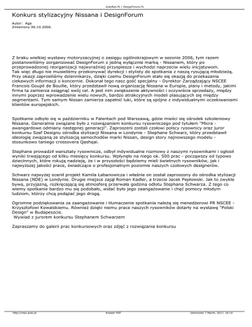 AutoRok.PL / DesignForum.PL Konkurs stylizacyjny Nissana i DesignForum Autor: Aga Zmieniony 06.10.2006. Z braku wielkiej wystawy motoryzacyjnej o zasięgu ogólnokrajowym w sezonie 2006, tym razem postanowiliśmy zorganizować DesignForum z jedną wyłącznie marką - Nissanem, który po przeprowadzonej reorganizacji najwyraźniej przyspiesza i wychodzi naprzeciw wielu inicjatywom. Tak więc długo nie musieliśmy przekonywać dyrekcji i stylisty do spotkania z naszą rysującą młodzieżą. Przy okazji zaprosiliśmy dziennikarzy, dzięki czemu DesignForum stało się okazją do przekazania ciekawych informacji o koncernie. Dokonał tego nasz gość specjalny - Dyrektor Zarządzający NSCEE Francois Goupil de Bouille, który przedstawił nową organizację Nissana w Europie, plany i metody, jakimi firma ta zamierza osiągnąć swój cel. A jest nim zwiększenie aktywności i oczywiście sprzedaży, między innymi poprzez wprowadzenie wielu nowych, bardzo atrakcyjnych modeli plasujących się między segmentami. Tym samym Nissan zamierza zapełnić luki, które są spójne z indywidualnymi oczekiwaniami klientów europejskich. Spotkanie odbyło się w październiku w Falentach pod Warszawą, gdzie mieści się ośrodek szkoleniowy Nissana. Generalnie związane było z rozwiązaniem konkursu rysowniczego pod tytułem "Micra awangardowe odmiany następnej generacji". Zaproszeni zostali czołowi polscy rysownicy oraz juror konkursu Szef Designu ośrodka stylizacji Nissana w Londynie - Stephane Schwarz, który przedstawił ideologię związaną ze stylizacją samochodów marki Nissan, design story najnowszego modelu stosunkowo taniego crossovera Qashqai. Stephane prowadził warsztaty rysownicze, odbył indywidualne rozmowy z naszymi rysownikami i ogłosił wyniki trwającego od kilku miesięcy konkursu. Wpłynęło na niego ok. 500 prac - począwszy od typowo dziecinnych, które rokują nadzieję, że i w przyszłości będziemy mieli świetnych rysowników, jak i najwyższej jakości prace, świadczące o profesjonalnym poziomie naszych czołowych designerów. Schwarz najwyżej ocenił projekt Kamila Łabanowicza i właśnie on został zaproszony do ośrodka stylizacji Nissana (NDE) w Londynie. Drugie miejsce zajął Roman Kadler, a trzecie Jacek Pepłowski. Jak to zwykle bywa, przyjazną, rozkręcającą się atmosferę przerwała godzina odlotu Stephana Schwarza. Z tego co wiemy spotkanie bardzo mu się podobało, widać było jego zaangażowanie i chęć pomocy młodym ludziom, którzy chcą podążać jego drogą. Ogromne podziękowania za zaangażowanie i tłumaczenie spotkania należą się menedżerowi PR NSCEE Krzysztofowi Kowalskiemu. Również dzięki niemu prace naszych rysowników dotarły na wystawę "Polski Design" w Budapeszcie. Wywiad z jurorem konkursu Stephanem Schwarzem Zapraszamy do galerii prac konkursowych oraz zdjęć z rozwiązania konkursu http://mas.auto.pl Kreator PDF Utworzono 7 March, 2017, 16:10