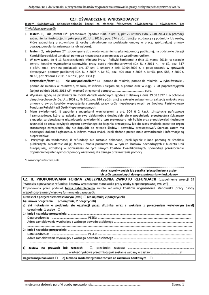 Załącznik nr 1 do Wniosku o przyznanie kosztów wyposażenia stanowiska pracy osoby niepełnosprawnej Wn-W CZ.I. OŚWIADCZENIE WNIOSKODAWCY Jestem świadomy/a odpowiedzialności karnej za złożenie fałszywego oświadczenia i oświadczam, że: (*właściwe zaznaczyć): 1. Jestem □, nie jestem □* pracodawcą (zgodnie z art. 2 ust. 1, pkt 25 ustawy z dn. 20.04.2004 r. o promocji zatrudnienia i instytucjach rynku pracy (Dz.U. z 2013r., poz. 674 z późn. zm.) pracodawcą są podmioty lub osoby, które zatrudniają pracowników tj. osoby zatrudnione na podstawie umowy o pracę, spółdzielczej umowy o pracę, powołania, mianowania lub wyboru). 2. Jestem □, nie jestem □* zobowiązany do zwrotu wcześniej uzyskanej pomocy publicznej, na podstawie decyzji Komisji Europejskiej uznającej pomoc za niezgodną z prawem oraz ze wspólnym rynkiem. 3. W nawiązaniu do § 11 Rozporządzenia Ministra Pracy i Polityki Społecznej z dnia 11 marca 2011r. w sprawie zwrotu kosztów wyposażenia stanowiska pracy osoby niepełnosprawnej (Dz. U. z 2011 r., nr 62, poz. 317 z późn. zm.) oraz na podstawie art. 37 ust. 1 ustawy z dnia 30.04.2004 r. o postępowaniu w sprawach dotyczących pomocy publicznej (Dz. U. z 2007 r. Nr 59, poz. 404 oraz z 2008 r. Nr 93, poz. 585, z 2010 r. Nr 18, poz. 99 oraz z 2011 r. Nr 233, poz. 1381.): otrzymałem/łam* □, nie otrzymałem/łam* □ pomoc de minimis, pomoc de minimis w rybołówstwie , pomoc de minimis w rolnictwie, w roku, w którym ubiegam się o pomoc oraz w ciągu 2 lat poprzedzających (to jest od dnia 01.01.2012 r.)*, wartość otrzymanej pomocy ...................................... euro. 4. Wyrażam zgodę na przetwarzanie moich danych osobowych zgodnie z Ustawą z dnia 29.08.1997 r. o ochronie danych osobowych (Dz. U. z 2002 r., Nr 101, poz. 926 z późn. zm.) w zakresie związanym z realizacją wniosku oraz umowy o zwrot kosztów wyposażenia stanowisk pracy osób niepełnosprawnych ze środków Państwowego Funduszu Rehabilitacji Osób Niepełnosprawnych. 5. Mam świadomość, iż zgodnie z przepisami wynikającymi z art. 304 § 2 k.p.k. „Instytucje państwowe i samorządowe, które w związku ze swą działalnością dowiedziały się o popełnieniu przestępstwa ściganego z urzędu, są obowiązane niezwłocznie zawiadomić o tym prokuratora lub Policję oraz przedsięwziąć niezbędne czynności do czasu przybycia organu powołanego do ścigania przestępstw lub do czasu wydania przez ten organ stosownego zarządzenia, aby nie dopuścić do zatarcia śladów i dowodów przestępstwa”. Starosta zatem ma obowiązek dokonać zgłoszenia, o którym mowa wyżej, jeżeli złożone przeze mnie oświadczenia i informacje są nieprawdziwe. 6. Przyjmuje do wiadomości, iż refundacja nie zostanie dokonana, jeżeli łącznie z inna pomocą ze środków publicznych, niezależnie od jej formy i źródła pochodzenia, w tym ze środków pochodzących z budżetu Unii Europejskiej, udzieloną w odniesieniu do tych samych kosztów kwalifikowanych, spowoduje przekroczenie dopuszczalnej intensywności pomocy określonej dla danego przekroczenia pomocy. *- zaznaczyć właściwe pole .................................................................................................... data i czytelny podpis lub parafka i pieczęć imienna osoby lub osób uprawnionych do reprezentowania wnioskodawcy CZ. II. PROPONOWANA FORMA ZABEZPIECZENIA ZWROTU REFUNDACJI (uzupełnienie pozycji 29 "Wniosku o przyznanie refundacji kosztów wyposażenia stanowiska pracy osoby niepełnosprawnej Wn-W") Proponowana przez podmiot forma zabezpieczenia zwrotu refundacji kosztów wyposażenia stanowiska pracy osoby niepełnosprawnej /właściwą formę należy zaznaczyć/: a) weksel z poręczeniem wekslowym (aval) □ (co najmniej 2 poręczycieli) b) umowa poręczenia □ (co najmniej 2 poręczycieli) c) akt notarialny o poddaniu się egzekucji przez dłużnika wraz z wekslem z poręczeniem wekslowym (aval) co najmniej 1 osoby □ 1) Imię i nazwisko poręczyciela: ………………………………………………………….……………………….…..………................................................ Data urodzenia: ……………………...............…… PESEL: ............................................................................................................... Adres zameldowania wynikający z ważnego dowodu osobistego ….………………………..………….…………............................……….... ………............................................................................................................................................................................................ 2) Imię i nazwisko poręczyciela: ………………………………………………………………….……………………….…..…….......................................... Data urodzenia: ……………………...............…… PESEL: ………........................................................................................................ Adres zameldowania wynikający z ważnego dowodu osobistego …………..………………………..……………............................……….... ................................................................................................................................................................................................. c) zastaw na prawach lub rzeczach □, przedmiot zastawu …………….………………………………….………………………… ……………………….…………………………, wartość rynkowa przedmiotu jaki zostanie wydany w zastaw ……………………….….…..zł d) gwarancja bankowa □ e) blokada środków zgromadzonych na rachunku bankowym miejsce na złożenie parafki osoby uprawnionej:…………………………………………………… □ Strona 1 Załącznik nr 1 do Wn