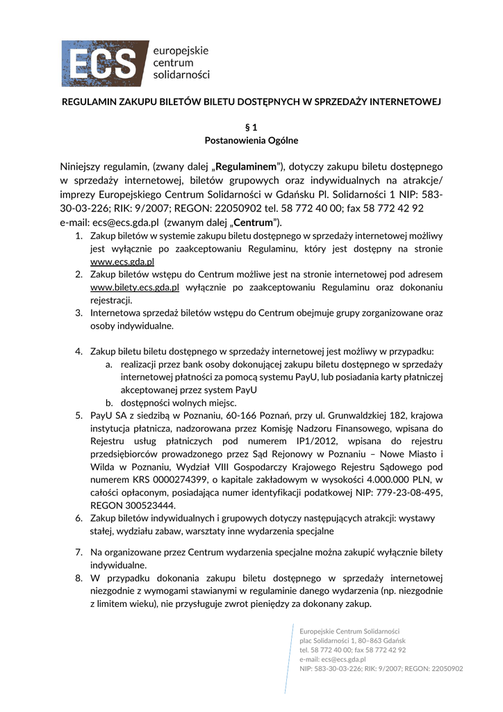 REGULAMIN ZAKUPU BILETÓW BILETU DOSTĘPNYCH W SPRZEDAŻY INTERNETOWEJ §1 Postanowienia Ogólne Niniejszy regulamin, (zwany dalej „Regulaminem”), dotyczy zakupu biletu dostępnego w sprzedaży internetowej, biletów grupowych oraz indywidualnych na atrakcje/ imprezy Europejskiego Centrum Solidarności w Gdańsku Pl. Solidarności 1 NIP: 58330-03-226; RIK: 9/2007; REGON: 22050902 tel. 58 772 40 00; fax 58 772 42 92 e-mail: [email protected] (zwanym dalej „Centrum”). 1. Zakup biletów w systemie zakupu biletu dostępnego w sprzedaży internetowej możliwy jest wyłącznie po zaakceptowaniu Regulaminu, który jest dostępny na stronie www.ecs.gda.pl 2. Zakup biletów wstępu do Centrum możliwe jest na stronie internetowej pod adresem www.bilety.ecs.gda.pl wyłącznie po zaakceptowaniu Regulaminu oraz dokonaniu rejestracji. 3. Internetowa sprzedaż biletów wstępu do Centrum obejmuje grupy zorganizowane oraz osoby indywidualne. 4. Zakup biletu biletu dostępnego w sprzedaży internetowej jest możliwy w przypadku: a. realizacji przez bank osoby dokonującej zakupu biletu dostępnego w sprzedaży internetowej płatności za pomocą systemu PayU, lub posiadania karty płatniczej akceptowanej przez system PayU b. dostępności wolnych miejsc. 5. PayU SA z siedzibą w Poznaniu, 60-166 Poznań, przy ul. Grunwaldzkiej 182, krajowa instytucja płatnicza, nadzorowana przez Komisję Nadzoru Finansowego, wpisana do Rejestru usług płatniczych pod numerem IP1/2012, wpisana do rejestru przedsiębiorców prowadzonego przez Sąd Rejonowy w Poznaniu – Nowe Miasto i Wilda w Poznaniu, Wydział VIII Gospodarczy Krajowego Rejestru Sądowego pod numerem KRS 0000274399, o kapitale zakładowym w wysokości 4.000.000 PLN, w całości opłaconym, posiadająca numer identyfikacji podatkowej NIP: 779-23-08-495, REGON 300523444. 6. Zakup biletów indywidualnych i grupowych dotyczy następujących atrakcji: wystawy stałej, wydziału zabaw, warsztaty inne wydarzenia specjalne 7. Na organizowane przez Centrum wydarzenia specjalne można zakupić wyłącznie bilety indywidualne. 8. W przypadku dokonania zakupu biletu dostępnego w sprzedaży internetowej niezgodnie z wymogami stawianymi w regulaminie danego wydarzenia (np. niezgodnie z limitem wieku), nie przysługuje zwrot pieniędzy za dokonany zakup. Europejskie Centrum Solidarności plac Solidarności 1, 80–863 Gdańsk tel. 58 772 40 00; fax 58 772 42 92 e-mail: [email protected] NIP: 583-30-03-226; RIK: 9/2007; REGON: 22050902 9. Sposób odbioru biletów na inne wydarzenia zostanie każdorazowo określony w regulaminie danego wydarzenia. 10. Kupujący w celu internetowego zakupu biletów, o których mowa w Regulaminie musi posiadać infrastrukturę techniczną i system informatyczny pozwalający na korzystanie z zasobów Internetu, konta e-mail oraz przeglądarki zasobów internetowych umożliwiającej wyświetlanie stron WWW. Zaleca się stosowanie najbardziej aktualnej wersji jednej z następujących przeglądarek, z włączoną opcją „cookies” (obsługa plików cookies), Java Script i SSL: Microsoft Internet Explorer, Opera, Mozilla Firefox, Safari, Google Chrome. 11. Usługa płatności elektronicznej za bilety realizowana jest nieodpłatnie. §2 Zakup biletów w sprzedaży internetowej 1. Każdy internetowy zakup wymaga uiszczenia opłaty poprzez dokonanie transakcji za pośrednictwem PAYU, w wysokości odpowiadającej pełnej kwocie wartości biletów oraz uprzedniej rejestracji. 2. Przy internetowym zakupie biletów należy dokonać wyboru rodzaju biletu oraz dnia i godziny wizyty w Centrum (w przypadku biletów grupowych) oraz na Wydziału Zabaw, następnie w formularzu należy wpisać wymagane dane: imię, nazwisko osoby rezerwującej lub pełną nazwę nabywcy, adres e-mail, odpowiedni rodzaj i liczbę biletów z dostępnych kategorii cenowych. W celu otrzymania faktury VAT trzeba zaznaczyć opcję ”Z Fakturą” oraz wskazać niezbędne dane do wystawienia faktury VAT: imię nazwisko lub nazwę nabywcy; adres (miejscowość, kod pocztowy, ulica); numer NIP. 3. Opłata za zakup biletów biletu dostępnego w sprzedaży internetowej dokonywana jest za pomocą systemu PayU. Przed dokonaniem płatności należy na stronach zakupu biletu dostępnego w sprzedaży internetowej sprawdzić, czy system obsługuje bank, z którego będzie wykonywana transakcja zapłaty. 4. W celu skutecznego zakończenia zakupu biletu dostępnego w sprzedaży internetowej, należy w ciągu 15 minut od chwili wybrania biletu w Centrum, dokonać płatności. Po tym czasie zarezerwowane bilety wrócą do ogólnej puli. 5. W ciągu 24 godzin od chwili zakończenia zakupu zgodnie z ustępem powyższym, system wyśle na podany adres skrzynki pocztowej wiadomość e-mail z potwierdzeniem zakupu biletu dostępnego w sprzedaży internetowej. Europejskie Centrum Solidarności plac Solidarności 1, 80–863 Gdańsk tel. 58 772 40 00; fax 58 772 42 92 e-mail: [email protected] NIP: 583-30-03-226; RIK: 9/2007; REGON: 22050902 6. Zgodnie z ustawą z dnia 29 sierpnia 1997 r. o ochronie danych osobowych (tekst jednolity Dz. U. z 2002 r. Nr 101, poz. 926, ze zm.) osoba podająca dane do formularza wyraża zgodę na przetwarzanie jej danych osobowych przez Hydropolis wyłącznie dla potrzeb prowadzenia rezerwacji biletów i ich sprzedaży. 7. W przypadku wystąpienia błędów systemu, po upływie czasu przeznaczonego na zarezerwowanie biletów, anulowania lub odrzucenia płatności, jak również jej potwierdzenia należy postępować zgodnie z komunikatami pojawiającymi się w serwisie zakupu biletu dostępnego w sprzedaży internetowej lub w wygenerowanych automatycznie e-mailach. 8. Do zwrotu zakupionych biletów stosuje się zasady określone w regulaminach właściwych atrakcji/imprez. 9. Reklamacje należy zgłaszać na adres [email protected]. Europejskie Centrum Solidarności plac Solidarności 1, 80–863 Gdańsk tel. 58 772 40 00; fax 58 772 42 92 e-mail: [email prot