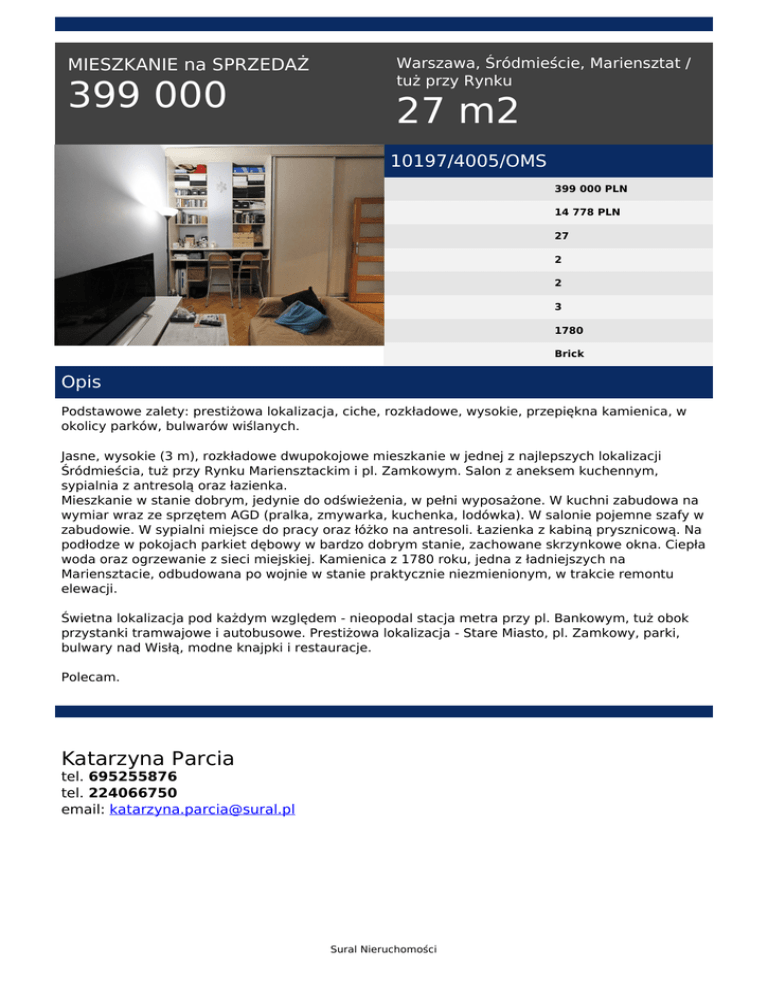 MIESZKANIE na SPRZEDAŻ 399 000 Warszawa, Śródmieście, Mariensztat / tuż przy Rynku 27 m2 10197/4005/OMS 399 000 PLN 14 778 PLN 27 2 2 3 1780 Brick Opis Podstawowe zalety: prestiżowa lokalizacja, ciche, rozkładowe, wysokie, przepiękna kamienica, w okolicy parków, bulwarów wiślanych. Jasne, wysokie (3 m), rozkładowe dwupokojowe mieszkanie w jednej z najlepszych lokalizacji Śródmieścia, tuż przy Rynku Mariensztackim i pl. Zamkowym. Salon z aneksem kuchennym, sypialnia z antresolą oraz łazienka. Mieszkanie w stanie dobrym, jedynie do odświeżenia, w pełni wyposażone. W kuchni zabudowa na wymiar wraz ze sprzętem AGD (pralka, zmywarka, kuchenka, lodówka). W salonie pojemne szafy w zabudowie. W sypialni miejsce do pracy oraz łóżko na antresoli. Łazienka z kabiną prysznicową. Na podłodze w pokojach parkiet dębowy w bardzo dobrym stanie, zachowane skrzynkowe okna. Ciepła woda oraz ogrzewanie z sieci miejskiej. Kamienica z 1780 roku, jedna z ładniejszych na Mariensztacie, odbudowana po wojnie w stanie praktycznie niezmienionym, w trakcie remontu elewacji. Świetna lokalizacja pod każdym względem - nieopodal stacja metra przy pl. Bankowym, tuż obok przystanki tramwajowe i autobusowe. Prestiżowa lokalizacja - Stare Miasto, pl. Zamkowy, parki, bulwary nad Wisłą, modne knajpki i restauracje. Polecam. Katarzyna Parcia tel. 695255876 tel. 224066750 email: [email protected] Sural Nieruchomości Powered by TCPDF (www.tcpdf.org)