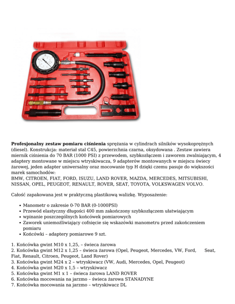 Profesjonalny zestaw pomiaru ciśnienia sprężania w cylindrach silników wysokoprężnych (diesel). Konstrukcja: materiał stal C45, powierzchnia czarna, oksydowana . Zestaw zawiera miernik ciśnienia do 70 BAR (1000 PSI) z przewodem, szybkozłączem i zaworem zwalniającym, 4 adaptery montowane w miejscu wtryskiwacza, 9 adapterów montowanych w miejscu świecy żarowej, jeden adapter uniwersalny oraz mocowanie typ H dzięki czemu pasuje do większości marek samochodów: BMW, CITROEN, FIAT, FORD, ISUZU, LAND ROVER, MAZDA, MERCEDES, MITSUBISHI, NISSAN, OPEL, PEUGEOT, RENAULT, ROVER, SEAT, TOYOTA, VOLKSWAGEN VOLVO. Całość zapakowana jest w praktyczną plastikową walizkę. Wyposażenie: Manometr o zakresie 0-70 BAR (0-1000PSI) Przewód elastyczny długości 400 mm zakończony szybkozłączem ułatwiającym wpinanie poszczególnych końcówek pomiarowych Zaworek uniemożliwiający cofnięcie się wskazówki manometru przed zakończeniem pomiaru Końcówki – adaptery pomiarowe 9 szt. 1. Końcówka gwint M10 x 1,25, – świeca żarowa 2. Końcówka gwint M12 x 1,25 – świeca żarowa (Opel, Peugeot, Mercedes, VW, Ford, Fiat, Renault, Citroen, Peugeot, Land Rover) 3. Końcówka gwint M24 x 2 – wtryskiwacz (VW, Audi, Mercedes, Opel, Peugeot) 4. Końcówka gwint M20 x 1,5 – wtryskiwacz 5. Końcówka gwint M1 x 1 – świeca żarowa LAND ROVER 6. Końcówka mocowania na jarzmo – świeca żarowa STANADYNE 7. Końcówka mocowania na jarzmo – wtryskiwacz DL Seat, 8. Końcówka gwint M10 x 1,25 – świeca żarowa długa 9. Końcówka pomiarowa M14 x 1,25 – świeca żarowa Belka pomocnicza do końcówek mocowanych przez jarzmo Adapter kolankowy z szybkozłączką Mocowanie typu H Plastikowa walizka zapewniająca bezpieczny transport i przechowywanie próbnika.