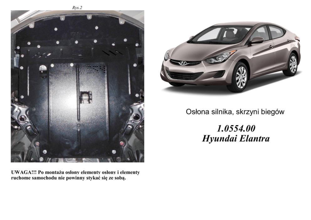 Rys.2 Osłona silnika, skrzyni biegów 1.0554.00 Hyundai Elantra UWAGA!!! Po montażu osłony elementy osłony i elementy ruchome samochodu nie powinny stykać się ze sobą. Montaż osłony Osłona 1.0554.00 Stosowanie: Hyundai Kompletność: L.p. Nazwa Płyta Płyta Błotnik Błotnik Śruba Śruba Śruba Podkładka Podkładka Podkładka Listwa Amortyzator 30 Pokrywka 1 2 3 4 5 6 7 8 9 10 11 12 13 Elantra Oznaczenie Liczba 609 608 116 117 М6х18 М8х16 М10х25 А6 А8 А10 024 1 1 1 1 4 11 2 4 26 2 2 3 1 1.0554.00.8.016.065 Schemat montażu osłony Uwagi Z uchwytem 4 1 2 12 6 9 7 10 11 3 6 9 7 10 11 rys.1 1. Zdemontować zwykłą osłonę plastikową. 2. Wprowadzić listwy 11 nad bocznymi otworami belki silnika i włożyć śruby 7, rys.1. 3. Przymocować błotniki 3 i 4 do podłużnic samochodu w zwykłe nakrętki zwykłym mocowaniem, korzystając z podkładek 9. 4. Przymocować płytę 1 do belki chłodnicy na zwykłe nakrętki zwykłym mocowaniem, korzystając z podkładek 9. 5. Wprowadzić płytę 2 od tylnej strony pod śruby 7, od przodu przymocować do płyty 1 śrubami 6 i po bokach do błotników 3 i 4 śrubami 6, rys.2. 6. Dokręcić wszystkie miejsca mocowania. Osłona zakrywa silnik, skrzynię biegów, chłodnicę.