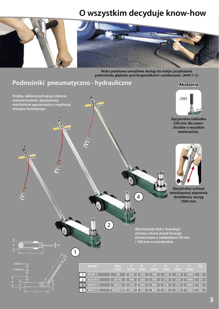 O wszystkim decyduje know-how Niska podstawa umożliwia dostęp do miejsc przyłożenia podnośnika głęboko pod furgonetkami i autobusami. (A4411-C) Podnośniki pneumatyczno - hydrauliczne Akcesoria Krótka, lekka konstrukcja ułatwia manewrowanie. Sprężynowy mechanizm opuszczania z regulacją masywu kotwiącego. 2363 Opcjonalna nakładka 250 mm dla samochodów o wysokim zawieszeniu. Opcjonalny uchwyt teleskopowy zapewnia dodatkowy zasięg 1000 mm. 4 2 E E C F +100mm +100mm B A 1 C +50mm +50mm B Wytrzymały tłok z twardego chromu chroni przed korozją. Dostarczane z nakładkami 50 mm i 100 mm w standardzie. D A C C Model Max (Ton) A (mm) B (mm) C (mm) D (mm) E (mm) F (mm) Kg 1 AV20-C 20 220 350 760 220 310 1400 52 2 A2510-C 25/10 180 365 760 175 310 1400 54 3 A4422-C 44/22 218 440 800 218 310 1400 82 4 A4411-C 44/22/11 150 330 800 150 310 1400 68 F D 5