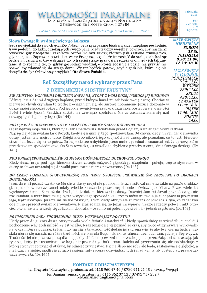 7 sierpnia 2016 WIADOMOŚCI PARAFIALNE XIX Niedziela rok C 34/2016 Parafia Matki Bożej Częstochowskiej w Nottingham 2 Sherwood Rise Nottingham NG7 6JN Polish Catholic Mission in England and Wales Registered Charity 1119423 SłowaEwangeliiwedługŚwiętegoŁukasza Jezuspowiedziałdoswoichuczniów:”Niechbędąprzepasanebiodrawaszeizapalonepochodnie. Awypodobnidoludzi,oczekującychswegopana,kiedyzucztyweselnejpowróci;abymuzaraz otworzyć, gdy nadejdzie i zakołacze. Szczęśliwi owi słudzy, których pan zastanie czuwających, gdynadejdzie.Zaprawdępowiadamwam:Przepaszesięikażeimzasiąśćdostołu,aobchodząc będzieimusługiwał.Czyodrugiej,czyotrzeciejstrażyprzyjdzie,szczęśliwioni,gdyichtakzastanie. A to rozumiejcie, że gdyby gospodarz wiedział, o której godzinie złodziej ma przyjść, nie pozwoliłby włamać się do swego domu. Wy też bądźcie gotowi, gdyż o godzinie, której się nie domyślacie,SynCzłowieczyprzyjdzie”.OtoSłowoPańskie. Ref.SzczęśliwynaródwybranyprzezPana ZDZIENNICZKASIOSTRYFAUSTYNY ŚW.FAUSTYNAWSPOMINADRUGIEGOKAPŁANA,KTÓRYZWOLIBOŻEJPOMÓGŁJEJDUCHOWO Później Jezus dał mi drugiego kapłana, przed którym kazał mi odsłonić swoją duszę. Chociaż w pierwszejchwiliczyniłamtotrochęzociąganiemsię,alesuroweupomnienieJezusadokonałow duszymojejgłębokiejpokory.Podjegokierownictwemszybkoduszamojapostępowaławmiłości Bożej i wiele życzeń Pańskich zostało na zewnątrz spełnione. Nieraz zastanawiałam się nad odwagąigłębiąpokoryjego.(Dz144) MSZES& WIĘTE NIEDZIELNE SOBOTA 18.30 NIEDZIELA 9.30;11.00; 12.30;18.30 MSZEŚWIĘTE WTYGODNIU PONIEDZIAŁEK 9.30;11.00 WTOREK 9.30;11.00 S< RODA 9.30;11.00 CZWARTEK 11.00;18.30 PIĄTEK 11.00.18.30 SOBOTA 14.00 POSTĘPWŻYCIUWEWNĘTRZNYMZALEŻYODPOMOCYSTAŁEGOSPOWIEDNIKA O,jaknędznąmojadusza,któratylełaskzmarnowała.UciekałamprzedBogiem,aOnścigałSwymiłaskami. NajczęściejdoznawałamłaskBożych,kiedysięnajmniejtegospodziewałam.Odchwili,kiedymiPandałkierownika duszy,jestemwierniejszałasce.Dziękikierownikowi,jegoczujnościnadduszą,alepoznałam,cotojest kierowi- ctwoijakJezussięnatopatrzy.ZanajmniejszeuchybienieJezusmnieupominałizaznaczałmi,żesprawy,które przedstawiamspowiednikowi,OnSamrozsądza,-awszelkieuchybienieprzeciwniemu,MnieSamegodosięga.(Dz 145) PODOPIEKĄSPOWIEDNIKAŚW.FAUSTYNADOŚWIADCZYŁADUCHOWEGOPOKOJU Kiedy dusza moja pod jego kierownictwem zaczęła zażywać głębokiego skupienia i pokoju, często słyszałam w duszytesłowa:umacniajsiędowalkiparokrotnienierazpowtórzone.(Dz145) DO CZASU POZNANIA SPOWIEDNIKÓW, PAN JEZUS OSOBIŚCIE PROWADZIŁ ŚW. FAUSTYNĘ PO DROGACH DOSKONAŁOŚCI Jezusdajemipoznaćczęsto,coMusięwduszymojejniepodobainierazstrofowałmniezatakienapozórdrobiazgi, a jednak w rzeczy samej miały wielkie znaczenie, przestrzegał mnie i ćwiczył jak Mistrz. Przez wiele lat wychowywał mnie Sam, aż do chwili, kiedy daŁ mi kierownika duszy. Dawniej Sam mi dawał poznać, czego nie rozumiałam,aterazkażemisiępytaćwszystkiegospowiednikaiczęstomówimitak:aJaciodpowiemprzezusta jego,bądźspokojna.Jeszczemisięniezdarzyło,abymkiedyotrzymałasprzecznaodpowiedźztym,cożądałPan odemnieiprzedstawiłamkierownikowi.Nierazzdarzasię,żeJezusmiwpierwniektórerzeczypolecainiktprzecieżotymniewie,akiedysięzbliżałamdokratki–tosamomipoleciłspowiednik–jednakczęstonie.(Dz145) POUMOCNIENIRADĄSPOWIEDNIKADUSZAWEZWANAJESTDOCZYNU Kiedy przez długi czas dusza otrzymywała wiele światła i natchnień i kiedy spowiednicy zatwierdzili jej spokój i pochodzenieich,jeżelimiłośćjejjestwielka,terazJezusdajejejpoznać,żeczas,abyto,cootrzymywaławprowadziławczyn.Duszapoznaje,żePanliczynanią,atawiadomośćdodajejejsiły,onawie,żeabybyćwiernabędziemusiałanierazsięnarazićnaróżnetrudności,aleonaufaBoguidziękitejufnościdochodzitam,gdziejaBógwzywa. Trudnościjejnieprzerażają,sądlaniejjakbychlebempowszednim–wcalejejnieprzerażają,anizastraszają,jak rycerza, który jest ustawicznie w boju, nie przeraża go huk armat. Daleka od przerażania się, ale nadsłuchuje, z którejstronynieprzyjacielatakuje,byodnieśćzwycięstwo.Nicnaśleponierobi,alebada,zastanawiasięgłęboko,a nieliczącnasiebie,modlisięgorącoizasięgaradyrycerzydoświadczonychimądrych,atakpostępując,prawiezawszezwycięża.(Dz145) KONTAKTZDUSZPASTERZEM ks.KrzysztofKawczyński,proboszcztel.01159604740/07809412145/[email protected] ks.DamianTomczyk,asystenttel.01159623713/07495757232/ [email protected] KANCELARIAPARAFIALNA Wtorek 11.40-13.00i17.00-18.00. Wsprawachpilnychprosimy okontakttelefoniczny SPOWIEDŹŚWIĘTA WniedzielęwczasieMszyśw. WtygodniuprzedMsząśw(ok.20min) Wczwartekwczasieadoracji NajświętszegoSakramentu od19.00do20.00 WAŻNESPOTKANIE Dzisiaj 7 sierpnia 2016 r. (niedziela) po mszy o 12:30 odbędzie się spotkanie informacyjne z przedstawicielem City Council Clive'em Foster'em z wydziału Hate Crime czyli wszelkie przejawy dyskryminacji, nietolerancji, rasizmu wobec obcokrajowców zarównodorosłychjakidzieci.Będziemożnasiędowiedzieć,cotojestHateCrime,jak reagować,gdzieikomuzgłaszaćtakieprzypadki. Spotkanie odbędzie się kościele. Serdeczniezapraszamy. PODZIĘKOWANIE Rodzina Śp. Ryszarda Pieniążka składa naj- serdeczniejszepodziękowanie:Ks.Kamilowi za odprawienie Mszy Św i ceremonii pogrzebowej,Ks.Damianowizasłowapełne otuchy w homilii, Pani Dorocie Popek za uświetnienie tej uroczystości przez śpiew i grę na organach. Przyjaciołom i znajomym zamodlitwęitaklicznyudziałweMszyŚw.i ceremoniipogrzebowej,zaprzesłanekondolencjeiwyrazywspółczuciaorazzadatkina celecharytatywne.Bógzapłać. PODZIĘKOWANIE Dzieci i cała Rodzina + Krystyny Adams pragną serdecznie podziękować księdzu KamilowiZadrożnemuzaodprawienieMszy Świętej pogrzebowej i słowa otuchy i współczucia. Wszystkim Uczestnikom Mszy Świętej pogrzebowej i Pani Maryli Mondszein dziękujemy za piękny śpiew. Dziękujemy również za złożone ofiary na cele ch