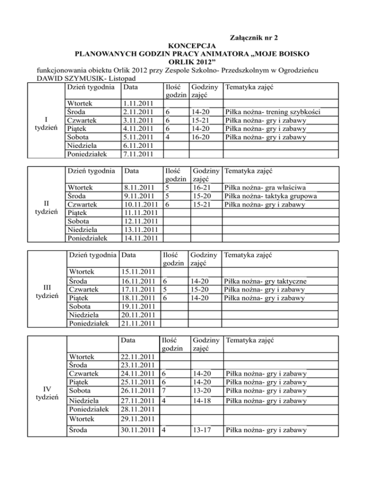 Załącznik nr 2 KONCEPCJA PLANOWANYCH GODZIN PRACY ANIMATORA „MOJE BOISKO ORLIK 2012” funkcjonowania obiektu Orlik 2012 przy Zespole Szkolno- Przedszkolnym w Ogrodzieńcu DAWID SZYMUSIK- Listopad Dzień tygodnia Data Ilość Godziny Tematyka zajęć godzin zajęć Wtortek 1.11.2011 Środa 2.11.2011 6 14-20 Piłka nożna- trening szybkości I Czwartek 3.11.2011 6 15-21 Piłka nożna- gry i zabawy tydzień Piątek 4.11.2011 6 14-20 Piłka nożna- gry i zabawy Sobota 5.11.2011 4 16-20 Piłka nożna- gry i zabawy Niedziela 6.11.2011 Poniedziałek 7.11.2011 Dzień tygodnia II tydzień Wtortek Środa Czwartek Piątek Sobota Niedziela Poniedziałek Data Ilość godzin 8.11.2011 5 9.11.2011 5 10.11.2011 6 11.11.2011 12.11.2011 13.11.2011 14.11.2011 Dzień tygodnia Data III tydzień Wtortek Środa Czwartek Piątek Sobota Niedziela Poniedziałek IV tydzień Tematyka zajęć Piłka nożna- gra właściwa Piłka nożna- taktyka grupowa Piłka nożna- gry i zabawy Ilość Godziny Tematyka zajęć godzin zajęć 15.11.2011 16.11.2011 6 17.11.2011 5 18.11.2011 6 19.11.2011 20.11.2011 21.11.2011 Data Godziny zajęć 16-21 15-20 15-21 14-20 15-20 14-20 Piłka nożna- gry taktyczne Piłka nożna- gry i zabawy Piłka nożna- gry i zabawy Ilość godzin Godziny Tematyka zajęć zajęć Wtortek Środa Czwartek Piątek Sobota Niedziela Poniedziałek Wtortek 22.11.2011 23.11.2011 24.11.2011 25.11.2011 26.11.2011 27.11.2011 28.11.2011 29.11.2011 6 6 7 4 14-20 14-20 13-20 14-18 Piłka nożna- gry i zabawy Piłka nożna- gry i zabawy Piłka nożna- gry i zabawy Piłka nożna- gry i zabawy Środa 30.11.2011 4 13-17 Piłka nożna- gry i zabawy