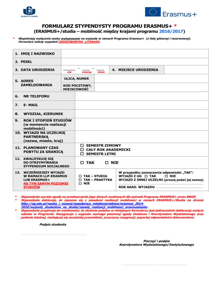 FORMULARZ STYPENDYSTY PROGRAMU ERASMUS+ * (ERASMUS+/studia – mobilność między krajami programu 2016/2017) Wypełniają wyłącznie osoby wytypowane na wyjazdy w ramach Programu Erasmus+ (z listy głównej i rezerwowej). Formularz należy wypełnić DRUKOWANYMI LITERAMI. * 1. IMIĘ I NAZWISKO 2. PESEL 3. DATA URODZENIA 5. ADRES ZAMELDOWANIA 6. NR TELEFONU 7. E- MAIL 8. WYDZIAŁ, KIERUNEK _____ - ___ - ___ rok miesiąc dzień 4. MIEJSCE URODZENIA ULICA, NUMER KOD POCZTOWY, MIEJSCOWOŚĆ 9. ROK I STOPIEŃ STUDIÓW (w momencie realizacji mobilności) 10. WYJAZD NA UCZELNIĘ PARTNERSKĄ (nazwa, miasto, kraj) 11. PLANOWANY CZAS POBYTU ZA GRANICĄ SEMESTR ZIMOWY CAŁY ROK AKADEMICKI SEMESTR LETNI 12. KWALIFIKUJĘ SIĘ DO OTRZYMYWANIA STYPENDIUM SOCJALNEGO TAK 13. WCZEŚNIEJSZY WYJAZD W RAMACH LLP-ERASMUS LUB ERASMUS+ NA TYM SAMYM POZIOMIE STUDIÓW * * * NIE TAK – STUDIA TAK – PRAKTYKA NIE W przypadku zaznaczenia odpowiedzi „TAK”: WYJAZD Z UG TAK NIE WYJAZD Z INNEJ UCZELNI (proszę podać jej nazwę) …………………………………………..…….……………….. ROK AKAD. WYJAZDU …………………..………….……. Stypendysta wyraża zgodę na przetwarzanie jego danych osobowych dla potrzeb Programu ERASMUS+ przez BWZE. Stypendysta deklaruje, że zapozna się z zasadami realizacji mobilności w ramach ERASMUS+/Studia na stronie http://ug.edu.pl/nauka_i_rozwoj/wspolpraca_miedzynarodowa/erasmus_20142020/wyjazdy_studentow_na_studia/zasady_realizacji_mobilnosci_erasmusstudia . Stypendysta przyjmuje do wiadomości, że złożenie podpisu w niniejszym formularzu jest jednocześnie deklaracją wzięcia udziału w Programie. Rezygnacja z wyjazdu wymaga pisemnej zgody Dziekana i Koordynatora Wydziałowego oraz podania istotnej, niedającej się wcześniej przewidzieć, przyczyny rezygnacji, popartej odpowiednimi dokumentami. Podpis studenta ................................................................. Pieczęć i podpis Koordynatora Wydziałowego/Instytutowego .................................................................