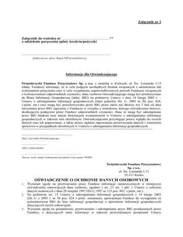 Załącznik nr 3 Załącznik do wniosku nr ……..…………………………..** o udzielenie poręczenia spłaty kredytu/pożyczki ……………………………………………………..……….. (pełna nazwa, adres, Regon/NIP przedsiębiorcy) Informacje dla Oświadczającego Świętokrzyski Fundusz Poręczeniowy Sp. z o.o. z siedzibą w Kielcach, ul. Św. Leonarda 1/13 (dalej: Fundusz) informuje, że w celu podjęcia niezbędnych działań związanych z udzieleniem lub wykonaniem poręczenia oraz w celu wypełnienia usprawiedliwionych potrzeb Funduszu związanych z wykonywaniem odpowiednich czynności, dane osobowe Oświadczającego mogą być przekazywane do Biura Informacji Gospodarczej (dalej: BIG) na podstawie Ustawy z dnia 14 lutego 2003 r. – Ustawy o udostępnianiu informacji gospodarczych (tekst jednolity Dz. U. 2003 nr 50, poz. 424, z późn. zm.) oraz mogą być przechowywane przez BIG przez okres nie dłuższy niż 2 lata od dnia otrzymania przez BIG zapytania z Funduszu w związku z wnioskiem, którego oświadczenie dotyczy, skutkującym podjęciem przez Fundusz odpowiednich czynności. Dane te mogą być udostępniane przez BIG bankom oraz innym Instytucjom wymienionym w Ustawie o udostępnianiu informacji gospodarczych w zakresie tam określonym. Oświadczającemu przysługuje prawo wglądu do swoich danych oraz ich poprawiania, a także prawo żądania zaprzestania przetwarzania danych i wniesienia sprzeciwu w przypadkach określonych w Ustawie o udostępnianiu informacji gospodarczych -------------------------------------------------------------------------------------------------------------------- ....................................................... Imię i nazwisko Oświadczającego ..................................... Adres zamieszkania ……………………………………………………….. Nazwa, seria, numer dokumentu tożsamości oraz numer PESEL Świętokrzyski Fundusz Poręczeniowy Sp. z o.o. ul. Św. Leonarda 1/13 25-311 Kielce OŚWIADCZENIE O OCHRONIE DANYCH OSOBOWYCH Wyrażam zgodę na przetwarzanie przez Fundusz informacji zamieszczonych w niniejszym oświadczeniu stanowiących dane osobowe, zgodnie z art. 23 ust. 1 pkt. 1 Ustawy o ochronie danych osobowych z dnia 29 sierpnia 1997 (Dz.U.1997 nr 133 poz. 883, z późn. zm.). 2. Na podstawie art. 15 Ustawy o udostępnianiu informacji gospodarczych z 14 lutego 2003 (Dz. U. z 2003 r. nr 50 poz. 424 z późn. zmianami), upoważniam Fundusz do wystąpienia za pośrednictwem BIG do biur informacji gospodarczej o ujawnienie informacji gospodarczych dotyczących moich zobowiązań. 3. Wyrażam zgodę na gromadzenie, przetwarzanie i udostępnianie przez BIG przekazanych przez Fundusz, a dotyczących mnie informacji w zakresie przewidzianym przepisami Ustawy 1. o udostępnianiu informacji gospodarczych oraz innych ustaw - powstałych w związku z poręczeniem, którego oświadczenie dotyczy, skutkującym podjęciem przez Fundusz odpowiednich czynności - przez okres nie dłuższy niż 2 lata od dnia otrzymania przez BIG takiej informacji lub zapytania. 4. Oświadczam, że powyższe zgody i upoważnienia zostały udzielone dobrowolnie. Zostałem poinformowany o przysługującym mi, na podstawie art. 24 ust. 1 pkt. 3 Ustawy o ochronie danych osobowych, prawie do wglądu i poprawiania swoich danych osobowych, a także o celu ich zbierania oraz o miejscu ich przechowywania, tj. siedzibie Funduszu (ul. Św. Leonarda 1/13, 25-311 Kielce), siedzibie Biura Informacji Gospodarczej S.A. 5. Oświadczam, że zostałem poinformowany, że zgoda wyrażona w pkt. 4 może zostać przeze mnie odwołana w każdym czasie w formie pisemnego oświadczenia złożonego w Funduszu. …………….., dnia …………..……. ................................................ * niepotrzebne skreślić wypełnia Fundusz ** podpis Oświadczającego
