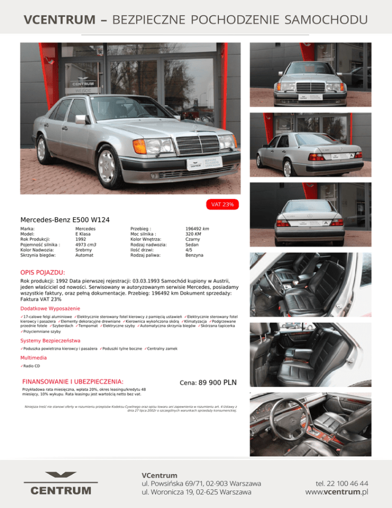 Mercedes-Benz E500 W124 Marka: Model: Rok Produkcji: Pojemność silnika : Kolor Nadwozia: Skrzynia biegów: Mercedes E Klasa 1992 4973 cm3 Srebrny Automat Przebieg : Moc silnika : Kolor Wnętrza: Rodzaj nadwozia: Ilość drzwi: Rodzaj paliwa: 196492 km 320 KM Czarny Sedan 4/5 Benzyna OPIS POJAZDU: Rok produkcji: 1992 Data pierwszej rejestracji: 03.03.1993 Samochód kupiony w Austrii, jeden właściciel od nowości. Serwisowany w autoryzowanym serwisie Mercedes, posiadamy wszystkie faktury, oraz pełną dokumentacje. Przebieg: 196492 km Dokument sprzedaży: Faktura VAT 23% Dodatkowe Wyposażenie ✓17-calowe felgi aluminiowe ✓Elektrycznie sterowany fotel kierowcy z pamięcią ustawień ✓Elektrycznie sterowany fotel kierowcy i pasażera ✓Elementy dekoracyjne drewniane ✓Kierownica wykończona skórą ✓Klimatyzacja ✓Podgrzewane przednie fotele ✓Szyberdach ✓Tempomat ✓Elektryczne szyby ✓Automatyczna skrzynia biegów ✓Skórzana tapicerka ✓Przyciemniane szyby Systemy Bezpieczeństwa ✓Poduszka powietrzna kierowcy i pasażera ✓Poduszki tylne boczne ✓Centralny zamek Multimedia ✓Radio CD FINANSOWANIE I UBEZPIECZENIA: Cena: 89 900 PLN Przykładowa rata miesięczna, wpłata 20%, okres leasingu/kredytu 48 miesięcy, 10% wykupu. Rata leasingu jest wartością netto bez vat. Niniejsza treść nie stanowi oferty w rozumieniu przepisów Kodeksu Cywilnego oraz opisu towaru ani zapewnienia w rozumieniu art. 4 Ustawy z dnia 27 lipca 2002r o szczególnych warunkach sprzedaży konsumenckiej. Powered by TCPDF (www.tcpdf.org)