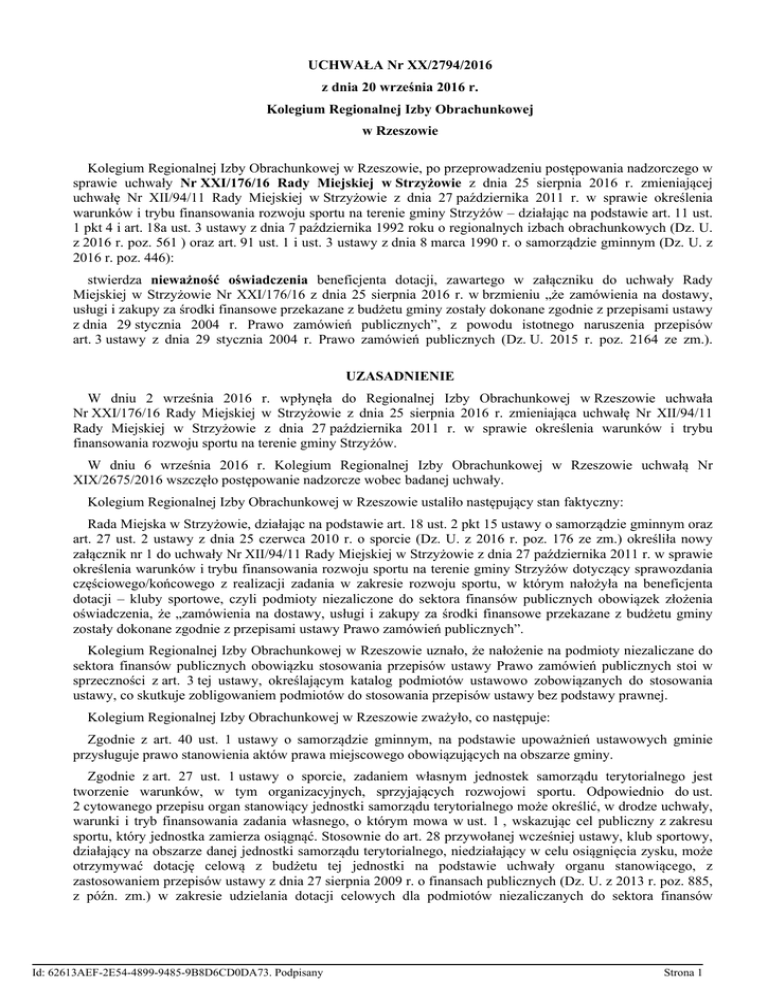 UCHWAŁA Nr XX/2794/2016 z dnia 20 września 2016 r. Kolegium Regionalnej Izby Obrachunkowej w Rzeszowie Kolegium Regionalnej Izby Obrachunkowej w Rzeszowie, po przeprowadzeniu postępowania nadzorczego w sprawie uchwały Nr XXI/176/16 Rady Miejskiej w Strzyżowie z dnia 25 sierpnia 2016 r. zmieniającej uchwałę Nr XII/94/11 Rady Miejskiej w Strzyżowie z dnia 27 października 2011 r. w sprawie określenia warunków i trybu finansowania rozwoju sportu na terenie gminy Strzyżów – działając na podstawie art. 11 ust. 1 pkt 4 i art. 18a ust. 3 ustawy z dnia 7 października 1992 roku o regionalnych izbach obrachunkowych (Dz. U. z 2016 r. poz. 561 ) oraz art. 91 ust. 1 i ust. 3 ustawy z dnia 8 marca 1990 r. o samorządzie gminnym (Dz. U. z 2016 r. poz. 446): stwierdza nieważność oświadczenia beneficjenta dotacji, zawartego w załączniku do uchwały Rady Miejskiej w Strzyżowie Nr XXI/176/16 z dnia 25 sierpnia 2016 r. w brzmieniu „że zamówienia na dostawy, usługi i zakupy za środki finansowe przekazane z budżetu gminy zostały dokonane zgodnie z przepisami ustawy z dnia 29 stycznia 2004 r. Prawo zamówień publicznych”, z powodu istotnego naruszenia przepisów art. 3 ustawy z dnia 29 stycznia 2004 r. Prawo zamówień publicznych (Dz. U. 2015 r. poz. 2164 ze zm.). UZASADNIENIE W dniu 2 września 2016 r. wpłynęła do Regionalnej Izby Obrachunkowej w Rzeszowie uchwała Nr XXI/176/16 Rady Miejskiej w Strzyżowie z dnia 25 sierpnia 2016 r. zmieniająca uchwałę Nr XII/94/11 Rady Miejskiej w Strzyżowie z dnia 27 października 2011 r. w sprawie określenia warunków i trybu finansowania rozwoju sportu na terenie gminy Strzyżów. W dniu 6 września 2016 r. Kolegium Regionalnej Izby Obrachunkowej w Rzeszowie uchwałą Nr XIX/2675/2016 wszczęło postępowanie nadzorcze wobec badanej uchwały. Kolegium Regionalnej Izby Obrachunkowej w Rzeszowie ustaliło następujący stan faktyczny: Rada Miejska w Strzyżowie, działając na podstawie art. 18 ust. 2 pkt 15 ustawy o samorządzie gminnym oraz art. 27 ust. 2 ustawy z dnia 25 czerwca 2010 r. o sporcie (Dz. U. z 2016 r. poz. 176 ze zm.) określiła nowy załącznik nr 1 do uchwały Nr XII/94/11 Rady Miejskiej w Strzyżowie z dnia 27 października 2011 r. w sprawie określenia warunków i trybu finansowania rozwoju sportu na terenie gminy Strzyżów dotyczący sprawozdania częściowego/końcowego z realizacji zadania w zakresie rozwoju sportu, w którym nałożyła na beneficjenta dotacji – kluby sportowe, czyli podmioty niezaliczone do sektora finansów publicznych obowiązek złożenia oświadczenia, że „zamówienia na dostawy, usługi i zakupy za środki finansowe przekazane z budżetu gminy zostały dokonane zgodnie z przepisami ustawy Prawo zamówień publicznych”. Kolegium Regionalnej Izby Obrachunkowej w Rzeszowie uznało, że nałożenie na podmioty niezaliczane do sektora finansów publicznych obowiązku stosowania przepisów ustawy Prawo zamówień publicznych stoi w sprzeczności z art. 3 tej ustawy, określającym katalog podmiotów ustawowo zobowiązanych do stosowania ustawy, co skutkuje zobligowaniem podmiotów do stosowania przepisów ustawy bez podstawy prawnej. Kolegium Regionalnej Izby Obrachunkowej w Rzeszowie zważyło, co następuje: Zgodnie z art. 40 ust. 1 ustawy o samorządzie gminnym, na podstawie upoważnień ustawowych gminie przysługuje prawo stanowienia aktów prawa miejscowego obowiązujących na obszarze gminy. Zgodnie z art. 27 ust. 1 ustawy o sporcie, zadaniem własnym jednostek samorządu terytorialnego jest tworzenie warunków, w tym organizacyjnych, sprzyjających rozwojowi sportu. Odpowiednio do ust. 2 cytowanego przepisu organ stanowiący jednostki samorządu terytorialnego może określić, w drodze uchwały, warunki i tryb finansowania zadania własnego, o którym mowa w ust. 1 , wskazując cel publiczny z zakresu sportu, który jednostka zamierza osiągnąć. Stosownie do art. 28 przywołanej wcześniej ustawy, klub sportowy, działający na obszarze danej jednostki samorządu terytorialnego, niedziałający w celu osiągnięcia zysku, może otrzymywać dotację celową z budżetu tej jednostki na podstawie uchwały organu stanowiącego, z zastosowaniem przepisów ustawy z dnia 27 sierpnia 2009 r. o finansach publicznych (Dz. U. z 2013 r. poz. 885, z późn. zm.) w zakresie udzielania dotacji celowych dla podmiotów niezaliczanych do sektora finansów Id: 62613AEF-2E54-4899-9485-9B8D6CD0DA73. Podpisany Strona 1 publicznych i niedziałających w celu osiągnięcia zysku. Dotacja, o której mowa ma służyć realizacji celu publicznego, z zakresu sportu, który jednostka samorządu zamierza osiągnąć i może być przeznaczona w szczególności na: 1) realizację programów szkolenia sportowego, 2) zakup sprzętu sportowego, 3) pokrycie kosztów organizowania zawodów sportowych lub uczestnictwa w tych zawodach, 4) pokrycie kosztów korzystania z obiektów sportowych dla celów szkolenia sportowego, 5) sfinansowanie stypendiów sportowych i wynagrodzenia kadry szkoleniowej - jeżeli wpłynie to na poprawę warunków uprawiania sportu przez członków klubu sportowego, który otrzyma dotację, lub zwiększy dostępność społeczności lokalnej do działalności sportowej prowadzonej przez ten klub. Zgodnie z art. 3 ustawy Prawo zamówień publicznych ustawę stosuje się do udzielania zamówień publicznych przez: 1) jednostki sektora finansów publicznych w rozumieniu przepisów o finansach publicznych; 2) inne, niż określone w pkt 1, państwowe jednostki organizacyjne nieposiadające osobowości prawnej; 3) inne, niż określone w pkt 1, osoby prawne, utworzone w szczególnym celu zaspokajania potrzeb o charakterze powszechnym niemających charakteru przemysłowego ani handlowego, jeżeli podmioty, o których mowa w tym przepisie oraz w pkt 1 i 2, pojedynczo lub wspólnie, bezpośrednio lub pośrednio przez inny podmiot: a) finansują je w ponad 50% lub b) posiadają ponad połow