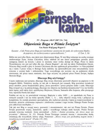 TV - Program z 08.07.2007 (Nr. 744) Objawienie Boga w Piśmie Świętym* Von Pastor Wolf gang Wegert © Kazanie: „Całe Pismo przez Boga jest natchnione i poŜyteczne do nauki, do wykrywania błędów, do poprawy, do wychowywania w sprawiedliwości. " (2 Tym. 3, 16) Biblia nie jest tylko BoŜa, ona takŜe jest objawieniem Boga. W niej Bóg wskazuje na osobę swojego umiłowanego Syna, Jezusa Chrystusa, który odebrał od nas nasze potępiające grzechy przez zastępczą śmierć na krzyŜu i przez to moŜemy mieć wolny dostęp do Boga. Przez to takŜe Wszechmocny nie jest juŜ tylko dla nas „Panem Bogiem”, ale stał się takŜe Niebiańskim Ojcem. Wieczny Bóg zszedł z góry w Jezusie Chrystusie dla nas zgubionych grzeszników i w Nim pojednał się z nami. I przez wiarę w BoŜego Syna staliśmy się sprawiedliwymi oraz otrzymaliśmy Ŝycie wieczne z czystej łaski i miłosierdzia. Tego wszystkiego nie uczymy się na podstawie dzieła stworzenia, ani przez nasze sumienie, lecz tego uczymy się jedynie przez Pismo Święte, będące Słowem Boga. Dlaczego Bóg uŜył księgę? Często zadawane jest pytanie, dlaczego Bóg swoje zbawienie pozwolił objawić na papierze w 66 księgach Biblii. Niektórzy myślą, Ŝe tak jak w dawnych juŜ czasach, Bóg powinien świadczyć przez aniołów, przez bezpośrednie głosy, przez proroków i przez potęŜne znaki i cuda. Dlaczego Bóg związał się z tą jedyną księgą, dlaczego nie objawia się bardziej dynamicznie? Czy nie byłoby duŜo lepiej, jeśli takŜe dziś, mielibyśmy MojŜesza, Eliasza, Samuela albo Izajasza, albo piszącego listy Apostoła Pawła lub Jana? Podoba mi się to, co powiedział wierzący Baptysta z roku 1689: „...to upodobało się Panu w róŜnych czasach i teŜ na róŜne sposoby (Hebr. 1, 1) ... Ŝeby objawić swoją wolę i połączyć ją kompletnie, by została pisemnie sporządzona, aby zachować prawdę i lepiej ja rozpowszechniać w Kościele, przeciw cielesnemu zepsuciu i złośliwości szatana i tego świata. Dlatego Pismo Święte jest całkowicie niezbędne...” Tak jak stoi Bóg w swojej mocy, pewności i niezmienności, tak stoi teŜ Pismo Święte. Pismo Święte przetrwało wojny, katastrofy, epoki i wszelkiego rodzaju ataki krytyki. Pismo Święte posiada wieczną waŜność. Jezus powiedział: „Niebo i Ziemia przeminą, ale słowo moje nie przeminie” (Mateusz 24, 35). Prawda Pisma Świętego zostanie mocną i niezawodną skałą, orientacją dla wszystkich, którzy ufają. PoniewaŜ: „Słowo twoje jest pochodnią nogom moim i światłością ścieŜek moich” (Psalm 119, 105). Arche Gemeinde und Missionswerk ARCHE e.V. Doerriesweg 7 • D-22525 Hamburg (Stellingen) Tel.: +49 (0)40/54 70 50 Fax: +49 (0)40/54 70 52 99 [email protected] • www.arche-gemeinde.de Bankverbindungen Ev. Darlehensgenossenschaft eG Kiel • Konto-Nr. 113522 • BLZ 210 602 37 Schweiz: Postgiroamt Basel • Konto-Nr. 40-10270-9 Österreich: P.S.K. Österreichische Postsparkasse • Konto-Nr. 7726.796 Strona 2 - TV-Program 744 / „Objawienie Boga w Piśmie Świętym“ Skąd wiemy, Ŝe Biblia jest Słowem BoŜym? Inne, często zadawane nam pytanie brzmi: „Skąd właściwie wiecie, Ŝe Biblia jest Słowem BoŜym? Jaki macie dowód? To całkiem proste. Biblia sama angaŜuje się w to, Ŝeby być BoŜym Słowem. Pomyślmy tylko o wskazówce, którą Jezus dał bogatemu człowiekowi – on myślał sobie, Ŝe jeśli ktoś zmartwychwstanie, to ludzie na pewno będą wierzyć. Ale Jezus na to odrzekł:, „Jeśli MojŜesza i proroków nie słuchają, to choćby ktoś z umarłych powstał, teŜ nie uwierzą” (Łukasz 16, 31). A gdzie moŜemy słyszeć MojŜesza i proroków? Nigdzie, tylko w Biblii. Słuchajcie Słowa BoŜego, a będziecie Ŝyć. Innym razem Jezus powiedział do stojących wokoło: „Badacie Pisma, bo sądzicie, Ŝe macie w nich Ŝycie wieczne; a one składają świadectwo o mnie” (Ew. Jana 5, 39). Tak, Pismo Święte jest Słowem BoŜym i świadczy o Jezusie. WaŜnym wersetem stwierdzającym, Ŝe Biblia sama angaŜuje się w to, by być Słowem BoŜym, jest nasze Słowo wyjściowe: „Całe Pismo przez Boga jest natchnione i poŜyteczne do nauki, do wykrywania błędów, do poprawy, do wychowywania w sprawiedliwości” (2 Tym. 3, 16). To oznacza, Ŝe Biblia nie potrzebuje zewnętrznego dowodu dla jej uwierzytelnienia. Reformator Johannes Calvin powiedział1: „Kto udowodni, Ŝe farba biała lub farba czarna są nimi rzeczywiście, jeśli same tego nie uczynią?” W historii Kościoła zawsze były pomysły, Ŝeby uwiarygodnić Pismo. Dzisiaj chętnie się myśli, Ŝe powinni to udowodnić naukowcy. Ale to załoŜenie jest całkowicie bezsensowne, poniewaŜ po pierwsze:, Który śmiertelny człowiek moŜe stwierdzić lub poświadczyć, Ŝe moŜna lub nie, Boga uwierzytelnić. Która ziemska istota chce zasiąść wyŜej od NajwyŜszego? Jeśli Biblia nie moŜe sama siebie wylegitymować głosem z nieba, wtedy nie moŜe tego takŜe Ŝaden śmiertelnik. Bóg nie mógł przysiąc na nikogo wyŜszego prócz siebie samego. I Pisma Świętego teŜ nie moŜe nikt inny poświadczyć, jak tylko On sam. Bóg nie byłby Bogiem, jeśli potrzebowałby do tego ludzkich potwierdzeń. PoniewaŜ Boskość moŜe zostać potwierdzona tylko przez Boga. Dowód Ducha Dla udowodnienia BoŜego autorytetu nie potrzeba Ŝadnego ludzkiego i zewnętrznego znaku, ale Bóg sam daje nam wewnętrzne świadectwo. I jest to świadectwo Ducha Świętego, Ŝe ci, którzy je mają, otrzymali zaufanie do Pisma Świętego. Oznacza to, Ŝe ludzie zostają przez Ducha Świętego nowo narodzeni, otrzymali Ducha Świętego i potwierdzenie w sercu tak, Ŝe są wolni od wątpliwości, Ŝe Biblia jest Słowem BoŜym. Dlatego Apostoł Paweł napisał: „A myśmy otrzymali nie ducha świata, lecz Ducha, który jest z Boga, abyśmy wiedzieli, czym nas Bóg łaskawie obdarzył” (1 Kor. 2, 12). My wiemy, co podarował nam Bóg przez wewn