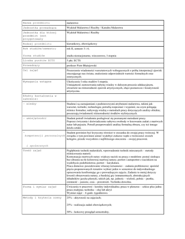 Nazwa przedmiotu malarstwo Jednostka prowadząca Wydział Malarstwa I Rzeźby / Katedra Malarstwa Jednostka dla której przedmiot jest przygotowany Wydział Malarstwa i Rzeźby Rodzaj przedmiotu kierunkowy, obowiązkowy Rok studiów/semestr; rok II, semestr 3 i 4; forma studiów studia niestacjonarne, wieczorowe, I stopnia Liczba punktów ECTS 5 pkt. ECTS Prowadzący profesor Piotr Błażejewski Cel zajęć Poszerzenie wiadomości warsztatowych wzbogaconych o próbę interpretacji zjawisk otaczającego nas świata; znalezienie odpowiednich wartości formalnych oraz estetycznych. Wymagania wstępne Ukończenie I roku studiów I stopnia. Umiejętność zastosowania nabytej wiedzy w dalszym procesie edukacyjnym, otwartość na różnorodność zjawisk artystycznych, chęci poznawcze i kreatywność artystyczna. Efekty kształcenia w zakresie: – wiedzy Studenci są zaznajamiani z podstawowymi atrybutami malarstwa, takimi jak: warsztat, techniki, technologia; potrafią rozpoznać i wyjaśnić, na czym polegają różnice formalne; nabywają wiedzę o metodach pracy dotyczących analizy obiektu; poszerzają świadomość różnorodności środków stylistycznych. – umiejętności Student potrafi świadomie posługiwać się poznanymi metodami pracy. Poprzez ćwiczenia i doświadczenie nabywa swobody w kreowaniu zadań z martwych natur lub pejzażu. Potrafi przeprowadzić analizę formalną obrazu, czy też innego dzieła sztuki. Student powinien być krytyczny również w stosunku do swojej pracy twórczej. W kompetencji personalnych związku z tym powinien umieć wydobyć ciekawe wątki z twórczości swoich kolegów, przede wszystkim z najbliższego otoczenia – swojej pracowni. – i społecznych Treść zajęć Pogłębienie technik malarskich, wprowadzenie technik mieszanych – metody różnicowania materii. Kontynuacja martwych natur; większy nacisk na pracę z modelem: postać siedząca bez ubrania na tle kolorowej martwej natury; portret i autoportret z naciskiem na wydobycie podobieństwa; portret – karykatura. Praca domowa: poszukiwanie własnej tożsamości – zadania problemowe: spośród pięciu proponowanych tematów wybrać jeden w semestrze do indywidualnego opracowania konfrontując go z prowadzącym zajęcia. Zadanie to mniej dotyczy kwestii obrazowania natury, a bardziej gry immanentnych, abstrakcyjnych składników języka plastyki, takich jak, np. jednośc – wielość, pełnia – pustka, ciemność – jasnośc, czas – przestrzeń. Technika dowolna. Forma i wymiar zajęć Ćwiczenia w pracowni - korekty indywidualne; praca w plenerze – szkice plus jedna praca studyjna; technika – olej lub akryl. Wymiar zajęć – 6 godz. tygodniowo. Metody i kryteria oceny 25% - aktywność na zajęciach; 25% - realizacja zadań obowiązkowych; 50% - końcowy przegląd semestralny. Sposób zaliczenia Zaliczenie, przegląd semestralny ze stopniem. Literatura Jerzy Malinowski, Co robić po kubiźmie?, Wydawnictwo Literackie, KrakówWrocław 1984 r., Alicja Kępińska, Energie sztuki, Wiedza Powszechna, Warszawa 1990 r., Roman Ingarden, O budowie obrazu, PWN, Warszawa 1958 r. Uwagi Korzystanie z modela, sztalug, desek, akcesoriów do budowania martwych natur, laptopa oraz ekranu do prezentacji opracowanych zadań. Język wykładowy Język polski, możliwość komunikacji w języku angielskim i rosyjskim.