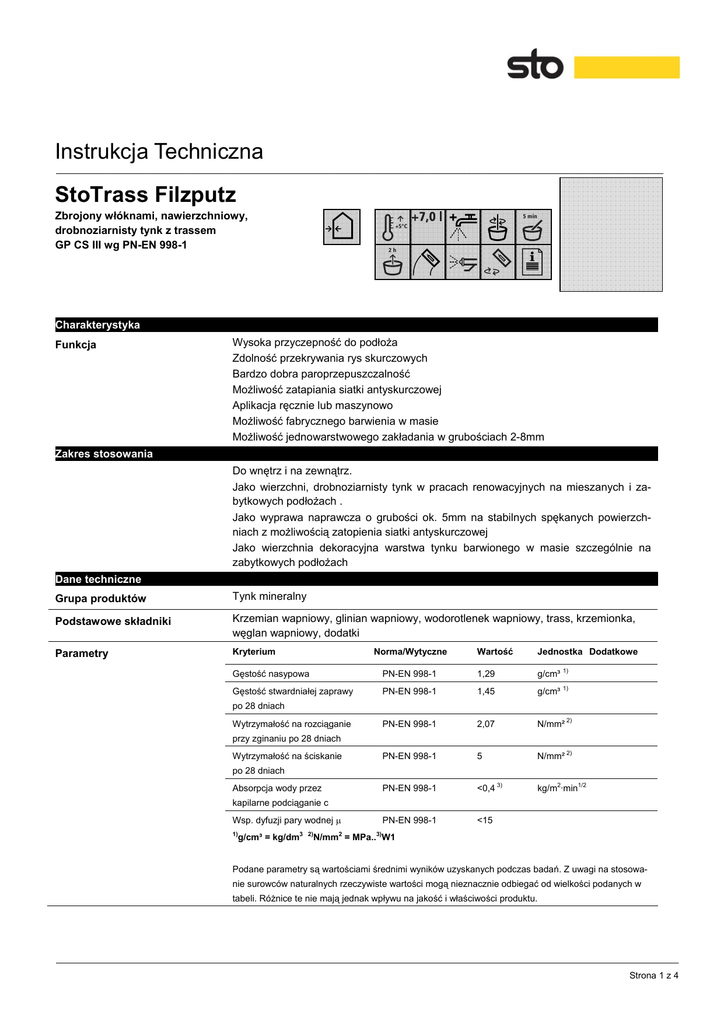 Instrukcja Techniczna _______________________________________________________________________________________________________________________ StoTrass Filzputz Zbrojony włóknami, nawierzchniowy, drobnoziarnisty tynk z trassem GP CS III wg PN-EN 998-1 5 min +5°C 2h Charakterystyka Funkcja Wysoka przyczepność do podłoża Zdolność przekrywania rys skurczowych Bardzo dobra paroprzepuszczalność Możliwość zatapiania siatki antyskurczowej Aplikacja ręcznie lub maszynowo Możliwość fabrycznego barwienia w masie Możliwość jednowarstwowego zakładania w grubościach 2-8mm Zakres stosowania Do wnętrz i na zewnątrz. Jako wierzchni, drobnoziarnisty tynk w pracach renowacyjnych na mieszanych i zabytkowych podłożach . Jako wyprawa naprawcza o grubości ok. 5mm na stabilnych spękanych powierzchniach z możliwością zatopienia siatki antyskurczowej Jako wierzchnia dekoracyjna warstwa tynku barwionego w masie szczególnie na zabytkowych podłożach Dane techniczne Grupa produktów Tynk mineralny Podstawowe składniki Krzemian wapniowy, glinian wapniowy, wodorotlenek wapniowy, trass, krzemionka, węglan wapniowy, dodatki Parametry Kryterium Norma/Wytyczne Wartość Jednostka Dodatkowe Gęstość nasypowa PN-EN 998-1 1,29 g/cm³ 1) Gęstość stwardniałej zaprawy PN-EN 998-1 1,45 g/cm³ 1) PN-EN 998-1 2,07 N/mm² 2) PN-EN 998-1 5 N/mm² 2) PN-EN 998-1 <0,4 3) kg/m2·min1/2 PN-EN 998-1 <15 po 28 dniach Wytrzymałość na rozciąganie przy zginaniu po 28 dniach Wytrzymałość na ściskanie po 28 dniach Absorpcja wody przez kapilarne podciąganie c Wsp. dyfuzji pary wodnej μ 1) g/cm³ = kg/dm3 2) N/mm2 = MPa..3)W1 Podane parametry są wartościami średnimi wyników uzyskanych podczas badań. Z uwagi na stosowanie surowców naturalnych rzeczywiste wartości mogą nieznacznie odbiegać od wielkości podanych w tabeli. Różnice te nie mają jednak wpływu na jakość i właściwości produktu. __________________________________________________________________________________________________________________________ Strona 1 z 4 Instrukcja Techniczna _______________________________________________________________________________________________________________________ StoTrass Filzputz Obróbka - Wskazówki Podłoże Podłożem dla StoTrass Filzputz mogą być wszelkie nośne stare i nowe mineralne tynki jak i mocne przekrycia dyspersyjne Podłoże musi być twarde, nośne, stabilne oraz wolne od przemrożeń i luźnych, bądź oleistych substancji zmniejszających przyczepność dla mineralnej zaprawy. Przygotowanie podłoża Sprawdzić nośność istniejących powłok, a następnie usunąć luźne warstwy. Podłoże osłabione, piaszczyste i kredujące się, zagruntować przy użyciu StoPrim Grundex. Podłoże przed nałożeniem StoTrass Filzputz dobrze zmoczyć wodą Na podłożu mieszanym, lub o różnej chłonności nanieść warstwę kontaktową powłoki pośredniej StoPrep Miral, lub nałożyć StoTrass Filzputz w dwóch warstwach Temperatura obróbki Minimalna temperatura otoczenia i podłoża podczas obróbki +5°C, maksymalna +25°C Przy zastosowaniu jako barwiony tynk zakładać tylko w stabilnych warunkach temperatury i wilgotności – zalecany zakres +15°C do + 20°C Nie stosować w przypadku zagrożenia nocnymi przymrozkami. Proporcje mieszania 3,5 : 1 (proszek : woda) 25 kg StoTrass Filzputz : ok. 7 litrów czystej wody Przygotowanie materiału Do przygotowania zaprawy StoTrass Filzputz należy stosować tylko czystą wodę. Nie dodawać innych substancji. Związany już materiał nie może być ponownie uzdatniany Zaprawy StoTrass Filzputz nie należy przerabiać i/lub dopuszczać do jej kontaktu z gipsem. Należy intensywnie wymieszać zawartość opakowania StoTrass Feinputz z odpowiednią ilością wody do uzyskania jednorodnej plastycznej konsystencji pozbawionej grudek przy użyciu mieszarki szybkoobrotowej. Czas obróbki Ok. 2 godzin przy temperaturze ok. +20°C Sposób aplikacji Ręcznie lub maszynowo Przykładowe zastosowanie Jako końcowa wyprawa naprawcza z wtopioną siatką na starych, stabilnych tynkach z rysami skurczowymi __________________________________________________________________________________________________________________________ Strona 2 z 4 Instrukcja Techniczna _______________________________________________________________________________________________________________________ StoTrass Filzputz Jako końcowy, barwny, drobnoziarnisty tynk dekoracyjny, szczególnie do zabytkowych elewacji Zużycie Artykuł Zastosowanie Zużycie ok. StoTrass Filzputz na 1 mm grubości warstwy 1,25 kg/m2 Zużycie zależne jest od podłoża i techniki nanoszenia. Podana wartość jest wielkością orientacyjną. Dokładne wartości zużycia należy ustalić dla danego podłoża. Obróbka StoTrass Filzputz nanieść w warstwie od 2 do 8 mm jednorazowo następnie zatrzeć lub zafilcować zależnie od żądanej faktury końcowej Przy pracach renowacyjnych spękanych podłoży należy nałożyć StoTrass Filzputz na grubość minimum 5mm z wtopioną siatką np. Sto-Glasfasergewebe StoTrass Filzputz nie może być stosowany i mieszany z gipsem Pielęgnacja zaprawy Naniesiony tynk należy chronić przed zbyt szybkim wyschnięciem, mrozem oraz silnym namoczeniem w fazie wiązania. Czas sezonowania StoTrass Filzputz wynosi 1 dzień na każdy 1mm grubości, jednak nie mniej niż 7 dni Powłoka końcowa StoTrass Filzputz może być pokrywany farbami elewacyjnymi jak każda mineralna wyprawa tynkarska StoTrass Filzputz może pozostać jako końcowa warstwa dekoracyjnego tynku nawierzchniowego, ale wówczas zalecana jest jego dodatkowa, powierzchniowa hydrofobizacja np. przy użyciu ispo Fassadenschutz BS 290 Czyszczenie narzędzi Wodą natychmiast po użyciu. Stwardniały materiał można usunąć tylko mechanicznie. Forma dostawy Opakowanie Worek 25 kg Barwa Kremowo-beżowy lub barwiony w masie na zamówienie Składowanie Warunki składowania StoTrass Filzputz chroni