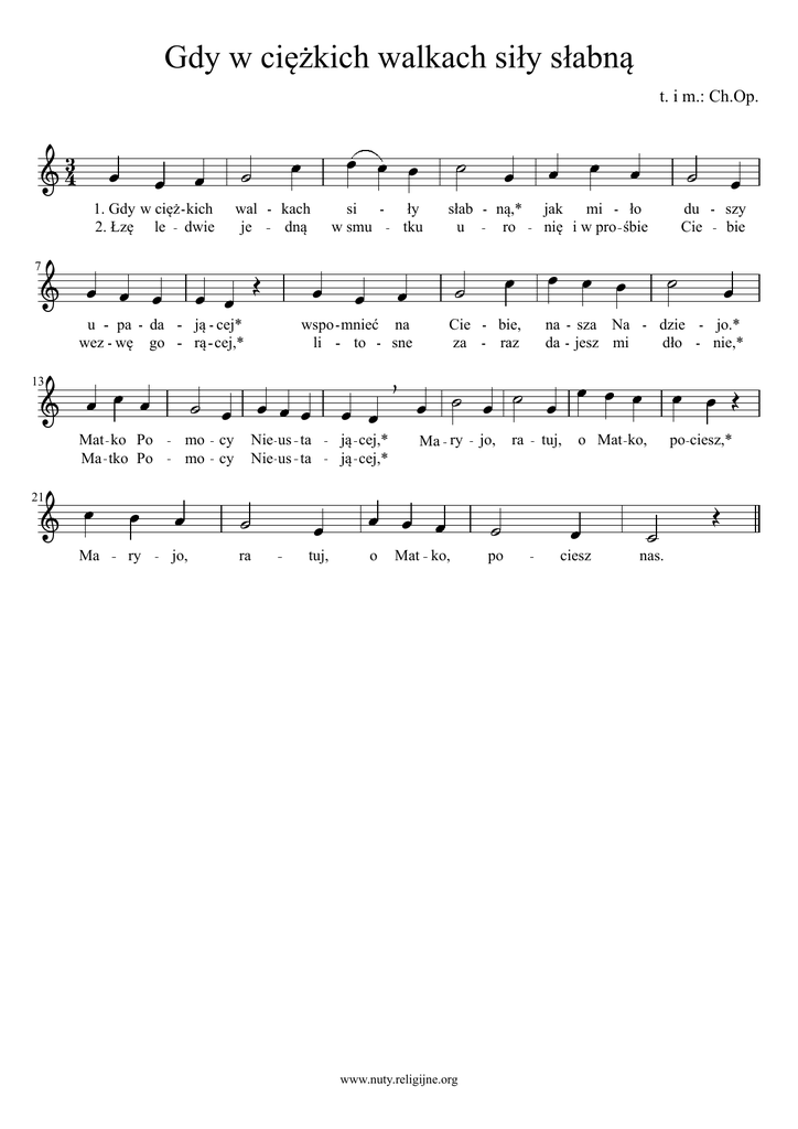 Gdy w ciężkich walkach siły słabną t. i m.: Ch.Op. 43 1. Gdy w cięż kich 2. Łzę le dwie 7 u pa da wez wę go wal je ją cej* rą cej,* kach dną si w smu ły tku wspo mnieć na li to sne słab u ną,* ro jak mi ło nię i w pro śbie Cie za bie, raz na sza Na da jesz mi 13 Mat ko Po Ma tko Po mo cy mo cy Nie us ta Nie us ta ją cej,* ją cej,* Ma ry jo, ra 21 Ma ry jo, ra tuj, o Mat ko, www.nuty.religijne.org po du Cie dzie dło tuj, o Mat ko, ciesz nas. szy bie jo.* nie,* po ciesz,*