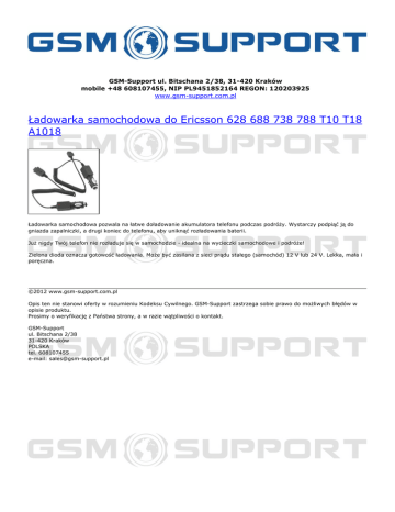 GSM-Support ul. Bitschana 2/38, 31-420 Kraków mobile +48 608107455, NIP PL9451852164 REGON: 120203925 www.gsm-support.com.pl Ładowarka samochodowa do Ericsson 628 688 738 788 T10 T18 A1018 Ładowarka samochodowa pozwala na łatwe doładowanie akumulatora telefonu podczas podróży. Wystarczy podpiąć ją do gniazda zapalniczki, a drugi koniec do telefonu, aby uniknąć rozładowania baterii. Już nigdy Twój telefon nie rozładuje się w samochodzie - idealna na wycieczki samochodowe i podróże! Zielona dioda oznacza gotowość ładowania. Może być zasilana z sieci prądu stałego (samochód) 12 V lub 24 V. Lekka, mała i poręczna. ©2012 www.gsm-support.com.pl Opis ten nie stanowi oferty w rozumieniu Kodeksu Cywilnego. GSM-Support zastrzega sobie prawo do możliwych błędów w opisie produktu. Prosimy o weryfikację z Państwa strony, a w razie wątpliwości o kontakt. GSM-Support ul. Bitschana 2/38 31-420 Kraków POLSKA tel. 608107455 e-mail: [email protected] Powered by TCPDF (www.tcpdf.org)