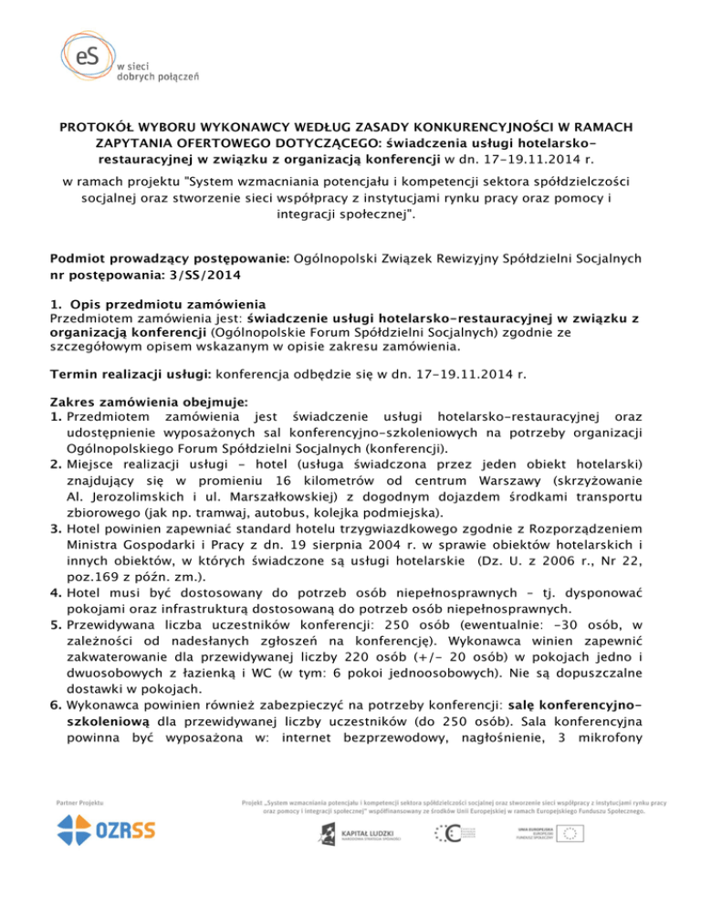 PROTOKÓŁ WYBORU WYKONAWCY WEDŁUG ZASADY KONKURENCYJNOŚCI W RAMACH ZAPYTANIA OFERTOWEGO DOTYCZĄCEGO: świadczenia usługi hotelarskorestauracyjnej w związku z organizacją konferencji w dn. 17-19.11.2014 r. w ramach projektu "System wzmacniania potencjału i kompetencji sektora spółdzielczości socjalnej oraz stworzenie sieci współpracy z instytucjami rynku pracy oraz pomocy i integracji społecznej". Podmiot prowadzący postępowanie: Ogólnopolski Związek Rewizyjny Spółdzielni Socjalnych nr postępowania: 3/SS/2014 1. Opis przedmiotu zamówienia Przedmiotem zamówienia jest: świadczenie usługi hotelarsko-restauracyjnej w związku z organizacją konferencji (Ogólnopolskie Forum Spółdzielni Socjalnych) zgodnie ze szczegółowym opisem wskazanym w opisie zakresu zamówienia. Termin realizacji usługi: konferencja odbędzie się w dn. 17-19.11.2014 r. Zakres zamówienia obejmuje: 1. Przedmiotem zamówienia jest świadczenie usługi hotelarsko-restauracyjnej oraz udostępnienie wyposażonych sal konferencyjno-szkoleniowych na potrzeby organizacji Ogólnopolskiego Forum Spółdzielni Socjalnych (konferencji). 2. Miejsce realizacji usługi - hotel (usługa świadczona przez jeden obiekt hotelarski) znajdujący się w promieniu 16 kilometrów od centrum Warszawy (skrzyżowanie Al. Jerozolimskich i ul. Marszałkowskiej) z dogodnym dojazdem środkami transportu zbiorowego (jak np. tramwaj, autobus, kolejka podmiejska). 3. Hotel powinien zapewniać standard hotelu trzygwiazdkowego zgodnie z Rozporządzeniem Ministra Gospodarki i Pracy z dn. 19 sierpnia 2004 r. w sprawie obiektów hotelarskich i innych obiektów, w których świadczone są usługi hotelarskie (Dz. U. z 2006 r., Nr 22, poz.169 z późn. zm.). 4. Hotel musi być dostosowany do potrzeb osób niepełnosprawnych – tj. dysponować pokojami oraz infrastrukturą dostosowaną do potrzeb osób niepełnosprawnych. 5. Przewidywana liczba uczestników konferencji: 250 osób (ewentualnie: -30 osób, w zależności od nadesłanych zgłoszeń na konferencję). Wykonawca winien zapewnić zakwaterowanie dla przewidywanej liczby 220 osób (+/- 20 osób) w pokojach jedno i dwuosobowych z łazienką i WC (w tym: 6 pokoi jednoosobowych). Nie są dopuszczalne dostawki w pokojach. 6. Wykonawca powinien również zabezpieczyć na potrzeby konferencji: salę konferencyjnoszkoleniową dla przewidywanej liczby uczestników (do 250 osób). Sala konferencyjna powinna być wyposażona w: internet bezprzewodowy, nagłośnienie, 3 mikrofony bezprzewodowe, rzutnik multimedialny, laptop, ekran, 250 krzeseł (układ kinowy), podwyższenie-scenę, flipchart wraz z papierem i markerami. Zamawiający zastrzega możliwość skorzystania z dodatkowego wyposażenia niezbędnego do przeprowadzenia panelu dyskusyjnego – tj. kanapa, krzesła (do ustalenia) dla 5 osób. Sala konferencyjna powinna znajdować się na terenie obiektu hotelarskiego. Sala konferencyjna wykorzystywana będzie: I dnia konferencji – w godz. 11.00 – 19.00 II dnia konferencji – w godz. 9.00 – 19.00 III dnia konferencji – w godz. 9.00 – 13.00. 7. Dodatkowo Wykonawca powinien zabezpieczyć II dnia konferencji: 3 sale szkoleniowe na 25-30 osób każda. Każda sala szkoleniowa powinna być wyposażona w: 25-30 krzeseł (ustawienie do uzgodnienia), rzutnik, laptop, ekran, flipchart wraz z papierem i kolorowymi markerami, dostęp do internetu bezprzewodowego. 8. Cena wynajęcia sali konferencyjnej i 3 sal szkoleniowych wraz wyposażeniem powinna być wliczona w cenę oferty. 9. Usługodawca zapewni usługę restauracyjną - śniadanie, obiady i kolację, w tym samym obiekcie hotelowym, w którym jest świadczona usługa hotelarska. Wykonawca zapewni śniadania w cenie pokoju. W skład usługi restauracyjnej wchodzą: a) śniadanie (w godz. 7.00 – 9.00) – bufet: kawa z ekspresu, herbata z dodatkami (mleko krowie, mleko roślinne, cukier, cytryna), soki, woda mineralna, jasne i ciemne pieczywo, masło, wędliny, deska serów żółtych, twarożek, jogurty, dżem, sałatka warzywna, warzywa (min. pomidory, ogórki, papryka, sałata), jajecznica, parówki lub kiełbaski na ciepło. b) obiad (w godz. 13.00 – 15.00) – bufet: zupa, danie główne (zawierające sztukę mięsa o wadze zgodnej ze standardami i normami żywienia grupowego, nie dopuszcza się dań zawierających mięso mielone, gulaszy, itp. oraz ziemniaki w różnej postaci.), a także dania wegetariańskie i wegańskie (do uzgodnienia), zestaw surówek, deser (minimum dwie propozycje do wyboru), kawa z ekspresu, herbata z dodatkami (mleko krowie, mleko roślinne, cukier, cytryna), soki, woda mineralna. Obiad musi być zapewniony dla wszystkich uczestników konferencji w sali restauracyjnej. c) kolacja (w godz. 19.00 – 21.00) – bufet: min. 2 gorące dania, zawierające potrawy mięsne (zawierające sztukę mięsa o wadze zgodnej ze standardami i normami żywienia grupowego, nie dopuszcza się dań zawierających mięso mielone, gulaszy, itp.), wegetariańskie i wegańskie (do uzgodnienia) oraz wędliny, sery, sałatki warzywne, jasne i ciemne pieczywo, masło, kawa z ekspresu, herbata z dodatkami (mleko krowie, mleko roślinne, cukier, cytryna), soki, woda mineralna. Kolacja musi być zapewniona dla wszystkich uczestników konferencji w sali restauracyjnej. d) przerwa kawowa ciągła - w I dniu konferencji: w godz. 12.00 – 18.00, II dnia: 9.00 – 18.00, III dnia: 9.00 – 12.00 z uzupełnianiem produktów w formie bufetu zawierającego: kawę, herbatę, mleko krowie, mleko roślinne, cukier, cytrynę, wodę mineralną wyprodukowaną przez przedsiębiorstwo spółdzielcze (gazowaną i niegazowaną – w proporcji 50/50), ciastka kruche oraz raz podane owoce (100 g na osobę bez uzupełniania). Przerwy kawowe muszą być zapewnione obok sali konferencyjnej lub w sali konferencyjnej dla uczestników konferencji. 10. Usługa restauracyjna będzie świadczona w dniach: - 17.11.2014 r. - I dzień konferencji (c