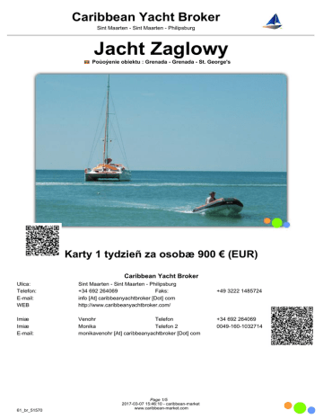 Caribbean Yacht Broker Sint Maarten - Sint Maarten - Philipsburg Jacht Zaglowy Poùoýenie obiektu : Grenada - Grenada - St. George's Karty 1 tydzieñ za osobæ 900 € (EUR) Caribbean Yacht Broker Ulica: Telefon: E-mail: WEB Sint Maarten - Sint Maarten - Philipsburg +34 692 264069 Faks: info [At] caribbeanyachtbroker [Dot] com http://www.caribbeanyachtbroker.com/ Imiæ Imiæ E-mail: Venohr Telefon Monika Telefon 2 monikavenohr [At] caribbeanyachtbroker [Dot] com 61_br_51570 Page 1/5 2017-03-07 15:46:10 - caribbean-market www.caribbean-market.com +49 3222 1485724 +34 692 264069 0049-160-1032714 Caribbean Yacht Broker Sint Maarten - Sint Maarten - Philipsburg Obszaru Karty / Obszar handlowy Specjaùy Basen & Snorkeling Kraj i ludzie Wystarczy zostawiã Typ ùodzi Numer kodu Typ ùodzi Producent: Model Designer Stan Materiaù Olinowanie Rok Dùugoúã LOA Szkic 61_br_51570 Numer kodu Zgùoú Salwador Robertson and Caine CSF Slup Ksztaùt kadùuba Kokpit Kolor Szerokoúã 14,00 1,00 Katamaran Centrum kokpicie Kontrola 7,00 Dane na temat silnika Producent Prowadziã Liczba Model Paliwo: Wydajnoúã Sprzæt 4 Kabiny 8 Koje 4 Toalety Wùaúciciele kabiny Spiýarnia Lodówka Kamizelki ratunkowe Liferaft 61_br_51570 Compass GPS Anemometr Sonar Radar VHF El Autopilot Fishfinder Page 2/5 2017-03-07 15:46:10 - caribbean-market www.caribbean-market.com Winda kotwiczna Kàpieliska Ùódki Ùódki m. AB Odtwarzacz CD Radio Telewizja Systemu 12 V DC Caribbean Yacht Broker Sint Maarten - Sint Maarten - Philipsburg Opis 61_br_51570 Page 3/5 2017-03-07 15:46:10 - caribbean-market www.caribbean-market.com Caribbean Yacht Broker Sint Maarten - Sint Maarten - Philipsburg 61_br_51570 Page 4/5 2017-03-07 15:46:10 - caribbean-market www.caribbean-market.com Caribbean Yacht Broker Sint Maarten - Sint Maarten - Philipsburg 61_br_51570 Page 5/5 2017-03-07 15:46:10 - caribbean-market www.caribbean-market.com