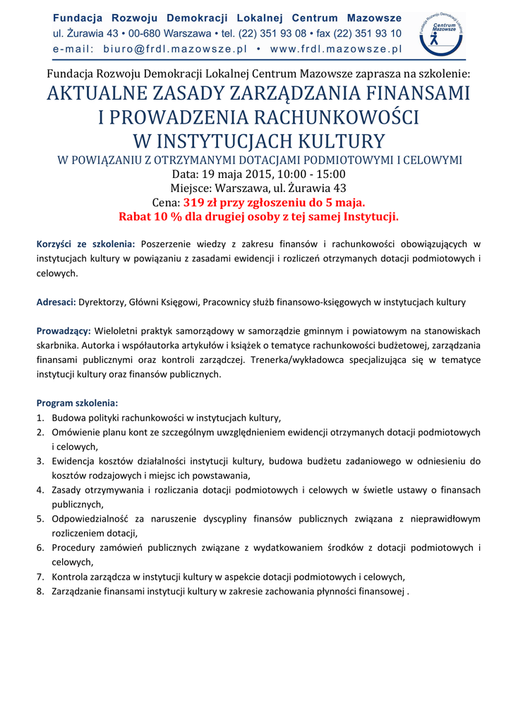 Fundacja Rozwoju Demokracji Lokalnej Centrum Mazowsze zaprasza na szkolenie: AKTUALNE ZASADY ZARZĄDZANIA FINANSAMI I PROWADZENIA RACHUNKOWOŚCI W INSTYTUCJACH KULTURY W POWIĄZANIU Z OTRZYMANYMI DOTACJAMI PODMIOTOWYMI I CELOWYMI Data: 19 maja 2015, 10:00 - 15:00 Miejsce: Warszawa, ul. Żurawia 43 Cena: 319 zł przy zgłoszeniu do 5 maja. Rabat 10 % dla drugiej osoby z tej samej Instytucji. Korzyści ze szkolenia: Poszerzenie wiedzy z zakresu finansów i rachunkowości obowiązujących w instytucjach kultury w powiązaniu z zasadami ewidencji i rozliczeń otrzymanych dotacji podmiotowych i celowych. Adresaci: Dyrektorzy, Główni Księgowi, Pracownicy służb finansowo-księgowych w instytucjach kultury Prowadzący: Wieloletni praktyk samorządowy w samorządzie gminnym i powiatowym na stanowiskach skarbnika. Autorka i współautorka artykułów i książek o tematyce rachunkowości budżetowej, zarządzania finansami publicznymi oraz kontroli zarządczej. Trenerka/wykładowca specjalizująca się w tematyce instytucji kultury oraz finansów publicznych. Program szkolenia: 1. Budowa polityki rachunkowości w instytucjach kultury, 2. Omówienie planu kont ze szczególnym uwzględnieniem ewidencji otrzymanych dotacji podmiotowych i celowych, 3. Ewidencja kosztów działalności instytucji kultury, budowa budżetu zadaniowego w odniesieniu do kosztów rodzajowych i miejsc ich powstawania, 4. Zasady otrzymywania i rozliczania dotacji podmiotowych i celowych w świetle ustawy o finansach publicznych, 5. Odpowiedzialność za naruszenie dyscypliny finansów publicznych związana z nieprawidłowym rozliczeniem dotacji, 6. Procedury zamówień publicznych związane z wydatkowaniem środków z dotacji podmiotowych i celowych, 7. Kontrola zarządcza w instytucji kultury w aspekcie dotacji podmiotowych i celowych, 8. Zarządzanie finansami instytucji kultury w zakresie zachowania płynności finansowej . ZGŁOSZENIE AKTUALNE ZASADY ZARZĄDZANIA FINANSAMI I PROWADZENIA RACHUNKOWOŚCI W INSTYTUCJACH KULTURY W POWIĄZANIU Z OTRZYMANYMI DOTACJAMI PODMIOTOWYMI I CELOWYMI Data: 19 maja 2015, 10:00 - 15:00 Miejsce: Warszawa, ul. Żurawia 43 Cena: 319 zł przy zgłoszeniu do 5 maja. Rabat 10 % dla drugiej osoby z tej samej Instytucji. Instytucja (dane do faktury): ................................................................................................ Adres: ................................................................................................................................. NIP: ..................................................................................................................................... L.p. Imię i nazwisko Wydział tel. e-mail 1.......................................................................................................................................... 2.......................................................................................................................................... 3.......................................................................................................................................... ........................................................... podpis i pieczątka osoby delegującej Zgłoszenia prosimy przesyłać do 12 maja 2015 r. fax: (22) 351 93 10, e-mail: [email protected] lub wybrać opcje zapisu przez stronę www.frdl.mazowsze.pl Przy zgłoszeniu w ramach Forów prosimy o wpisanie w uwagach: „Zgłoszenie w ramach Forum (nazwa odpowiedniego Forum)”. Ewentualną rezygnację ze szkolenia można zgłosić najpóźniej na dwa dni robocze przed szkoleniem. W przypadku niewykorzystania zgłoszonego uczestnictwa - Urząd będzie zobowiązany do sfinansowania 60% odpłatności za uczestnictwo i materiały. FRDL zastrzega sobie prawo odwołania szkolenia. Miejsce szkolenia: Warszawa, ul. Żurawia 43. Lokalizacja 300 metrów od Metra Centrum. Cena: 319 zł netto przy zgłoszeniu do 5 maja. Cena po 5 maja to 369 zł. Rabat 10 % dla drugiej osoby z tej samej Instytucji. Zwolnienie z VAT w przypadku finansowania ze środków publicznych. W cenie materiały szkoleniowe, zaświadczenie, lunch oraz przerwy kawowe. Płatność przelewem, na podstawie faktury wystawionej w dniu szkolenia. Szkolenia realizujemy również w formie zamkniętej na terenie Instytucji. Zapytania prosimy kierować na adres e-mail: [email protected]