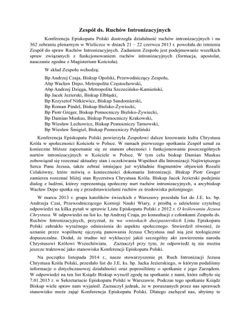 Zespół ds. Ruchów Intronizacyjnych Konferencja Episkopatu Polski dostrzegła działalność ruchów intronizacyjnych i na 362 zebraniu plenarnym w Wieliczce w dniach 21 – 22 czerwca 2013 r. powołała do istnienia Zespół do spraw Ruchów Intronizacyjnych. Zadaniem Zespołu jest podejmowanie wszelkich spraw związanych z funkcjonowaniem ruchów intronizacyjnych (formacja, apostolat, nauczanie zgodne z Magisterium Kościoła). W skład Zespołu wchodzą: Bp Andrzej Czaja, Biskup Opolski, Przewodniczący Zespołu, Abp Wacław Depo, Metropolita Częstochowski, Abp Andrzej Dzięga, Metropolita Szczecińsko-Kamieński, Bp Jacek Jezierski, Biskup Elbląski, Bp Krzysztof Nitkiewicz, Biskup Sandomierski, Bp Roman Pindel, Biskup Bielsko-Żywiecki, Bp Piotr Greger, Biskup Pomocniczy Bielsko-Żywiecki, Bp Damian Muskus, Biskup Pomocniczy Krakowski, Bp Wiesław Lechowicz, Biskup Pomocniczy Tarnowski, Bp Wiesław Śmigiel, Biskup Pomocniczy Pelpliński Konferencja Episkopatu Polski powierzyła Zespołowi dalsze kreowanie kultu Chrystusa Króla w społeczności Kościoła w Polsce. W ramach pierwszego spotkania Zespół uznał za konieczne bliższe zapoznanie się ze stanem obecności i funkcjonowania poszczególnych nurtów intronizacyjnych w Kościele w Polsce. W tym celu biskup Damian Muskus zobowiązał się rozeznać aktualny stan i oczekiwania Wspólnot dla Intronizacji Najświętszego Serca Pana Jezusa, także zebrać istniejące już wykładnie fragmentów objawień Rozalii Celakówny, które mówią o konieczności dokonania Intronizacji. Biskup Piotr Greger zamierza rozeznać bliżej stan Rycerstwa Chrystusa Króla. Biskup Jacek Jezierski podejmie dialog z ludźmi, którzy reprezentują społeczny nurt ruchów intronizacyjnych, a arcybiskup Wacław Depo spotka się z przedstawicielami ruchów ze środowiska polonijnego. W marcu 2013 r. grupa katolików świeckich z Warszawy przesłała list do J.E. ks. bp. Andrzeja Czai, Przewodniczącego Komisji Nauki Wiary, z prośbą o udzielenie czytelnej odpowiedzi na kilka pytań w sprawie Listu Episkopatu Polski z 2012 r. O królowaniu Jezusa Chrystusa. W odpowiedzi na list ks. bp Andrzej Czaja, po konsultacji z członkami Zespołu ds. Ruchów Intronizacyjnych, przyznał, że we wnioskach duszpasterskich Listu Episkopatu Polski zabrakło wyraźnego odniesienia do aspektu społecznego. Stwierdził również, że uznanie przez wspólnotę ojczystą panowania Jezusa Chrystusa nad nią jest teologicznie dopuszczalne. Dodał, że trudno też wykluczyć jakiś szczególny akt zawierzenia narodu Chrystusowi Królowi Wszechświata. Zaznaczył przy tym, że odpowiedź tę nie można jeszcze traktować jako stanowiska Konferencji Episkopatu Polski. Na początku listopada 2014 r., nasze stowarzyszenie pt. Ruch Intronizacji Jezusa Chrystusa Króla Polski, przesłało list do J.E. ks. bp. Jacka Jezierskiego, w którym podaliśmy informacje o dotychczasowej działalności oraz poprosiliśmy o spotkanie z jego Zarządem. W odpowiedzi na ten list Ksiądz Biskup wyraził zgodę na spotkanie z nami, które odbyło się 7.01.2015 r. w Sekretariacie Episkopatu Polski w Warszawie. Podczas tego spotkanie Ksiądz Biskup wiele spraw nam wyjaśnił. Zaznaczył jednak, że w poruszanych przez nas sprawach stanowisko może zająć Konferencja Episkopatu Polski. Dlatego zachęcał nas, abyśmy te +2 problemy przedstawiali swoim biskupom, gdyż to ułatwi zajęcie przez Episkopat Polski przychylnego stanowiska w kwestii postulatów, podnoszonych przez ruchy intronizacyjne. Nadmieniamy, że Stowarzyszenie nasze zostało wpisane do Krajowego Rejestru Stowarzyszeń w Sądzie Rejonowym dla M. St. Warszawy w dniu 12 grudnia 2011 r. Nazwa Stowarzyszenia jest prawnie zastrzeżona, a terenem jego działalności jest obszar Rzeczypospolitej Polskiej. Jego statut przewiduje możliwość tworzenia oddziałów wojewódzkich, a także kół w mniejszych miejscowościach. W kwietniu 2015 r. ks. bp Andrzej Czaja, Przewodniczący Zespołu ds. Ruchów Intronizacyjnych, zaprosił przewodniczących ruchów intronizacyjnych na spotkanie z członkami Zespołu, które odbyło się na Jasnej Górze w dniu 4 maja 2015 r. W pierwszej części spotkania przewidziano możliwość przedstawienia stanowiska reprezentowanego ruchu w sprawie dokonania Intronizacji w Polsce oraz określenia własnego jej rozumienia, a także oczekiwań wobec Zespołu ds. Ruchów Intronizacyjnych. Druga część spotkania poświęcona była wymianie myśli nt. drogi ku integracji ruchów intronizacyjnych i form dalszej współpracy między nimi. Uzgodniono też termin następnego spotkania na dzień 10 czerwca 2015 r. w Sekretariacie Konferencji Episkopatu Polski w Warszawie. Spotkanie w dniu 10 czerwca 2015 r. odbyło się w sali obrad Konferencji Episkopatu Polski w Warszawie. Program spotkania przewidywał: 1) Informację Księdza Biskupa Andrzeja Czai o stanowisku Konferencji Episkopatu Polski w sprawie Intronizacji, zajętym na zebraniu w dniach 9-10 czerwca 2015 r.; 2) Dyskusję; 3) Program sympozjum pt. „Intronizacja Jezusa Króla w Polsce”. W dniach 9 i 10 października 2015 r. odbyło się dwudniowe spotkanie Zespołu ds. Ruchów Intronizacyjnych z przewodniczącymi ruchów intronizacyjnych na Jasnej Górze. W pierwszym dniu obrad uzgodniono m. in., że w liście pasterskim Konferencji Episkopatu Polski na uroczystość Chrystusa Króla w 2015 r. znajdzie się wzmianka o Intronizacji. Natomiast następnego dnia, tj. 10 października odbyło się tam Sympozjum sprawozdawczonaukowe pt. Królowanie Jezusa w Polsce, zaangażowanie ruchów intronizacyjnych i głos Magisterium Kościoła. Poprzedzone ono zostało udziałem przedstawicieli ruchów intronizacyjnych w Apelu Jasnogórskim i nocnym czuwaniu w Kaplicy Cudownego Obrazu. Obrady Sympozjum rozpoczęto Mszą świętą w Kaplicy Cudownego Obrazu, sprawowanej pod przewodnictwem ks. abp. Wacława Depo, Metropolity Częstochowskiego. W programie Sympozjum przewidz