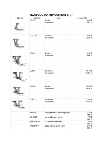 MASZYNY DO SITODRUKU ALU BBCLC1800-CE wygrzewarka Flash P16X16N paleta standardowa 16x16 * ceny walutowe przeliczamy na PLN wg kursu sprzedaży NBP * podano orientacyjne ceny w PLN przeliczając wg kursu 3.29 * ceny na bazie magazyn Warszawa * ceny obowiązują od 1 sierpnia 2013 do ogłoszenia nowego cennika 701 $ 2 306 zł 45 $ 148 zł
