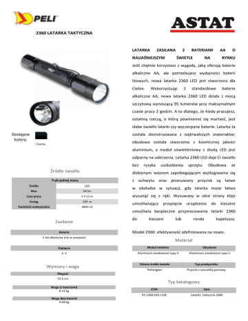 2360 0 LATARKA TAKTYCZNA LATARKA ZASILANA NAJJAŚNIEJSZYM 2 BATERIAMI ŚWIETLE AA NA O RYNKU Jeśli chętnie korzystasz z wygody, jaką oferują baterie alkaliczne AA, ale potrzebujesz wydajności baterii litowych, nowa latarka 2360 LED jest stworzona dla Ciebie. Wykorzystując 2 standardowe baterie alkaliczne AA, nowa latarka 2360 LED działa z mocą szczytową zytową wynoszącą 95 lumenów przy maksymalnym czasie pracy 2 godzin. A to dlatego, że kiedy pracujesz, ostatnią rzeczą, o którą powinieneś się martwić, jest słabe światło latarki czy wyczerpane baterie. Latarka ta Dostępne kolory: została skonstruowana z najtrwalszych materiałów: mater obudowa została stworzona z kosmicznej jakości Czarny aluminium, a moduł oświetleniowy z diodą LED jest odporny na uderzenia. Latarka 2360 LED daje Ci światło bez Źródło światła ryzyka uszkodzenia sprzętu. Obudowa ze żłobionym wzorem zapobiegającym wyślizgiwaniu się z uchwytu chwytu oraz przesuwany przycisk są łatwe Tryb pełnej mocy Źródło LED Moc 94 lm Czas pracy 2 h 15 m wysunąć się z ręki. Wysuwany w obie strony klips Zasięg 139 m umożliwiający przypięcie urządzenia do kieszeni Światłość maksymalna 4893 cd w obsłudze w sytuacji, gdy latarka może łatwo umożliwia bezpieczne przymocowanie latarki lat 2360 Zasilanie Baterie do kieszeni lub ronda kapelusza. Model 2360: efektywność zdefiniowana na nowo. 2 AA Alkaliczne (nie w zestawie) Materiał Napięcie Moduł świetlny Obudowa 3 V Aluminium anodowane typu II Aluminium anodowane typu II Wymiary i waga Osłona źródła światła Typ przełącznika Poliwęglan Przycisk z uszczelką gumową Długość 15.5 cm Typ katalogowy Waga (z bateriami) 0.13 kg Waga (bez baterii) 0.08 kg KTM Opis PE-2360-010-110E Latarka taktyczna 2360