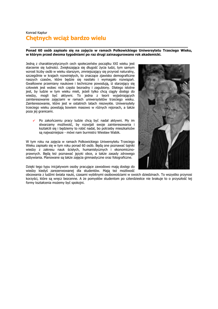 Konrad Kaptur Chętnych wciąż bardzo wielu Ponad 60 osób zapisało się na zajęcia w ramach Polkowickiego Uniwersytetu Trzeciego Wieku, w którym przed dwoma tygodniami po raz drugi zainaugurowano rok akademicki. Jedną z charakterystycznych cech społeczeństw początku XXI wieku jest starzenie się ludności. Zwiększająca się długość życia ludzi, tym samym wzrost liczby osób w wieku starszym, zmniejszający się przyrost naturalny, szczególnie w krajach rozwiniętych, to znaczące zjawisko demograficzne naszych czasów, które będzie się nasilało i wymagało rozwiązań. Gwałtowne przemiany naukowe i techniczne powodują, iż starzejący się człowiek jest wobec nich często bezradny i zagubiony. Dlatego istotne jest, by ludzie w tym wieku mieli, jeżeli tylko chcą ciągły dostęp do wiedzy, mogli być aktywni. To jedna z teorii wyjaśniających zainteresowanie zajęciami w ramach uniwersytetów trzeciego wieku. Zainteresowanie, które jest w ostatnich latach niezwykle. Uniwersytety trzeciego wieku powstają bowiem masowo w różnych rejonach, a także poza jej granicami. Po zakończeniu pracy ludzie chcą być nadal aktywni. My im stwarzamy możliwość, by rozwijali swoje zainteresowania i kształcili się i będziemy to robić nadal, bo potrzeby mieszkańców są najważniejsze - mówi nam burmistrz Wiesław Wabik. W tym roku na zajęcia w ramach Polkowickiego Uniwersytetu Trzeciego Wieku zapisało się w tym roku ponad 60 osób. Będą one poznawać tajniki wiedzy z zakresu nauk ścisłych, humanistycznych i ekonomicznoprawnych. Będą też poznawać języki obce, a także zasady zdrowego odżywiania. Planowane są także zajęcia gimnastyczne oraz fotograficzne. Dzięki tego typu inicjatywom osoby pracujące zawodowo mają dostęp do wiedzy kiedyś zarezerwowanej dla studentów. Mają też możliwość obcowania z ludźmi świata nauki, czasami wybitnymi osobowościami w swoich dziedzinach. To wszystko przynosi korzyści, które są wręcz bezcenne. A że pomysłów studentom po czterdziestce nie brakuje to o przyszłość tej formy kształcenia możemy być spokojni.