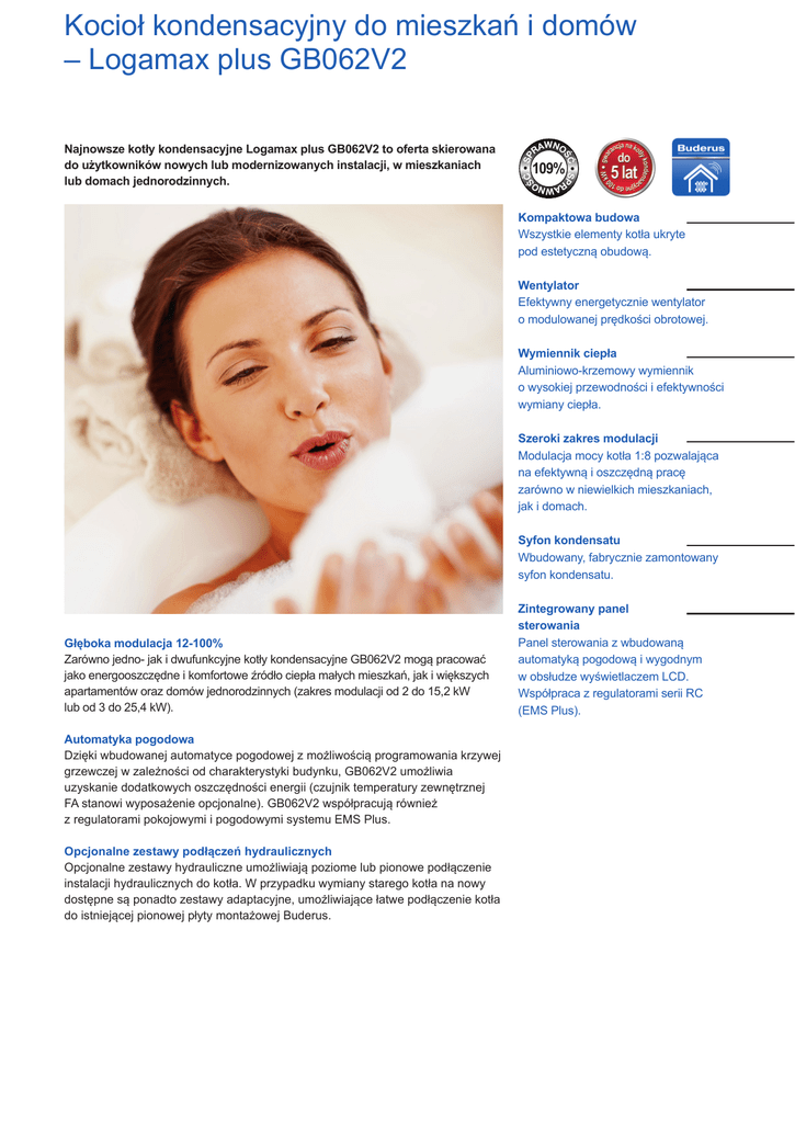 Kocioł kondensacyjny do mieszkań i domów – Logamax plus GB062V2 SP ŚĆ WN RA O S ŚĆ P 109% WNO RA Najnowsze kotły kondensacyjne Logamax plus GB062V2 to oferta skierowana do użytkowników nowych lub modernizowanych instalacji, w mieszkaniach lub domach jednorodzinnych. Kompaktowa budowa Wszystkie elementy kotła ukryte pod estetyczną obudową. Wentylator Efektywny energetycznie wentylator o modulowanej prędkości obrotowej. Wymiennik ciepła Aluminiowo-krzemowy wymiennik o wysokiej przewodności i efektywności wymiany ciepła. Szeroki zakres modulacji Modulacja mocy kotła 1:8 pozwalająca na efektywną i oszczędną pracę zarówno w niewielkich mieszkaniach, jak i domach. Syfon kondensatu Wbudowany, fabrycznie zamontowany syfon kondensatu. Głęboka modulacja 12-100% Zarówno jedno- jak i dwufunkcyjne kotły kondensacyjne GB062V2 mogą pracować jako energooszczędne i komfortowe źródło ciepła małych mieszkań, jak i większych apartamentów oraz domów jednorodzinnych (zakres modulacji od 2 do 15,2 kW lub od 3 do 25,4 kW). Automatyka pogodowa Dzięki wbudowanej automatyce pogodowej z możliwością programowania krzywej grzewczej w zależności od charakterystyki budynku, GB062V2 umożliwia uzyskanie dodatkowych oszczędności energii (czujnik temperatury zewnętrznej FA stanowi wyposażenie opcjonalne). GB062V2 współpracują również z regulatorami pokojowymi i pogodowymi systemu EMS Plus. Opcjonalne zestawy podłączeń hydraulicznych Opcjonalne zestawy hydrauliczne umożliwiają poziome lub pionowe podłączenie instalacji hydraulicznych do kotła. W przypadku wymiany starego kotła na nowy dostępne są ponadto zestawy adaptacyjne, umożliwiające łatwe podłączenie kotła do istniejącej pionowej płyty montażowej Buderus. 8 Zintegrowany panel sterowania Panel sterowania z wbudowaną automatyką pogodową i wygodnym w obsłudze wyświetlaczem LCD. Współpraca z regulatorami serii RC (EMS Plus). Logamax plus GB062V2 (-14, -24, -24/24 kW) Zalety kotła Logamax plus GB062V2: XL A A Oszczędność gazu: - głęboka modulacja 12-100% - możliwość współpracy w instalacją kolektorów słonecznych Łatwy montaż: - różne możliwości podłączeń hydraulicznych Łatwa obsługa: - wbudowana automatyka pogodowa i współpraca z regulatorami EMS Plus - czytelny wyświetlacz LCD Niewielkie wymiary Atrakcyjna cena Dodatkowe oszczędności inwestycyjne W przypadku budynków wielorodzinnych i wielokondygnacyjnych, spaliny z kotłów GB062V2 mogą być odprowadzane zarówno indywidualnymi, jak i wspólnymi (w części pionowej) przewodami spalinowymi. Kotły GB062V2 dostarczane są ze standardowymi adapterami powietrzno-spalinowymi Ø 80/125 mm. Łatwa zmiana rodzaju gazu Kotły kondensacyjne Logamax plus GB062V2 dostosowane są do spalania wszystkich powszechnie występujących w Polsce gazów, tj. E, Lw, Ls lub B/P. Pomimo, że standardowa nastawa przewiduje pracę kotła na gaz E, to dostosowanie do pracy z innym rodzajem gazu (Lw, Ls, B/P) jest wyjątkowo łatwe. Wystarczy, regulacja i odpowiednie oznakowane wykonane przez autoryzowany serwis. 9 Logamax plus GB012KV2 Logamax plus GB062V2 Dane techniczne Logamax plus GB062V2 Logamax plus GB062V2 Jednostka GB062-14V2 GB062-24V2 GB062-24KV2 Zakres modulacji mocy cieplnej kW 2-15,2 3-25,4 3-25,4 Sezonowa efektywność energetyczna ogrzewania pomieszczeń ηs % 93 93 93 - A A A % - - 83 - - - A - - - XL dB(A) 50 50 50 l/min - - 11,3 Dane ErP Klasa efektywności energetycznej Efektywność energetyczna podgrzewania wody ηwh Klasa efektywności energetycznej podgrzewania wody Deklarowany profil obciążeń (c.w.u.) Poziom mocy akustycznej w pomieszczeniu LWA Wydajność c.w.u. przy ΔT=30 K wg EN 625 (D) Dopuszczalne ciśnienie gazu E na przyłączu Dopuszczalne ciśnienie gazu LPG na przyłączu Dopuszczalne ciśnienie gazu Lw na przyłączu Dopuszczalne ciśnienie gazu Ls na przyłączu mbar 17-25 mbar 37 mbar 16-23 mbar 10-16 Maksymalne ciśnienie wody c.o. bar 3 Maksymalne ciśnienie wody c.w.u. bar 10 Pojemność i ciśnienie wstępne naczynia wzbiorczego l/bar 8/0,75 8/0,75 8/0,75 Przyłącze powietrzno-spalinowe mm Ø 80/125 Ø 80/125 Ø 80/125 Typ instalacji powietrzno-spalinowej Zasilanie elektryczne Masa - B23, B33, C13, C33, C43, C53, C63, C83, C93 V/Hz AC 230/50 AC 230/50 AC 230/50 kg 36 36 36 B Ø125 Ø80 K ≥ 100 A 5,2 % ≥ 100 S 101 686 R1/2 R3/4 65 R3/4 67 67 400 R1/2 65 885 890 815 312 R3/4 30 60 300 0 010 006 913-001 29