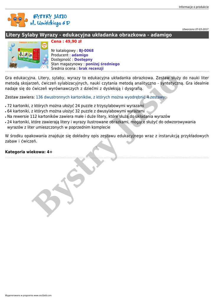Informacje o produkcie Utworzono 07-03-2017 Litery Sylaby Wyrazy - edukacyjna układanka obrazkowa - adamigo Cena : 49,90 zł Nr katalogowy : BJ-0068 Producent : adamigo Dostępność : Dostępny Stan magazynowy : poniżej średniego Średnia ocena : brak recenzji si o Gra edukacyjna. Litery, sylaby, wyrazy to edukacyjna układanka obrazkowa. Zestaw służy do nauki liter metodą skojarzeń, ćwiczeń sylabizacyjnych, nauki czytania metodą analityczno - syntetyczną. Gra idealnie nadaje się do ćwiczeń wyrównawczych z dziećmi z dysleksją i dysgrafią. Zestaw zawiera: 136 dwustronnych kartoników, z których można wyodrębnić 4 zestawy: ● ● ● 72 kartoniki, z których można ułożyć 24 puzzle z trzysylabowymi wyrazami 64 kartoniki, z których można ulożyć 32 puzzle z dwusylabowymi wyrazami Na rewersie 112 kartoników zawiera małe i duże litery, które służą do układania wyrazów 24 kartoniki, które zawierają litery i wyrazy ilustrowane obrazkami, mogące służyć do odwzorowywania wyrazów z liter umieszczonych w poprzednim komplecie Ja ● B ys tr Kategoria wiekowa: 4+ y W środku opakowania znajduje się dokładny opis zestawu edukacyjnego wraz z instarukcją przykładowych zabaw i ćwiczeń. Wygenerowano w programie www.oscGold.com