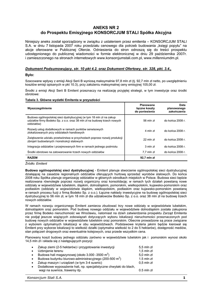 ANEKS NR 2 do Prospektu Emisyjnego KONSORCJUM STALI Spółka Akcyjna Niniejszy aneks został sporządzony w związku z ustaleniem przez emitenta – KONSORCJUM STALI S.A. w dniu 7 listopada 2007 roku przedziału cenowego dla potrzeb budowania „księgi popytu” na akcje oferowane w Publicznej Ofercie. Odniesienia do stron odnoszą się do treści prospektu udostępnionego do publicznej wiadomości w formie elektronicznej w dniu 29 października 2007r. i zamieszczonego na stronach internetowych www.konsorcjumstali.com.pl, www.millenniumdm.pl. Dokument Podsumowujący, str. 10 pkt 4.2. oraz Dokument Ofertowy, str. 328, pkt. 3.4., Było: Szacowane wpływy z emisji Akcji Serii B wyniosą maksymalnie 97,8 mln zł (tj. 92,7 mln zł netto, po uwzględnieniu kosztów emisji opisanych w pkt 10.3), przy założeniu maksymalnej ceny emisyjnej 105,00 zł. Środki z emisji Akcji Serii B Emitent przeznaczy na realizację przyjętej strategii, w tym inwestycje oraz środki obrotowe: Tabela 3. Główne wydatki Emitenta w przyszłości Wyszczególnienie Planowane łączne koszty do poniesienia Data planowanego zakończenia 56 mln zł do końca 2008 r. 4 mln zł do końca 2008 r. 22 mln zł do końca 2008 r. 3 mln zł do końca 2008 r. 7,7 mln zł do końca 2008 r. Budowa ogólnopolskiej sieci dystrybucyjnej (w tym 18 mln zł na zakup udziałów firmy Bodeko Sp. z o.o. oraz 38 mln zł na budowę trzech nowych oddziałów) Rozwój usług dodatkowych w ramach punktów serwisowych zlokalizowanych przy oddziałach handlowych Zwiększenie udziału przetwórstwa w przychodach poprzez rozwój produkcji zbrojeń budowlanych i konstrukcji stalowych Integracja oddziałów i przejmowanych firm w ramach jednego podmiotu Środki obrotowe na zatowarowanie trzech nowych oddziałów RAZEM 92,7 mln zł Źródło: Emitent Budowa ogólnopolskiej sieci dystrybucyjnej - Emitent planuje stworzenie ogólnopolskiej sieci dystrybucyjnej działającej na zasadzie regionalnych oddziałów oferujących hurtową sprzedaż wyrobów stalowych. Do końca 2008 roku Spółka planuje organizację oddziałów w głównych ośrodkach miejskich w Polsce. Budowa sieci będzie realizowana równolegle poprzez rozwój organiczny oraz konsolidację; w ramach tych działań powstaną nowe oddziały w województwie lubelskim, śląskim, dolnośląskim, pomorskim, wielkopolskim, kujawsko-pomorskim oraz podlaskim (oddziały w województwie śląskim, wielkopolskim, podlaskim oraz kujawsko-pomorskim powstaną w ramach procesu fuzji z firmą Bodeko Sp. z o.o.). Łączne nakłady inwestycyjne na budowę ogólnopolskiej sieci dystrybucyjnej to 56 mln zł, w tym 18 mln zł dla udziałowców Bodeko Sp. z o.o. oraz 38 mln zł na budowę trzech nowych oddziałów. W ramach rozwoju organicznego Emitent zamierza zbudować trzy nowe oddziały w województwie lubelskim, dolnośląskim oraz pomorskim. Pod budowę nowego oddziału w województwie dolnośląskim została zakupiona przez firmę Bodeko nieruchomość we Wrocławiu, natomiast na dzień zatwierdzenia prospektu Zarząd Emitenta nie podjął jeszcze wiążących zobowiązań dotyczących wyboru lokalizacji nieruchomości przeznaczonych pod budowę nowych oddziałów w województwie lubelskim oraz pomorskim. Obecnie prowadzone są prace związane z wyborem optymalnych lokalizacji w obu województwach. Podstawowe kryteria jakimi będzie kierował się Emitent przy wyborze lokalizacji to wielkość działki (optymalna wielkość to 2 do 5 hektarów), dostępność mediów, stan połączeń drogowych oraz ewentualnie kolejowych, oraz przede wszystkim cena. Planowany koszt budowy jednego oddziału zarówno w województwie lubelskim jak i pomorskim wynosi około 14,5 mln zł i składa się z następujących pozycji: • • • • • • Zakup ziemi (2-5 hektarów) i przygotowanie inwestycji Uzbrojenie terenu Budowa hali magazynowej (około 3.000 -3500 m2) Budowa budynku biurowo-administracyjnego (200-500 m2) Zakup maszyn i urządzeń (w tym 3-4 suwnic) Dodatkowe wyposażenie hali, np. specjalistyczne chwytaki do blach, wagi na suwnice, trawersy itp. Konsorcjum Stali S.A. 5,5 mln zł 1,5 mln zł 5,0 mln zł 1.5 mln zł 0,5 mln zł 0.5 mln zł 1 Aneks Nr 2 Prospekt Emisyjny Planowany koszt budowy oddziału w województwie dolnośląskim wynosi około 9,0 mln zł i składa się z następujących pozycji: • • • • • Uzbrojenie terenu 2 Budowa hali magazynowej (około 3.000 -3500 m ) Budowa budynku biurowo-administracyjnego (200-500 m2) Zakup maszyn i urządzeń (w tym 3-4 suwnic) Dodatkowe wyposażenie hali, np. specjalistyczne chwytaki do blach, wagi na suwnice, trawersy itp. 1,5 mln zł 5,0 mln zł 1.5 mln zł 0,5 mln zł 0.5 mln zł Rozwój usług dodatkowych w ramach punktów serwisowych zlokalizowanych przy oddziałach handlowych – Emitent przy każdym oddziale handlowym planuje organizację punktów serwisowych świadczących usługi między innymi z zakresu konfekcjonowania wyrobów stalowych, przycinania blach, wstępnej obróbki wyrobów hutniczych oraz logistyki dostawy na miejsce wskazane przez klienta. Emitent zamierza zmodernizować punkty serwisowe przy istniejących oddziałach (własnych i łączonej firmy Bodeko Sp. z o.o.) oraz organizować podobne punkty przy nowych oddziałach. Koszt modernizacji lub budowy jednego punktu serwisowego wyniesie około 400 tys. zł i składa się z następujących pozycji: • • • • • Piła taśmowa do cięcia wraz z oprzyrządowaniem (2 sztuki) Gilotyna Piła tarczowa (2 sztuki) Wózek widłowy Samochód dostawczy 100 tys. zł 100 tys. zł 20 tys. zł 80 tys. zł 100 tys. zł Łączne nakłady na rozwój usług dodatkowych, dla wszystkich punktów serwisowych zlokalizowanych przy istniejących oraz przy nowopowstających oddziałach wyniosą 4 mln zł. Zwiększenie udziału przetwórstwa w przychodach poprzez rozwój produkcji zbrojeń budowlanych i konstrukcji stalowych – Spółka planuje utworzenie trzech zbrojarni : przy oddziale region