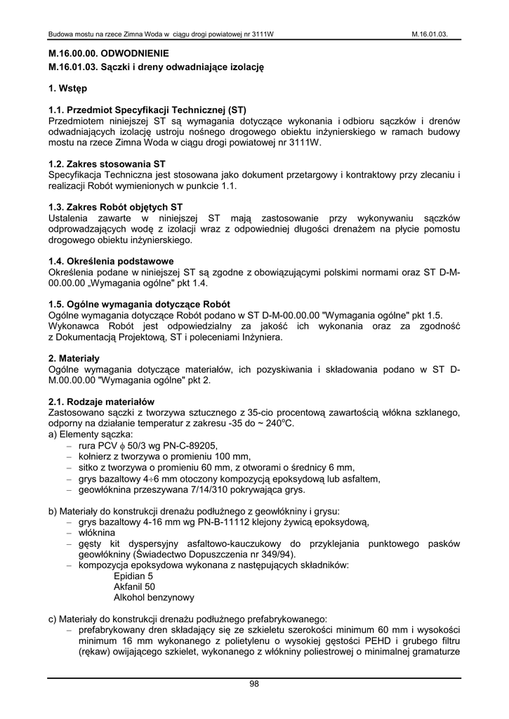 Budowa mostu na rzece Zimna Woda w ciągu drogi powiatowej nr 3111W M.16.01.03. M.16.00.00. ODWODNIENIE M.16.01.03. Sączki i dreny odwadniające izolację 1. Wstęp 1.1. Przedmiot Specyfikacji Technicznej (ST) Przedmiotem niniejszej ST są wymagania dotyczące wykonania i odbioru sączków i drenów odwadniających izolację ustroju nośnego drogowego obiektu inŜynierskiego w ramach budowy mostu na rzece Zimna Woda w ciągu drogi powiatowej nr 3111W. 1.2. Zakres stosowania ST Specyfikacja Techniczna jest stosowana jako dokument przetargowy i kontraktowy przy zlecaniu i realizacji Robót wymienionych w punkcie 1.1. 1.3. Zakres Robót objętych ST Ustalenia zawarte w niniejszej ST mają zastosowanie przy wykonywaniu sączków odprowadzających wodę z izolacji wraz z odpowiedniej długości drenaŜem na płycie pomostu drogowego obiektu inŜynierskiego. 1.4. Określenia podstawowe Określenia podane w niniejszej ST są zgodne z obowiązującymi polskimi normami oraz ST D-M00.00.00 „Wymagania ogólne" pkt 1.4. 1.5. Ogólne wymagania dotyczące Robót Ogólne wymagania dotyczące Robót podano w ST D-M-00.00.00 "Wymagania ogólne" pkt 1.5. Wykonawca Robót jest odpowiedzialny za jakość ich wykonania oraz za zgodność z Dokumentacją Projektową, ST i poleceniami InŜyniera. 2. Materiały Ogólne wymagania dotyczące materiałów, ich pozyskiwania i składowania podano w ST DM.00.00.00 "Wymagania ogólne" pkt 2. 2.1. Rodzaje materiałów Zastosowano sączki z tworzywa sztucznego z 35-cio procentową zawartością włókna szklanego, odporny na działanie temperatur z zakresu -35 do ~ 240oC. a) Elementy sączka: – rura PCV φ 50/3 wg PN-C-89205, – kołnierz z tworzywa o promieniu 100 mm, – sitko z tworzywa o promieniu 60 mm, z otworami o średnicy 6 mm, – grys bazaltowy 4÷6 mm otoczony kompozycją epoksydową lub asfaltem, – geowłóknina przeszywana 7/14/310 pokrywająca grys. b) Materiały do konstrukcji drenaŜu podłuŜnego z geowłókniny i grysu: – grys bazaltowy 4-16 mm wg PN-B-11112 klejony Ŝywicą epoksydową, – włóknina – gęsty kit dyspersyjny asfaltowo-kauczukowy do przyklejania punktowego pasków geowłókniny (Świadectwo Dopuszczenia nr 349/94). – kompozycja epoksydowa wykonana z następujących składników: Epidian 5 Akfanil 50 Alkohol benzynowy c) Materiały do konstrukcji drenaŜu podłuŜnego prefabrykowanego: – prefabrykowany dren składający się ze szkieletu szerokości minimum 60 mm i wysokości minimum 16 mm wykonanego z polietylenu o wysokiej gęstości PEHD i grubego filtru (rękaw) owijającego szkielet, wykonanego z włókniny poliestrowej o minimalnej gramaturze 98 Budowa mostu na rzece Zimna Woda w ciągu drogi powiatowej nr 3111W M.16.01.03. 150 g/m2. Zastosowany dren powinien spełniać następujące wymagania: odporność na wysoką temperaturę ≥200oC, wytrzymałość na ściskanie, co najmniej 750 kPa, – geowłóknina przeszywana 7/14/310, – gęsty kit dyspersyjny asfaltowo-kauczukowy do przyklejania punktowego pasków geowłókniny. Prefabrykowany dren powinien być odporny na temperaturę układanego asfaltu lanego tj. 190210oC. d) Rurki Dla odprowadzenia wody z sączka naleŜy stosować rurki z PCV o średnicy ∅ 50-70 mm. Rurki i kształtki z PCV powinny spełniać wymagania PN-C-89205. Wykonawca przedstawi aktualne w chwili stosowania Aprobaty Techniczne. Dopuszcza się stosowanie innych materiałów, o ile spełniają warunki ST oraz mają pozytywną opinię IBDiM, potwierdzoną jednym z powyŜszych dokumentów. 2.2. Składowanie materiałów Warunki przechowywania materiałów nie mogą powodować utraty ich cech lub obniŜenia ich jakości. Składniki kompozycji Ŝywic oraz dreny naleŜy przechowywać w opakowaniach oryginalnych, szczelnie zamkniętych, w pomieszczeniach suchych i przewiewnych. Sączki PCV powinny być składowane w kompletach w opakowaniach producenta. 3. Sprzęt Ogólne wymagania dotyczące sprzętu podano w ST D-M-00.00.00 "Wymagania ogólne" pkt 3. Jakikolwiek sprzęt, maszyny lub narzędzia nie gwarantujące wymagań jakościowych Robót i bezpieczeństwa zostaną przez InŜyniera zdyskwalifikowane i nie dopuszczone do Robót. Roboty montaŜowe powinny być przeprowadzone ręcznie. 4. Transport Ogólne wymagania dotyczące transportu podano w ST D-M-00.00.00 "Wymagania ogólne" pkt 4. Materiały mogą być przewoŜone dowolnymi środkami transportu tak dobranymi, aby nie powodować obniŜenia jakości materiałów oraz zgodnie z zaleceniami producentów. 5. Wykonanie Robót Ogólne zasady wykonania Robót podano w ST D-M-00.00.00 "Wymagania ogólne" pkt 5. MontaŜ sączków odwodnienia izolacji powinien przebiegać zgodnie z Dokumentacją Projektową przy zachowaniu szczególnej dokładności i staranności wykonania. 5.1. Wykonanie odwodnienia izolacji Sączki Sączki naleŜy umieścić przed betonowaniem płyty pomostu i tak ustabilizować, by w czasie betonowania i wibrowania betonu nie zmieniły swego połoŜenia. NaleŜy zwrócić uwagę, aby sączki były usytuowane dokładnie w osi ścieku i w czasie betonowania płyty pomostu nie wystawały ponad płytę, lecz były nieco poniŜej wierzchu płyty (ok. 0,5 cm). Rozstaw sączków nie rzadziej niŜ 3,0 m. Po ułoŜeniu betonu naleŜy sprawdzić droŜność rury spustowej, usunąć ewentualne zanieczyszczenia. Izolację płyty pomostu naleŜy wprowadzić na górną powierzchnię kołnierza sączka, aby woda z izolacji wpływała do sączka. Przed wykonaniem warstwy nawierzchni naleŜy wypełnić kołnierz sączka grysem. Sączki naleŜy połączyć do kolektora. Sposób podłączenia do kolektora przedstawi Wykonawca w zaleŜności od przyjętego rozwiązania kolektora. Sposób włączenia sączków do kolektora powinien uniemoŜliwiać wypływ wody na jezdnie pod obiektami lub do rzeki. Do odprowadzenia wody z izolacji pomiędzy sączkami naleŜy wykonać dren podłuŜny. Dreny z geowłókniny i grysu 99 Budowa mostu na rzece Zimna Wod