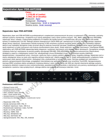 Informacje o produkcie Utworzono 07-03-2017 Rejestrator Aper PDR-AHT2008 Cena : 1.270,00 zł (netto) 1.562,10 zł (brutto) Producent : Aper Dostępność : Dostępny Stan magazynowy : brak w magazynie Średnia ocena : brak recenzji Rejestrator Aper PDR-AHT2008 Podstawowe właściwości ● ● ● ● ● ● ● ● ● ● ● ● ● ● Obsługa 8 kamer AHD Zasięg transmisji do 500 m Kompresja obrazu H.264 Maks. prędkość zapisu 200 kl./s Maks. 2 dyski twarde SATA Oprogramowanie na urządzenia mobilne Automatyczna detekcja standardu i rozdzielczości kamer le ● te ● w iz ja -p r ze m ys lo w a. pl Rejestratory Aper serii PDR-AHT2000 są profesjonalnymi urządzeniami przeznaczonymi do pracy w systemach CCTV, stanowiąc centralny element systemu monitoringu. Urządzenia są w stanie obsługiwać cztery różne systemy wizyjne - PAL, 960H, AHD720p oraz AHD1080p, rejestrując obraz i dźwięk z maksymalną prędkością 25 klatek/s dla każdej kamery w rozdzielczości HD oraz 12,5 klatki/s dla każdej kamery w rozdzielczości Full HD. Obsługa zarówno wewnętrznych (SATA HDD) jak i zewnętrznych (E-SATA) nośników pamięci zapewnia długie okresy rejestracji. Zastosowana metoda kompresji H.264 umożliwia uzyskanie wysokiej jakości obrazu przy niewielkiej zajętości danych oraz niewielkie obciążenie (mały strumień danych) podczas transmisji sieciowej. Dodatkowe zabezpieczenie nagrań gwarantuje opcja rejestracji w trybie lustrzanym oraz funkcja monitorowania stanu dysku. Dzięki wejściom i wyjściom alarmowym i interfejsowi RS485 rejestratory serii PDR-AHT2000 zapewniają łatwą integracje z systemem alarmowym oraz obsługę kamer obrotowych. Zarządzanie rozległą instalacją może być realizowane za pomocą pulpitu sterującego PDR-KBD. PDR-AHD2000 to urządzenie autonomiczne (Stand-alone) działające w oparciu o dedykowany system tzw. wbudowanego Linuxa (Embedded Linux), co gwarantuje wysoka stabilność, bezpieczeństwo i niezawodność pracy. Intuicyjne i graficzne menu w języku polskim zapewnia łatwą i wygodną obsługę. Rejestrator jest w stanie udostępniać obraz na żywo oraz nagrania zarówno lokalnie jak i zdalnie poprzez siec IP. Dzięki wielozadaniowości urządzenie może wykonywać wiele operacji jednocześnie i obsługiwać kilku użytkowników w tym samym czasie. Sieciowy podgląd jest realizowany z poziomu oprogramowania klienckiego, przeglądarki internetowej oraz aplikacji na tablety oraz smartfony TouchCMS. Oprogramowanie sieciowe EMS2 umożliwia zdalne zarządzanie instalacją złożoną z wielu rejestratorów (do 300) jak również stworzenie pełnego systemu zarządzania obiektem (wsparcie pracy wielomonitorowej, powiadamianie użytkowników o zdarzeniach przy pomocy wyskakujących okien, zarządzanie z poziomu map synoptycznych, obsługa zdalna oraz podgląd, archiwizacja materiału i inne). Rejestrator AHD / PAL Kanały kamerowe AHD / PAL: 8 Prędkość rejestracji: maks. 200 kl./s Rozdzielczość rejestracji: maks. Full HD Dyski: 2x S-ATA, eS-ATA Monitory: HDMI, VGA Wej./wyj. dźwiękowe: 8/1 Wej./wyj. alarmowe: 8/1 Oprogramowanie: Win, Mac, iOS, Android Wygenerowano w programie www.oscGold.com pl a. Model Wejścia wizyjne Maksymalne prędkości rejestracji i rozdzielczości obrazu zapisywanego/odtwarzanego PDR-AHT2008 8x Video (BNC) 200 kl./s (4CIF) 200 kl./s (1280 x 720 px 100 kl./s (1920 x 1080 px) PAL / 960H / 720p AHD / 1080p AHD, automatyczne rozpoznawanie systemu H.264 Monitor główny: Video VGA (D-SUB), HDMI 1, 4, 9, 16, sekwencja Maksymalnie 1920 x 1080 px Maks. 400 kl./s 25 kl./s na kanał Tak 8x Audio (RCA); 1 Vpp, 600 Ω 1x Audio (RCA) 8 (złącze zaciskowe, beznapięciowe NC/NO) 1x złącze zaciskowe Embedded Linux Heksapleks Panel przedni rejestratora, mysz, oprogramowanie sieciowe (do 300 urządzeń) Komputer: oprogramowanie sieciowe EMS2, przeglądarka internetowa (IE), PC/Mac (iOS) Telefon komórkowy: Android/iOS (iPhone/iPad)/WindowsPhone RS-485, 2x USB 2.0, Ethernet 10Base-T/100Base-TX (RJ-45), E-SATA LAN / MAN / WAN / Internet TCP/IP, DHCP, DDNS, SMTP, NTP 2x Dysk twardy SATA, E-SATA 6 TB Normalny (ręczna), harmonogram; Ciągły, z detekcją ruchu (z zapisem przed i po detekcji), alarmowy (z zapisem przed- i poalarmowym); Liniowy, cykliczny Kalendarz, SmartSearch Nośniki Flash USB (np. PenDrive), komputer (z pomocą oprogramowania klienta sieciowego); w iz ja -p r Obsługiwane systemy wizyjne Rodzaj kompresji Wyjścia wizyjne Wyświetlanie obrazu na monitorze głównym Rozdzielczość obrazu wyśw. poj. w czasie rzeczyw. Prędkość wyświetlania obrazu w czasie rzeczyw. (w trybie podziału – 4/8/16 pól) Maski prywatności Wejścia foniczne Wyjścia foniczne ze m ys lo w Specyfikacja: te Wyjścia alarmowe System operacyjny Wielozadaniowość Sterowanie le Wejścia alarmowe Obsługa poprzez sieć IP Interfejsy Obsługiwane sieci Protokoły sieciowe Rejestracja obrazu Maks. pojemność pojedynczego dysku HDD Tryby rejestracji Wyszukiwanie zapisów Archiwizacja obrazu Informacje o produkcie Oprogramowanie współpracujące Inne te le w iz ja -p r ze m ys lo w zadzwoń i zapytaj o rabat (22 672-36-36) (505-130-571) a. pl Zasilanie Zakres temperatury/wilgotność otoczenia pracy Wymiary (szer. x wys. x dł.) EMS(2) - Enhanced Management System (freeware) – oprogramowanie sieciowe, obsługa do 300 rejestratorów, funkcjonalność oprogramowania sieciowego: zdalna konfiguracja rejestratorów, sterowanie pracą, nadzorowanie stanu rejestratorów, zdalny podgląd obrazu „na żywo”, zdalne/lokalne odtwarzanie nagrań, zdalna archiwizacja nagrań, powiadamianie użytkownika, dziennik zdażeń, obsługa wielu monitorów; Przeglądarka internetowa Internet Explorer; McdPlayer (freeware) – odtwarzacz lokalny nagrań; Telefon komórkowy/urządzenie mobilne: iPhone, iPad, Android, obsługa Push Service Konfiguracja uprawnień użytkowników. Ukrywanie kamer. Wysyłanie e-maili z informacją o zdarzeniach. Monitorowanie/