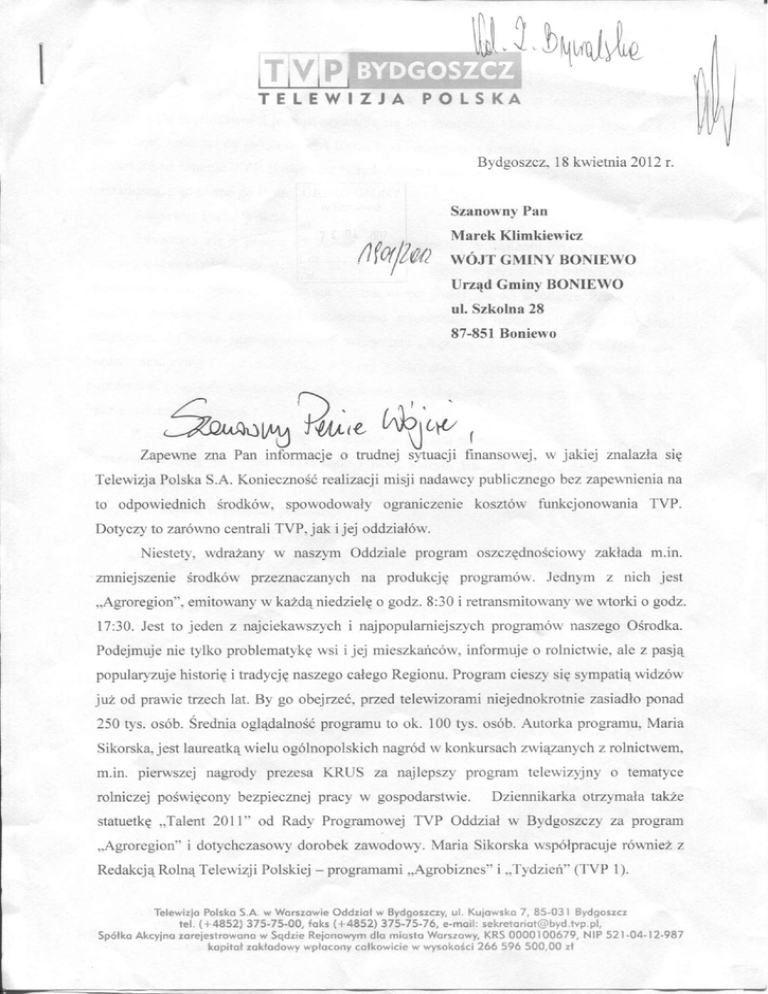 TELEWIZJA POLSKA Bydgoszcz, 18 kwietnia 2012 r. Szanowny Pan Marek Klimkiewicz WÓJT GMINY BONIEWO Urząd Gminy BONIEWO ul. Szkolna 28 87-851 Boniewo Zapewne zna Pan informacje o trudnej sytuacji finansowej, w jakiej znalazła się Telewizja Polska S.A. Konieczność realizacji misji nadawcy publicznego bez zapewnienia na to odpowiednich środków, spowodowały ograniczenie kosztów funkcjonowania TVP. Dotyczy to zarówno centrali TVP, jak i jej oddziałów. Niestety, wdrażany w naszym Oddziale program oszczędnościowy zakłada m.in. zmniejszenie środków przeznaczanych na produkcję programów. Jednym z nich jest „Agroregion", emitowany w każdą niedzielę o godz. 8:30 i retransmitowany we wiórki o godz. 17:30. Jest to jeden z najciekawszych i najpopularniejszych programów naszego Ośrodka. Podejmuje nie tylko problematykę wsi i jej mieszkańców, informuje o rolnictwie, ale z pasją popularyzuje historię i tradycję naszego całego Regionu. Program cieszy się sympatią widzów już od prawie trzech lat. By go obejrzeć, przed telewizorami niejednokrotnie zasiadło ponad 250 tys. osób. Średnia oglądalność programu to ok. 100 tys. osób. Autorka programu, Maria Sikorska, jest laureatką wielu ogólnopolskich nagród w konkursach związanych z rolnictwem, m.in. pierwszej nagrody prezesa KRUS za najlepszy program telewizyjny o tematyce rolniczej poświęcony bezpiecznej pracy w gospodarstwie. Dziennikarka otrzymała także statuetkę „Talent 2011" od Rady Programowej TVP Oddział w Bydgoszczy za program „Agroregion" i dotychczasowy dorobek zawodowy. Maria Sikorska współpracuje również z Redakcją Rolną Telewizji Polskiej - programami „Agrobiznes" i „Tydzień" (TVP 1). Telewizja Polska S.A. w Warszawie Oddział w Bydgoszczy, ul. Kujawska 7, 85-031 Bydgoszcz tel. ( + 4852) 375-75-00, faks ( + 4 8 5 2 ) 375-75-76, e-mail: [email protected], Spółka Akcyjna zarejestrowano w Sgdzie Rejonowym dla miasta Warszawy, KRS 0000100679, NIP 521-04-12-987 kapitał zakładowy wpłacony całkowicie w wysokości 266 596 500,00 zł Niestety, nie stać nas na finansowanie „Agroregionu'' w obecnym zakresie. Zmniejszenie częstotliwości jego ukazywania się lub drastyczne skrócenie jego czasu emisji spowoduje, że utraci on swoją obecną formę i pod ogromnym znakiem zapytania stanie jego przyszłość na antenie TVP Bydgoszcz. Chcielibyśmy uniknąć spełnienia się tego czarnego scenariusza, stąd pismo do Pana. Szanowny Panie Wójcie, Zwracamy się z prośbą o udzielenie nam pomocy w ocaleniu „Agroregionu". Nie prosimy o darowizny! - nic podobnego. Prosimy o pomoc w pozyskaniu reklamodawców i sponsorów, wiemy bowiem, że nikt tak nie zna swojej gminy, jak jej Włodarze. Prosimy też o życzliwe rozważenie możliwości zacieśnienia współpracy z naszą Telewizją. Urzędom, instytucjom i firmom zainteresowanym wsparciem „Agroregionu". mamy do zaoferowania bardzo atrakcyjne - preferencyjne pakiety reklamowe i sponsorskie. Zważywszy na popularność programu i jego zasięg, zapewniamy, że każda zainwestowana w niego złotówka będzie świetną inwestycją. Prosimy więc Pana o podjęcie kontaktu z działem marketingu TVP Bydgoszcz oraz rozpowszechnienie tego listu wśród osób i firm, którym tak jak nam. zależy na rozwoju naszego Regionu. Do Pańskiej dyspozycji pozostają: Maria Sikorska, tel. 501374041 Michał Grzybowski tel. 501585964 Korzystając z okazji pragniemy przekazać wyrazy naszego szacunku. szak Telewizja Polska S.A. w Warszawie Oddział w Bydgoszczy, ul. Kujawska 7, 85-031 Bydgoszcz tel. ( + 4852) 375-75-00, faks ( + 4852) 375-75-76, e-mail: [email protected], Spółka Akcyjna zarejestrowana w Sądzie Rejonowym dla miasta Warszawy, KRS 0000100679, NIP 521-04-12-987 kapitał zakładowy wpłacony całkowicie w wysokości 266 596 500,00 zł