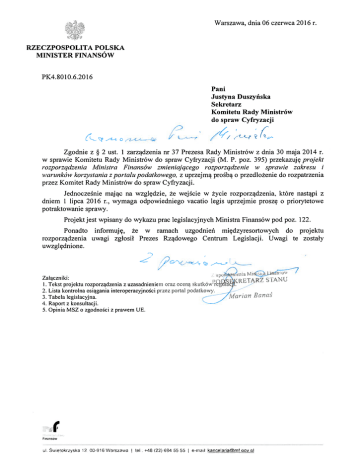 Warszawa, dnia 06 czerwca 2016 r. RZECZPOSPOLITA POLSKA MINISTER FINANSÓW PK4.8010.6.2016 Pani Justyna Duszyńska Sekretarz Komitetu Rady Ministrów do spraw Cyfryzacji / ,/Uy L ę l Zgodnie z § 2 ust. 1 zarządzenia nr 37 Prezesa Rady Ministrów z dnia 30 maja 2014 r. w sprawie Komitetu Rady Ministrów do spraw Cyfryzacji (M. P. poz. 395) przekazuję projekt rozporządzenia Ministra Finansów zmieniającego rozporządzenie w sprawie zakresu i warunków korzystania z portalu podatkowego, z uprzejmą prośbą o przedłożenie do rozpatrzenia przez Komitet Rady Ministrów do spraw Cyfryzacji. Jednocześnie mając na względzie, że wejście w życie rozporządzenia, które nastąpi z dniem 1 lipca 2016 r., wymaga odpowiedniego vacatio legis uprzejmie proszę o priorytetowe potraktowanie sprawy. Projekt jest wpisany do wykazu prac legislacyjnych Ministra Finansów pod poz. 122. Ponadto informuję, że w ramach uzgodnień międzyresortowych do projektu rozporządzenia uwagi zgłosił Prezes Rządowego Centrum Legislacji. Uwagi te zostały uwzględnione. Załączniki: 1. Tekst projektu rozporządzenia z uzasadnienie 2. Lista kontrolna osiągania interoperacyjności | 3. Tabela legislacyjna. 4. Raport z konsultacji. 5. Opinia MSZ o zgodności z prawem UE. i Finansów ui. Świętokrzyska 12 00-916 Warszawa | tel.+48 (22) 694 55 55 | e-mai! [email protected]