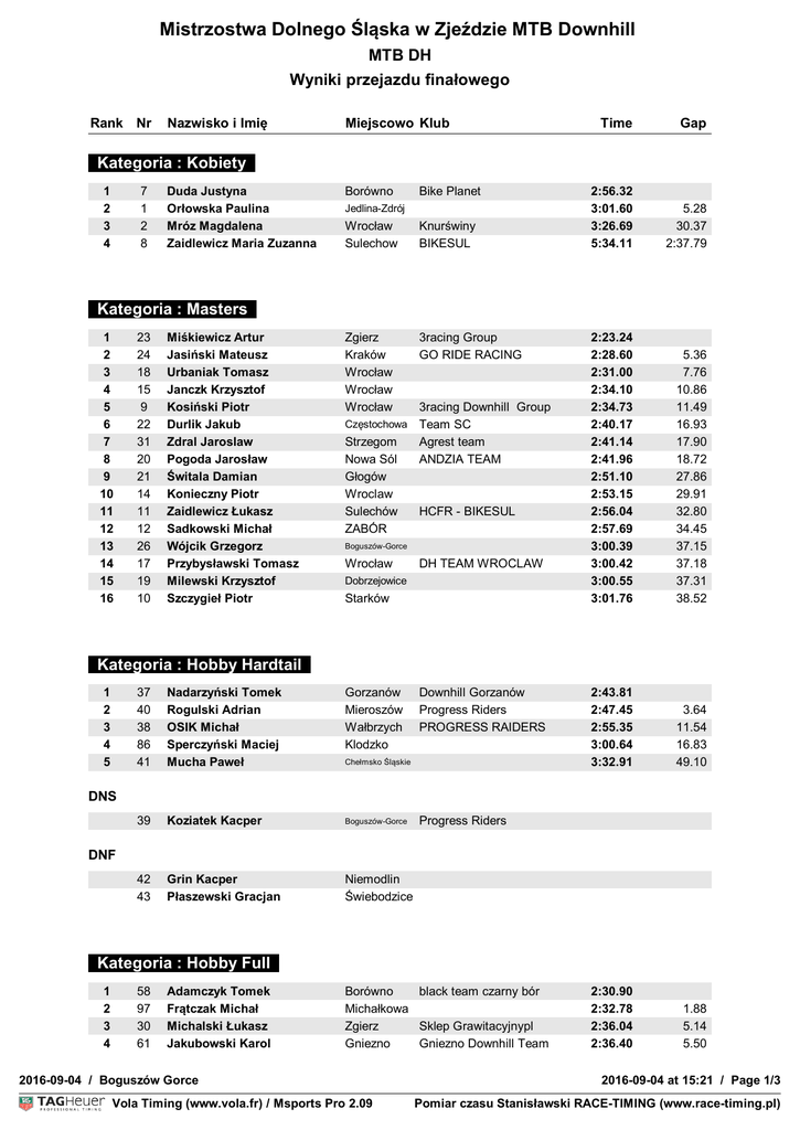Mistrzostwa Dolnego Śląska w Zjeździe MTB Downhill MTB DH Wyniki przejazdu finałowego Rank Nr Nazwisko i Imię Miejscowość Klub Time Gap 2:56.32 3:01.60 3:26.69 5:34.11 5.28 30.37 2:37.79 2:23.24 2:28.60 2:31.00 2:34.10 2:34.73 2:40.17 2:41.14 2:41.96 2:51.10 2:53.15 2:56.04 2:57.69 3:00.39 3:00.42 3:00.55 3:01.76 5.36 7.76 10.86 11.49 16.93 17.90 18.72 27.86 29.91 32.80 34.45 37.15 37.18 37.31 38.52 2:43.81 2:47.45 2:55.35 3:00.64 3:32.91 3.64 11.54 16.83 49.10 2:30.90 2:32.78 2:36.04 2:36.40 1.88 5.14 5.50 Kategoria : Kobiety 1 2 3 4 7 1 2 8 Duda Justyna Orłowska Paulina Mróz Magdalena Zaidlewicz Maria Zuzanna Borówno Bike Planet Jedlina-Zdrój Wrocław Sulechow Knurświny BIKESUL Zgierz Kraków Wrocław Wrocław Wrocław 3racing Group GO RIDE RACING Kategoria : Masters 1 2 3 4 5 6 7 8 9 10 11 12 13 14 15 16 23 24 18 15 9 22 31 20 21 14 11 12 26 17 19 10 Miśkiewicz Artur Jasiński Mateusz Urbaniak Tomasz Janczk Krzysztof Kosiński Piotr Durlik Jakub Zdral Jaroslaw Pogoda Jarosław Świtala Damian Konieczny Piotr Zaidlewicz Łukasz Sadkowski Michał Wójcik Grzegorz Przybysławski Tomasz Milewski Krzysztof Szczygieł Piotr Częstochowa Strzegom Nowa Sól Głogów Wroclaw Sulechów ZABÓR 3racing Downhill Group Team SC Agrest team ANDZIA TEAM HCFR - BIKESUL Boguszów-Gorce Wrocław DH TEAM WROCLAW Dobrzejowice Starków Kategoria : Hobby Hardtail 1 2 3 4 5 37 40 38 86 41 Nadarzyński Tomek Rogulski Adrian OSIK Michał Sperczyński Maciej Mucha Paweł Gorzanów Mieroszów Wałbrzych Klodzko 39 Koziatek Kacper Boguszów-Gorce 42 43 Grin Kacper Płaszewski Gracjan Niemodlin Świebodzice Downhill Gorzanów Progress Riders PROGRESS RAIDERS Chełmsko Śląskie DNS Progress Riders DNF Kategoria : Hobby Full 1 2 3 4 58 97 30 61 Adamczyk Tomek Frątczak Michał Michalski Łukasz Jakubowski Karol Borówno black team czarny bór Michałkowa Zgierz Sklep Grawitacyjnypl Gniezno Gniezno Downhill Team 2016-09-04 / Boguszów Gorce Vola Timing (www.vola.fr) / Msports Pro 2.09 2016-09-04 at 15:21 / Page 1/3 VolaSoftControlPdf Pomiar czasu Stanisławski RACE-TIMING (www.race-timing.pl) Mistrzostwa Dolnego Śląska w Zjeździe MTB Downhill MTB DH Wyniki przejazdu finałowego Rank Nr 5 6 7 8 9 10 11 12 13 14 15 16 17 18 19 20 21 22 23 24 25 26 27 28 29 30 31 32 33 34 35 36 37 38 39 40 41 42 43 44 Nazwisko i Imię Miejscowość Klub 88 33 83 67 94 32 93 64 62 87 91 76 78 95 63 89 84 92 90 59 75 60 74 80 81 99 68 66 72 96 77 69 65 98 73 71 85 79 82 34 Pucek Kacper Ludwisiak Rafał Drogosz Damian Rękoś Maciej Bojakowski Andrzej Foitzik Maciej Tyrek Dawid Zając Radosław Chodzicki Hubert Ślepko Szymon Gmurczyk Jacek Szlędak Paweł Krasowski Michał Kaliciński Jakub Karbowy Miłosz Puzanowski Krzysztof Rybczyński Tomasz Rękoś Jacek Florczyk Jakub Boroski Jakub Pilimon Piotr Kudłaty Tomasz Banach Piotr Molak Karol Frańczuk Michał Sowa Dominik Chomko Rafał Rękoś Paweł Tłusty Jakub Romać Dawid Cichoński Maciej Susło Patryk Mielczarek Michał Humeniuk Michał Abramowicz Kamil Szumny Tomasz Stypuła Dominik Skrzypczak Igor Gawłowicz Łukasz Mokijewski Marcin Wrocław Kowary Trzebnica Mierzów Wrocław 70 Kowalczyk Bartosz Wrocław 57 Foitzik Oskar Jelenia Góra 100 Chomko Maciej Witków Śląski BIKEPLANET Jelenia Góra Jawor Gorzanów Gniezno Świdnica Bydgoszcz Wałbrzych Legnica Niemodlin Gniezno Wrocław Trzebnica Mierzów Legnica Jawor Legnica Jawor Strzegom Wałbrzych Wrocław Wrocław Gniezno Downhill Team KWO Riders Niemo Free Riders Gniezno Downhill Team Witków Śląski Mierzów Jawor Lubin ĘDURO HARATANIE Chojnów Kiełczów Sokołowsko Progress Riders Oława Boguszów-Gorce Progress Riders Jawor Kłodzko opole Wałbrzych Wrocław Time Gap 2:36.69 2:37.79 2:38.69 2:38.81 2:39.13 2:40.90 2:41.00 2:41.80 2:42.62 2:42.73 2:43.15 2:43.88 2:47.02 2:47.95 2:48.40 2:49.50 2:49.81 2:50.30 2:50.58 2:53.09 2:53.22 2:54.30 2:56.93 2:57.39 2:57.73 2:58.61 2:59.32 3:02.62 3:02.72 3:03.04 3:08.92 3:10.63 3:10.84 3:14.94 3:16.61 3:21.12 3:26.34 3:39.82 3:47.86 4:02.34 5.79 6.89 7.79 7.91 8.23 10.00 10.10 10.90 11.72 11.83 12.25 12.98 16.12 17.05 17.50 18.60 18.91 19.40 19.68 22.19 22.32 23.40 26.03 26.49 26.83 27.71 28.42 31.72 31.82 32.14 38.02 39.73 39.94 44.04 45.71 50.22 55.44 1:08.92 1:16.96 1:31.44 DNS DNF DSQ 2016-09-04 / Boguszów Gorce Vola Timing (www.vola.fr) / Msports Pro 2.09 2016-09-04 at 15:21 / Page 2/3 VolaSoftControlPdf Pomiar czasu Stanisławski RACE-TIMING (www.race-timing.pl) Mistrzostwa Dolnego Śląska w Zjeździe MTB Downhill MTB DH Wyniki przejazdu finałowego Rank Nr Nazwisko i Imię Miejscowość Klub Time Gap 2:26.10 2:28.98 2:30.96 2:36.10 2:40.50 2.88 4.86 10.00 14.40 Kategoria : Elita 1 2 3 4 5 55 48 51 47 16 Sokalski Adrian Zalewski Rafał Kostusiak Mateusz Kruczkowski Rafał Smolak Łukasz Chełm Śląski Gorzanów Zgierz Lubin Trzebnica Husqvarna Racing DH Gorzanów 49 Szymczuk Łukasz Boguszów-Gorce KKW Jama Wałbrzych XC MARIN Bikes Gravity Revolt Ęduro Haratanie DNS 2016-09-04 / Boguszów Gorce Vola Timing (www.vola.fr) / Msports Pro 2.09 2016-09-04 at 15:21 / Page 3/3 VolaSoftControlPdf Pomiar czasu Stanisławski RACE-TIMING (www.race-timing.pl)