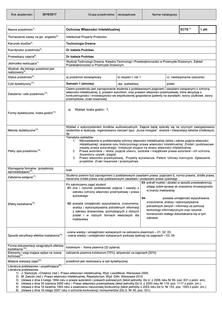 Rok akademicki: Grupa przedmiotów: obowiązkowe 2016/2017 Nazwa przedmiotu1): Ochrona Własności Intelektualnej Tłumaczenie nazwy na jęz. angielski3): Intellectual Property Protection 4) Kierunek studiów : Numer katalogowy: ECTS 2) 1 pkt Technologia Drewna Koordynator przedmiotu5): Dr Izabela Podobas 6) Prowadzący zajęcia : Dr Izabela Podobas Jednostka realizująca7): Wydział Technologii Drewna, Katedra Technologii i Przedsiębiorczości w Przemyśle Drzewnym, Zakład Przedsiębiorczości w Przemyśle Drzewnym Wydział, dla którego przedmiot jest realizowany8): Status przedmiotu9): a) przedmiot obowiązkowy b) stopień I, rok 1 c) niestacjonarne (zaoczne) Cykl dydaktyczny : Semestr 1 (zimowy) Jęz. wykładowy: polski Założenia i cele przedmiotu12): Celem przedmiotu jest zaznajomienie studenta z podstawowymi pojęciami i zasadami związanymi z ochroną własności intelektualnej, tj. prawem autorskim, oraz prawem własności przemysłowej, które decydują o konkurencyjności i innowacyjności we współczesnej gospodarce [patenty na wynalazki, wzory użytkowe, wzory przemysłowe, znaki towarowe] 10) a) Wykład; liczba godzin - 7; Formy dydaktyczne, liczba godzin13): Wykład z wykorzystaniem środków audiowizualnych. Zajęcia będą opierały się na czynnym zaangażowaniu studentów w dyskusję, organizowaniu ćwiczeń typu: „burza mózgów”, analizie i interpretacji tekstów źródłowych, itp. Tematyka wykładów: 1. Wprowadzenie w problematykę ochrony własności intelektualnej (istota i zakres pojęcia własności intelektualnej); ukazanie rysu historycznego prawa własności intelektualnej; Źródeł i podstawowe zasady prawa autorskiego. Instytucje stojące na straży własności intelektualnej 2. Prawa autorskie – istota, pojęcie utworu, osobiste i majątkowe prawa autorskie i ich ochrona, dozwolony użytek, plagiat. 3. Prawo własności przemysłowej. Projekty wynalazcze. Patent. Umowy licencyjne. Zgłaszanie projektów. Znaki towarowe i przemysłowe Metody dydaktyczne14): Pełny opis przedmiotu15): Wymagania formalne (przedmioty wprowadzające)16): brak Studenci powinni być zaznajomieni z podstawowymi zasadami prawa, pojęciami tj. norma prawna, źródła prawa, hierarchia źródeł prawa oraz podstawowymi zasadami i przepisami prawa cywilnego. 03- potrafi myśleć i działać w sposób przedsiębiorczy, Po zakończeniu zajęć student: zdając sobie sprawę ze znaczenia innowacyjności 01- zna i rozumie podstawowe pojęcia i zasady z w branży meblarskiej zakresu ochrony własności przemysłowej i prawa Założenia wstępne17): autorskiego 02- posiada umiejętność wyszukiwania, zrozumienia, analizy i wykorzystywania potrzebnych informacji z zakresu drzewnictwa, pochodzących z różnych źródeł i w różnych formach właściwych dla meblarstwa 18) Efekty kształcenia : Sposób weryfikacji efektów kształcenia19): 04- posiada umiejętność wyszukiwania, zrozumienia, analizy i wykorzystywania potrzebnych danych i informacji za pomocą technologii informatycznych oraz rozumie konieczność stałego dokształcania się w tym zakresie - ocena wiedzy i umiejętności wykazanych na zaliczeniu pisemnym – 01, 02, 03, - ocena wiedzy i umiejętności wykazanych podczas dyskusji na zajęciach – 03, 04 Forma dokumentacji osiągniętych efektów kolokwium - forma pisemna (22 pytania) kształcenia 20): Elementy i wagi mające wpływ na ocenę zaliczenie pisemne kolokwium [70%], aktywność na zajęciach [30%] końcową21): Miejsce realizacji zajęć22): przedmiot jest realizowany w sali dydaktycznej 23) Literatura podstawowa i uzupełniająca : Literatura podstawowa: 1) J. Sieńczyło –Chlabicz (red.), Prawo własności intelektualnej, Wyd. LexisNexis, Warszawa 2009; 2) M. Załucki (red.), Prawo własności intelektualnej. Repetytorium, Wyd. Difin, Warszawa 2010; 3) Ustawa z dnia 4 lutego 1994 roku o prawie autorskim i prawach pokrewnych (tekst jednolity: Dz.U. z 2006 roku Nr 90, poz. 631 z późn. zm); 4) Ustawa z dnia 30 czerwca 2000 roku – Prawo własności przemysłowej (tekst jednolity Dz.U. z 2003 roku Nr 119, poz. 1117 z późn. zm.); 5) Ustawa z dnia 16 kwietnia 1993 roku o zwalczaniu nieuczciwej konkurencji (tekst jednolity z 2003 roku Dz.U. Nr 153, poz. 1503 z późn. zm.); 6) Ustawa z dnia 16 lutego 2007 roku o ochronie konkurencji i konsumentów (Dz.U. Nr 50, poz. 331). 1) 2) 3) 4) 5) 6) Literatura uzupełniająca: Barta, R. Markiewicz, Prawo autorskie. Przepisy, orzecznictwo, umowy międzynarodowe, Warszawa 2002; Dom Wyd. ABC – Warszawa 2005 J. Barta, R. Markiewicz, Prawo autorskie i prawa pokrewne, Kraków 2005; E. Nowińska, Promińska U., Vall Michał, Prawo własności przemysłowej, Warszawa 2007. Sozański J., Własność przemysłowa i intelektualna w Unii Europejskiej, Warszawa-Poznań 2005. Podobas I., Industrial property protection as a tool of building competitive advantage of furniture businesses in Poland, [w:] Annals of Warsaw University of Life Sciences - SGGW. Forestry and Wood Technology 2015, nr 89, s. 101-105. Podobas I., Industrial design right`s in the furniture industry, [w:] -Annals of Warsaw University of Life Sciences - SGGW. Forestry and Wood Technology 2016, nr 94, s. 89-95. UWAGI24): Wskaźniki ilościowe charakteryzujące moduł/przedmiot25) : Szacunkowa sumaryczna liczba godzin pracy studenta (kontaktowych i pracy własnej) niezbędna dla osiągnięcia zakładanych efektów kształcenia18) - na tej podstawie należy wypełnić pole ECTS2: 27 h Łączna liczba punktów ECTS, którą student uzyskuje na zajęciach wymagających bezpośredniego udziału nauczycieli akademickich: 0, 4 ECTS Łączna liczba punktów ECTS, którą student uzyskuje w ramach zajęć o charakterze praktycznym, takich jak zajęcia laboratoryjne, projektowe, itp.: Tabela zgodności kierunkowych efektów kształcenia efektami przedmiotu 26) Nr /symbol efektu 01 02 03 04 Wymienione w wierszu efekty kształcenia: zna i rozumie podstawowe pojęc