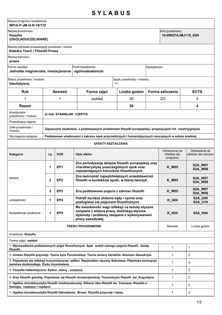 SYLABUS Nazwa programu kształcenia: WPiA-P-JM-O-N-16/17Z Nazwa przedmiotu: Kod przedmiotu: filozofia (OGÓLNOUCZELNIANE) 10.0WI27AJMJ119_92N Nazwa jednostki prowadzącej przedmiot / moduł: Katedra Teorii i Filozofii Prawa Nazwa kierunku: prawo Forma studiów: Profil kształcenia: Specjalność: Jednolite magisterskie, niestacjonarne ogólnoakademicki Status przedmiotu / modułu: Język przedmiotu / modułu: --- fakultatywny Rok Semestr Forma zajęć Liczba godzin Forma zaliczenia ECTS 1 1 wykład 30 ZO 4 Razem Koordynator przedmiotu / modułu: 30 4 dr hab. STANISŁAW CZEPITA Prowadzący zajęcia: Cele przedmiotu / modułu: Zapoznanie studentów z podstawowymi problemami filozofii europejskiej i propozycjami ich rozstrzygnięcia. Wymagania wstępne: Podstawowe wiadomości z zakresu nauk przyrodniczych i humanistycznych nauczanych w szkole średniej. EFEKTY KSZTAŁCENIA Kategoria wiedza umiejętności kompetencje społeczne Lp KOD Opis efektu 1 EP1 Zna periodyzację dziejów filozofii europejskiej oraz charakterystykę poszczególnych epok oraz najważniejszych kierunków filozoficznych. 2 EP2 3 1 1 Odniesienie do efektów dla programu Odniesienie do efektów dla obszaru K_W05 S2A_W07 S2A_W08 Zna twórczość najwybitniejszych przedstawicieli filozofii w kontekście epoki, w której tworzyli. K_W05 S2A_W07 S2A_W08 EP3 Zna podstawowe pojęcia z zakresu filozofii. K_W05 S2A_W07 S2A_W08 EP4 Potrafi wyrażać złożone sądy i opinie oraz posługiwać się pojęciami filozoficznymi. K_U04 S2A_U09 S2A_U10 EP5 Ma świadomość wagi refleksji na tematy etyczne związane z własną pracą, dostrzega etyczne dylematy i problemy związane z wykonywaniem pracy zawodowej. K_K05 S2A_K04 Semestr Liczba godzin TREŚCI PROGRAMOWE Przedmiot: filozofia Forma zajęć: wykład 1. Wprowadzenie podstawowych pojęć filozoficznych. Spór wokół samego pojęcia filozofii. Działy filozofii. 1 1 2. Jońska filozofia przyrody. Teoria bytu Parmenidesa. Teoria zmiany Heraklita. Atomizm Demokryta. 1 2 3. Pojawienie się refleksji humanistycznej: sofiści. Racjonalizm etyczny Sokratesa. Platońska koncepcja państwa doskonałego. Etyka Arystotelesa. 1 4 4. Filozofia hellenistyczna: Epikur, stoicy , sceptycy. 1 2 5. Kres filozofii greckiej. Pojawienie się filozofii chrześcijańskiej. Teocentryzm filozofii św. Augustyna. 1 2 6. Ogólna charakterystyka filozofii średniowiecznej. Główne idee filozofii św. Tomasza: filozofia a teologia, rządzący i rządzeni. 1 2 7. Ogólna charakterystyka filozofii Odrodzenia. Bruno: filozofia przyrody i etyka. 1 2 1/2 8. Filozofia XVII wieku: Kartezjusz, Pascal. 1 2 9. Oświecenie: religia naturalna, deizm angielski i francuski, ateizm filozoficzny Hume'a. Krytyka kultury Rousseau. Teoria poznania i etyka Kanta. 1 4 10. Comte i pozytywizm. 1 1 11. Dialektyka Hegla. Teoria formacji społecznej Marksa 1 3 12. Nietzsche : krytyka kultury. Freuda antropologia i koncepcja kultury 1 2 13. Personalizm chrześcijański. 1 2 14. Egzystencjalizm ateistyczny Sartre'a. 1 1 Metody kształcenia Metoda nauczania teoretycznego, przy zastosowaniu tzw. eksperymentu myślowego i logicznych schematów wnioskowania i uzasadniania. Nr efektu kształcenia z sylabusa Metody weryfikacji efektów kształcenia EP1,EP2,EP3,EP4,E P5 Przedmiot kończy się zaliczeniem na ocenę. Zaliczenie pisemne w formie testu obejmującego materiał z wykładu i zaleconej literatury. Test składa się z 50 pytań. Student może otrzymać maksymalnie 50 pkt. KOLOKWIUM Zasady wyliczania oceny: 3,0 - 60% odpowiedzi poprawnych z pisemnego sprawdzianu, 3,5 - 61-70%, Forma i warunki zaliczenia 4,0 - 71-80%,, 4,5 - 81-90%, 5,0 - 91-100%. Zasady wyliczania oceny z przedmiotu Oceną z przedmiotu jest ocena z kolokwium zaliczeniowego. W. Tatarkiewicz (1990): Historia filozofii. t. 1, 2, 3, PWN, Warszawa Literatura podstawowa W.Tyburski, A.Wachowiak, R.Wiśniewski (2002): Historia filozofii i etyki do współczesności. Żródła i komentarze, TNOiK "Dom Organizatora B. Russell (2000): Dzieje filozofii Zachodu, Fundacja Aletheia, Warszawa Literatura uzupełniająca T. Nagel (2006): Co to wszystko znaczy? Bardzo krótkie wprowadzenie do filozofii, Spacja NAKŁAD PRACY STUDENTA Liczba godzin Zajęcia dydaktyczne 30 Udział w egzaminie/zaliczeniu 2 Przygotowanie się do zajęć 0 Studiowanie literatury 31 Udział w konsultacjach 12 Przygotowanie projektu / eseju / itp. 0 Przygotowanie się do egzaminu/zaliczenia 25 Inne 0 ŁĄCZNY nakład pracy studenta w godz. 100 Liczba punktów ECTS 4 2/2