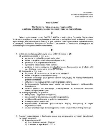 Załącznik Nr 1 do Uchwały Zarządu nr 7/2016 z dnia 12 sierpnia 2016 r. REGULAMIN Konkursu na najlepsze prace magisterskie z zakresu przedsiębiorczości, innowacji i rozwoju regionalnego. §1 Celem ogłoszonego przez SAPERE AUSO - Małopolską Fundację Stypendialną Konkursu na najlepsze prace magisterskie w zakresie przedsiębiorczości, innowacji i rozwoju regionalnego jest popularyzacja wiedzy z tych dziedzin oraz stymulowanie zainteresowania tą tematyką studentów małopolskich uczelni i studentów z Małopolski studiujących na uczelniach poza Województwem Małopolskim. §2 1. Ustala się następującą tematykę prac, o których mowa w §1: a) przedsiębiorczość, w tym m.in.: promocja przedsiębiorczości regionalnej dobre praktyki w dziedzinie przedsiębiorczości promocja kultury przedsiębiorczości społeczna odpowiedzialność biznesu projekty z zakresu rozwoju przedsiębiorczości, finansowane ze środków UE, np. działania realizowane przez MARR S.A. b) innowacje, w tym m.in.: fundusze UE przeznaczone na wsparcie innowacji dobre praktyki w dziedzinie innowacji transfer technologii jako główny czynnik wpływający na rozwój małopolskiej przedsiębiorczości aktywność innowacyjna małopolskich przedsiębiorstw funkcjonowanie funduszy seed capital na rynku lokalnym, ogólnopolskim i światowym analiza podaży na innowacje przedsiębiorstw w wybranych branżach i sektorach gospodarczych. c) rozwój regionalny, w tym m.in.: Małopolska – regionem inwestorów rola inwestycji dla rozwoju gospodarczego regionu możliwości inwestowania w regionie małopolskim rozwój eksportu Małopolski stymulowanie kontaktów gospodarczych między Małopolską a innymi regionami Europy analizy przedsięwzięć inwestycyjnych z terenu województwa małopolskiego §3 1. Nagrody przewidziane w konkursie mogą być przyznawane w trzech dziedzinach i w trzech stopniach: 1) Przedsiębiorczość a) I stopień w wysokości 5 000 zł b) II stopień w wysokości 3 000 zł c) III stopień w wysokości 2 000 zł d) 5 wyróżnień, każde w wysokości 1 000 zł 2) Innowacje a) I stopień w wysokości 5 000 zł b) II stopień w wysokości 3 000 zł c) III stopień w wysokości 2 000 zł d) 5 wyróżnień, każde w wysokości 1 000 zł 3) Rozwój regionalny a) I stopień w wysokości 5 000 zł b) II stopień w wysokości 3 000 zł c) III stopień w wysokości 2 000 zł d) 5 wyróżnień, każde w wysokości 1 000 zł 2. Wysokość nagród jest kwotą brutto. 3. W przypadku wpływu na Konkurs trzech i mniej zgłoszeń w danej kategorii – można przyznać tylko nagrodę jedną nagrodę lub wyróżnienie, a w przypadku wpływu 8 i mniej zgłoszeń – można przyznać wyłącznie trzy nagrody lub wyróżnienia. §4 1. W celu przeprowadzenia Konkursu powołuje się Podkomisję. 2. Wskazania Podkomisji zatwierdzi Komisja ds. Nagród i Stypendiów Fundacji. 3. Zadaniem Podkomisji jest: a. kwalifikacja do oceny nadesłanych prac, b. ocena nadesłanych prac, c. wskazanie prac do nagrodzenia. 4. Zadaniem Komisji ds. Nagród i Stypendiów jest przyznanie Nagród. §5 1. W Konkursie mogą brać udział prace obronione między 01.01.2016 r. a 30.09.2016r., przygotowane przez studentów szkół wyższych z terenu Województwa Małopolskiego oraz studentów innych szkół wyższych stale zameldowanych na terenie Województwa Małopolskiego. 2. Prace konkursowe powinny być napisane w języku polskim. Dopuszcza się prace magisterskie w innym języku, pod warunkiem dostarczenia ich tłumaczeń. 3. Kwalifikują się jedynie prace, które zostały ocenione na egzaminie magisterskim przynajmniej na ocenę dobrą. 4. Prace na Konkurs należy złożyć w Biurze Fundacji Rynek Kleparski 13/8, 31-150 Kraków lub wysłać w terminie do 31 października 2016 r.; (decyduje data wpływu do Biura Fundacji) na adres: Sapere Auso – Małopolska Fundacja Stypendialna Rynek Kleparski 13/8 31-150 Kraków z dopiskiem na kopercie „Konkurs na najlepszą prace magisterską z zakresu przedsiębiorczości, innowacji i rozwoju regionalnego” §6 1. Warunkiem uczestnictwa w Konkursie jest złożenie w terminie wskazanym w § 5 ust. 4: a. pracy magisterskiej w miękkiej oprawie oraz nośniku elektronicznym (podpisana płyta CD), b. formularza zgłoszeniowego stanowiącego załącznik nr 1 do Regulaminu, c. zaświadczenia wydanego przez władze uczelni, potwierdzającego ocenę uzyskaną z pracy oraz fakt, że obrona pracy magisterskiej odbyła się w terminie wskazanym w §5 ust. 1, d. jednostronnego streszczenia pracy magisterskiej, e. recenzji promotora pracy, f. zgody autora i promotora na publikację pracy po korekcji redakcyjnej oraz korzystania z jej treści przez Fundację i Małopolską Agencję Rozwoju Regionalnego S.A. bez uiszczenia honorarium autorskiego. 2. Nadesłane egzemplarze prac stają się własnością organizatora. §7 Rozstrzygniecie Konkursu i wręczenie nagród nastąpi do dnia 31 grudnia 2016 r. Konkurs finansowany jest z darowizny Małopolskiej Agencji Rozwoju Regionalnego S.A.