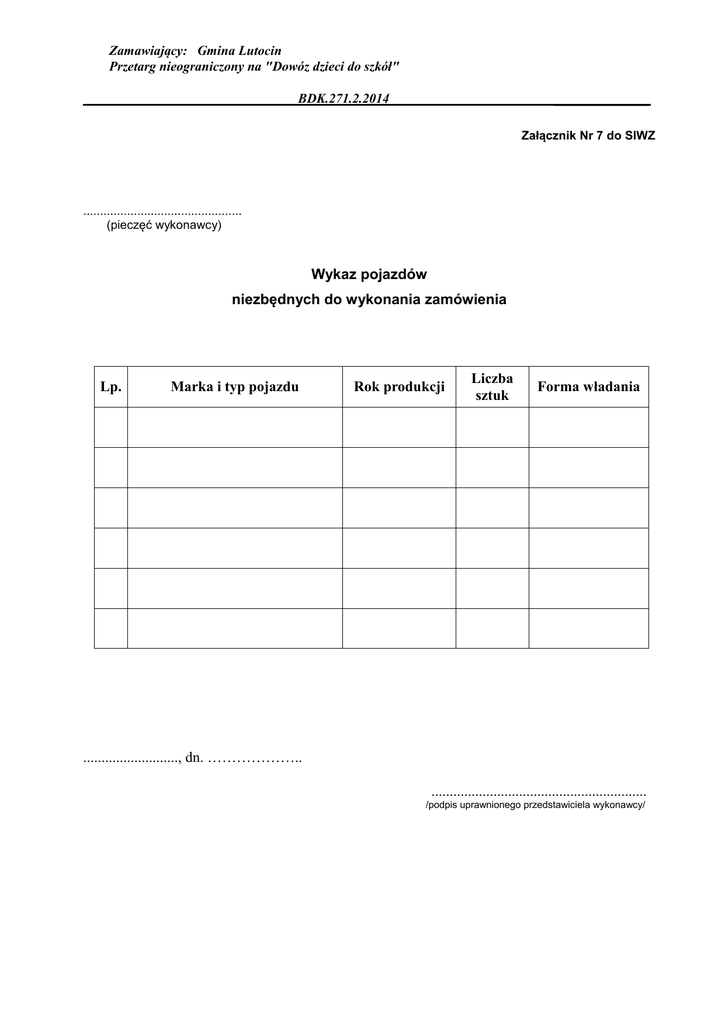 Zamawiający: Gmina Lutocin Przetarg nieograniczony na "Dowóz dzieci do szkół" _____________ BDK.271.2.2014 Załącznik Nr 7 do SIWZ ............................................... (pieczęć wykonawcy) Wykaz pojazdów niezbędnych do wykonania zamówienia Lp. Marka i typ pojazdu Rok produkcji Liczba sztuk Forma władania .........................., dn. ……………….. ........................................................... /podpis uprawnionego przedstawiciela wykonawcy/