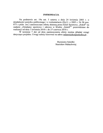 Na podstawie art. 19a ust. 3 ustawy z dnia 24 kwietnia 2003 r. o działalności pożytku publicznego i o wolontariacie (Dz.U. z 2003 r. Nr 96 poz. 873 z późno zm.) zamieszczam ofertę złożoną przez Klub Sportowy "Sokół" na zadanie "Działamy sportowo i zdrowo w Klubie "Sokół"" przewidziane do realizacji od dnia 1 kwietnia 2010 r. do 27 czerwca 2010 r. W terminie 7 dni od dnia zamieszczenia oferty można składać uwagi dotyczące projektu. Uwagi należy kierować na adres [email protected] . Burmistrz Sokółki Stanisław Małachwiej Sokółka, dnia 17 marca 201 Or. (data i miejsce złożenia oferty) ORGANIZACJI POZARZĄDOWEJ REALIZACJI ZADANIA PUBLICZNEGO Działamy sportowo i zdrowo w Klubie "Sokół" Rodzaj zadania: Prowadzenie profilaktycznej działalności informacyjnej edukacyjnej w zakresie rozwiązywania problemów alkoholowych i przeciwdziałania narkomanii, w szczególności dla dzieci i młodzieży, w tym prowadzenie pozalekcyjnych zajęć sportowych, a także działań na rzecz dożywiania dzieci uczestniczących w pozalekcyjnych programach opiekuńczo wychowawczych i socjoterapeutycznych. w okresie od 01 kwietnia 2010r. do 27 czerwca 2010r. Sposób działania: 1. Wspieranie programów promujących zdrowy styl życia wśród dzieci i młodzieży, 2. Wspieranie programów realizowanych przez młodzież, wspieranie wolontariatu. 3. Wspieranie finansowe organizowanych zajęć sportowych. składana na podstawie przepisów działu II rozdziału 2 ustawy z dnia 24 kwietnia 2003 r. o działalności pożytku publicznego i o wolontariacie (Dz. U. Nr 96, poz. 873, z późno zm.) W FORMIE WSPIERANIA WYKONANIA ZADANIA PRZEZ GMINĘ SOKÓŁKAw WNIOSKIEM 2010r. WRAZ Z O PRZYZNANIE DOTACJI ZE ŚRODKÓW W KWOCIE 6.500 zł I. Dane na temat organizacji PUBLICZNYCH pozarządowej: 1) pełna nazwa: KLUB SPORTOWY "SOKÓŁ" SOKÓŁKA 2) forma prawna: stowarzyszenie kultury fizycznej 3) numer w Krajowym Rejestrze Sądowym: 0000176248 4) data wpisu, rejestracji lub utworzenia 13.10.2003r. 5) nr NIP: 545-14-59-430, nr REGON: 050596324 6) dokładny adres: miejscowość: Sokółka ul. Mariańska sokólski, województwo: podlaskie, 31 gmma: Sokółka, powiat: 7) tel. 0857112571 fax. 0857112571, http://www.sokol.sokolka.com, 8) nazwa banku i numer rachunku: PEKAO S.A.o/Sokółka e-mail:[email protected] 61 1240 5240 1111 0010 1805 1013 9) nazwiska i imiona osób upoważnionych do podpisywania umowy o wykonanie zadania publicmego: Tomasz Grynczel- Prezes Zarządu Klubu Sportowego "Sokół" Sokółka Robert Rybiński - Skarbnik Zarządu Klubu Sportowego "Sokół" Sokółka 10) nazwa, adres i telefon kontaktowy jednostki bezpośrednio wykonującej zadanie, o którym mowa w ofercie KLUB SPORTOWY "SOKÓŁ" SOKÓlKA, ul. Mariańska 31,16-100 Sokółka, tel. 857112571 11) osoba upoważniona do składania wyjaśnień i uzupełnień dotyczących (imię i nazwisko oraz nr telefonu kontaktowego): Tomasz Grynczel - tel. 696415237 oferty 12) przedmiot działalności statutowej: a) działalność statutowa nieodpłatna Podstawowym celem działalności Klubu jest popularyzacja, rozwój i upowszechnianie sportu na terenie miasta i gminy Sokółka, a w szczególności organizowanie zawodów i imprez sportowych, prowadzenie systematycznego szkolenia sportowego członków oraz organizowanie zgrupowań i obozów sportowych, organizowanie szkółek dla młodzieży, podnoszenie poziomu sportowego członków poprzez stwarzanie warunków (opieka szkoleniowa, medyczna, działalność wychowawcza), zrzeszanie się w związkach sportowych, nawiązywanie kontaktów sportowych, działanie na rzecz rozwoju i popularyzacji krzewienia kultury fizycznej dzieci i młodzieży oraz osób niepełnosprawnych. 13) jeżeli organizacja pozarządowa prowadzi działalność gospodarczą: a) numer wpisu do rejestru przedsiębiorców, b) rzedmiot działalności gospodarczej Klub nie prowadzi działalności gospodarczej. II. Opis zadania 1. Nazwa zadania 2. Miejsce wykonywania zadania Zadanie będzie wykonywane na terenie miasta Sokółka, na stadionie miejskim, w salach gimnastycznych i innych obiektach sportowych poprzez udział dzieci i młodzieży reprezentującej Klub w treningach, zawodach i rozgrywkach. 3. Cel zadania Celem zadania jest szeroko pojęte krzewienie zdrowego trybu życia poprzez fizyczny rozwój młodych ludzi jako antidotum na zagrożenia patologiczne wynikające ze spożywania alkoholu i innych używek. Udział młodych ludzi w aktywnym życiu sportowym pozwoli im wykorzystać wartości jakie niesie podjęcie wysiłku treningowego i uprawianie sportu, reprezentowanie Klubu i miasta Sokółka w zawodach i rozgrywkach. 4. Szczegółowy opis zadania /spójny z kosztorysem! 1. Szkolenie młodzieży w sekcjach: piłka nożna i kolarstwo. 2. Rekrutacja utalentowanej sportowo młodzieży do sekcji Klubu. 3.0rganizowanie systematycznych zajęć pozalekcyjnych sportowych, zawodów na terenie miasta: meczów piłkarskich i wyścigów kolarskich, 5.Prowadzenie systematycznych treningów w sekcjach, jako formy zajęć pozalekcyjnych. 6.U owszechnianie s ortu i zdrowe o st lu ż cia wśród dzieci i młodzież. 5. Harmonogram planowanych działań (z podaniem terminów ich rozpoczęcia i zakończenia) wraz z liczbowym określeniem skali działań planowanych przy realizacji zadania (należy użyć miar adekwatnych dla danego zadania, np. liczba świadczeń udzielanych tygodniowo, miesięcznie, liczba adresatów) 1.Systematyczne zajęcia pozalekcyjne i szkolenie sportowe w sekcji piłka nożna dla grupy ok. 120 zawodników drużyn: żacy, trampkarze młodsi i starsi, juniorzy i seniorzy (dwie grupy) - od 24.03. do 20.06.2010r. 2.Systematyczne zajęcia pozalekcyjne i szkolenie sportowe grupy zawodników w sekcji kolarskiej w kat. żak, młodzik, junior młodszy - od 24.03.2010r. do 20.06.201 Or. 5. Organizowanie zawodów i imprez sportowych na obiektach sportowych - od 24.03.2010r. do 20.06.2010r. 6.Rekrutac·a uzdolnione' młodzież d