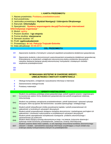 I. KARTA PRZEDMIOTU 1. Nazwa przedmiotu: Podstawy przedsiebiorczości 2. Kod przedmiotu: 3. Jednostka prowadząca: Wydział Nawigacji i Uzbrojenia Okrętowego 4. Kierunek: Informatyka 5. Specjalność: Systemy wspomagania decyzji\Technologie internetowe\ Informatyzacja organizacji * 6. Moduł: ogólny 7. Poziom studiów: I-go stopnia 8. Forma studiów: stacjonarne 9. Semestr studiów: VII 10. Profil: ogólnoakademicki 11. Prowadzący: dr inż. Patrycja Trojczak-Golonka 12. Data aktualizacji: 30-09-2013 CEL PRZEDMIOTU C1 Zapoznanie studenta z formalnymi i prawnymi aspektami prowadzenia działalnosci gospodarczej C2 Zapoznanie studenta z ekonomicznymi uwarunkowaniami prowadzenia działalnosci gospodarczej Wykształcenie w studentach umiejętności ekonomicznej analizy problemów decyzyjnych, nawyków śledzenia bieżącej sytuacji ekonomicznej i korzystania z dostepnych narzedzi wspierania przedsiębiorczosci C3 C4 C5 WYMAGANIA WSTĘPNE W ZAKRESIE WIEDZY, UMIEJĘTNOŚCI I INNYCHY KOMPETENCJI 1 Obsługa komputera, umiejętnośc wyszukiwania informacji w internecie 2 Zaawansowana obsługa Excela 3 Podstawy matematyki 4 EFEKTY KSZTAŁCENIA EK1 Student zna podstawy polskiego prawa gospodarczego, potrafi wyjaśnić prawne i organizacyjne konsewkencje wyboru formy działalności gospodarczej oraz potrafi przygotować właściwą dokumentację EK2 Student zna podstawy zarządzania przedsiebiorstwem, potrafi dyskutować i opisywać sytuacje decyzyjne, które są typowe dla kierownictwa szczebla operacyjnego i strategicznego EK3 EK4 EK5 EK6 EK7 Student potrafi sklasyfikować źródła pozyskiwania kapitału i potrafi przeanalizować ich opłacalność w konkretnych sytuacjach decyzyjnych Student potrafi przeanalizować dostępne narzędzia ekonomiczne i marketingowe pod kątem ich opłacalności i mozliwości wykorzystania w przykładowych sytuacjach decyzyjnych Student potrafi zaprojektować kompleksowe rozwiązanie problemu ekonomicznego i zaprezentować go publicznie Student śledzi bieżącą sytuację ekonomiczną w kraju i na świecie, krytycznie obserwuje i dyskutuje model biznesowy przedsiębiorstw, zwlaszcza z branży informatycznej Student uważnie śledzi treści wykładu, w celu lepszego zrozumienia kontekstu ekonomicznego zdarzeń i i działań, samodzielnie wyszukuje informacje uzupełniające z innych źródeł oraz analizuje zasady funkcjonowania znanych mu przedsiębiorstw EK8 Aktywnie uczestniczy w zajęciach laboratoryjnych, rozwiązuje problemy decyzyjne o charakterze ekonomicznym, dzieli się z grupą własnymi obserwacjami z otoczenia ekonomicznego kraju, rozumie procesy ewolucji zjawisk gospodarczych i konieczność ciągłego nadązania za zmieniajacymi się warunkami ekonomicznymi EK9 Potrafi podejmować zadania długofalowe, dokonywać i przestrzegać ustaleń organizacyjnych, przejmować wyznaczone mu role w zespołach. STRUKTURA PRZEDMIOTU EK1 EK2 EK3 EK4 EK5 EK6 EK7 EK8 EK9 Forma zajęćwykłady Liczba godzin Forma zajęććwiczenia W1 W2 W3 1 1 1 … … … … W1, W3 W1,W2,W3 1 1 Suma godzin Liczba godzin 5 Forma zajęćlaboratoria Liczba godzin L1 L2, L3 L2, L3 L4, L5 L2, L5 L2, L3, L5 1 2 2 2 2 2 L3, L4, L6 L1, L2, L5 2 2 0 15 TREŚCI PROGRAMOWE W1 Formalna i prawna organizacja przedsiebiorstwa W2 Elementy rachunkowości i ekonomicznego rachunku opłacalności W3 Źródła pozyskania kapitału L1 Dokumentacja założycielska spółki L2 L3 L4 L5 L6 Projekt działalności franczyzowej Podstawy analizy fundamentalnej Analiza opłacalności podstawowych decyzji operacyjnych Plan marketingowy dla wybranych produktów/towarów/usług branży informatycznej Kalkulacja wariantów zatrudnienia NARZĘDZIA DYDAKTYCZNE 1 2 3 4 5 Notebook z projektorem Tablica i kolorowe pisaki Oprogramowanie Microsoft Office Własny laptop Portale, programy i prasa ekonomiczna SPOSOBY OCENY (F-FORMUJĄCA, P-PODSUMOWUJĄCA) P1 F1 F2 F3 F4 Test pytania otwarte o charakterze problemowym (waga 100%) EK1-EK4, EK8 Przygotowanie planu marketingowego - prezentacja EK4, EK8, EK9 Przygotowanie i prezentacja projektu działalności franchisingowej - prezentacja EK2, EK8 Przygotowanie dokumentacji założycielskiej - obserwacja pracy własnej EK1,EK7, EK8 Dyskusja studium przypadków, obserwacja EK2-EK9 OBCIĄŻENIE PRACĄ STUDENTA Forma aktywności Średnia liczba godzin na zrealizowanie aktywności semestr VII Godziny kontaktowe z nauczycielem 22 Przygotowanie się do wykładów i laboratoium 6 Samodzielne opracowanie zagadnień projektowych 6 Czytanie prasy ekonomicznej i oglądanie programów ekonomicznych 12 razem 22 6 6 12 SUMA GODZIN W SEMESTRZE 46 r.a 46 PUNKTY ECTS W SEMESTRZE 2 r.a 2 LITERATURA PODSTAWOWA I UZUPEŁNIAJACĄ Podstawy przedsiębiorczości : ćwiczenia - Jacek Musiałkiewicz 1 Podstawy ekonomii - red. nauk. Roman Milewski Eugeniusz Kwiatkowski 2 Analiza ekonomiczna przedsiebiorstwa – Lech Bednarski 3 Finanse przedsiębiorstwa. Przykłady i zadania. – Aurelia Bielawska 4 5 H. Berkley, Marketing internetowy w małej firmie 6 Portale ekonomiczne: money.pl, gospodarka.gazeta.pl, itd.. 7 Czasopismo "Własny biznes. Franchising" PROWADZĄCY PRZEDMIOT (IMIĘ, NAZWISKO, ADRES E-MAIL) 1 Patrycja Trojczak-Golonka [email protected]
